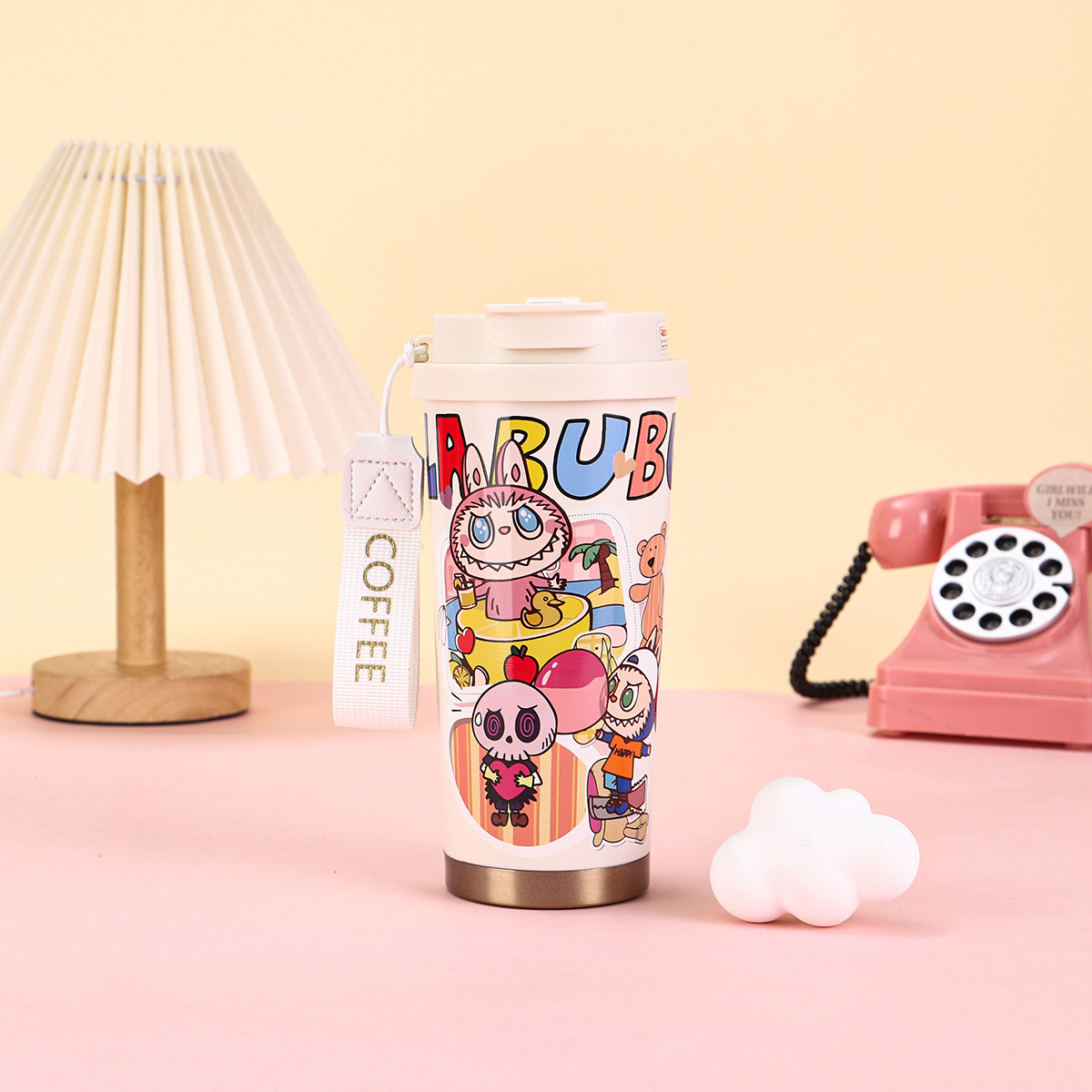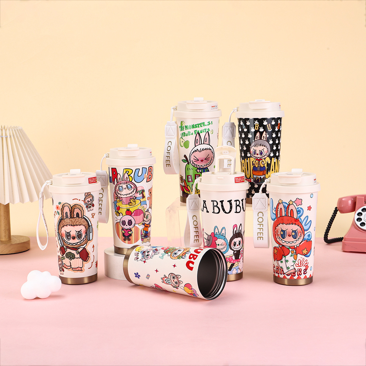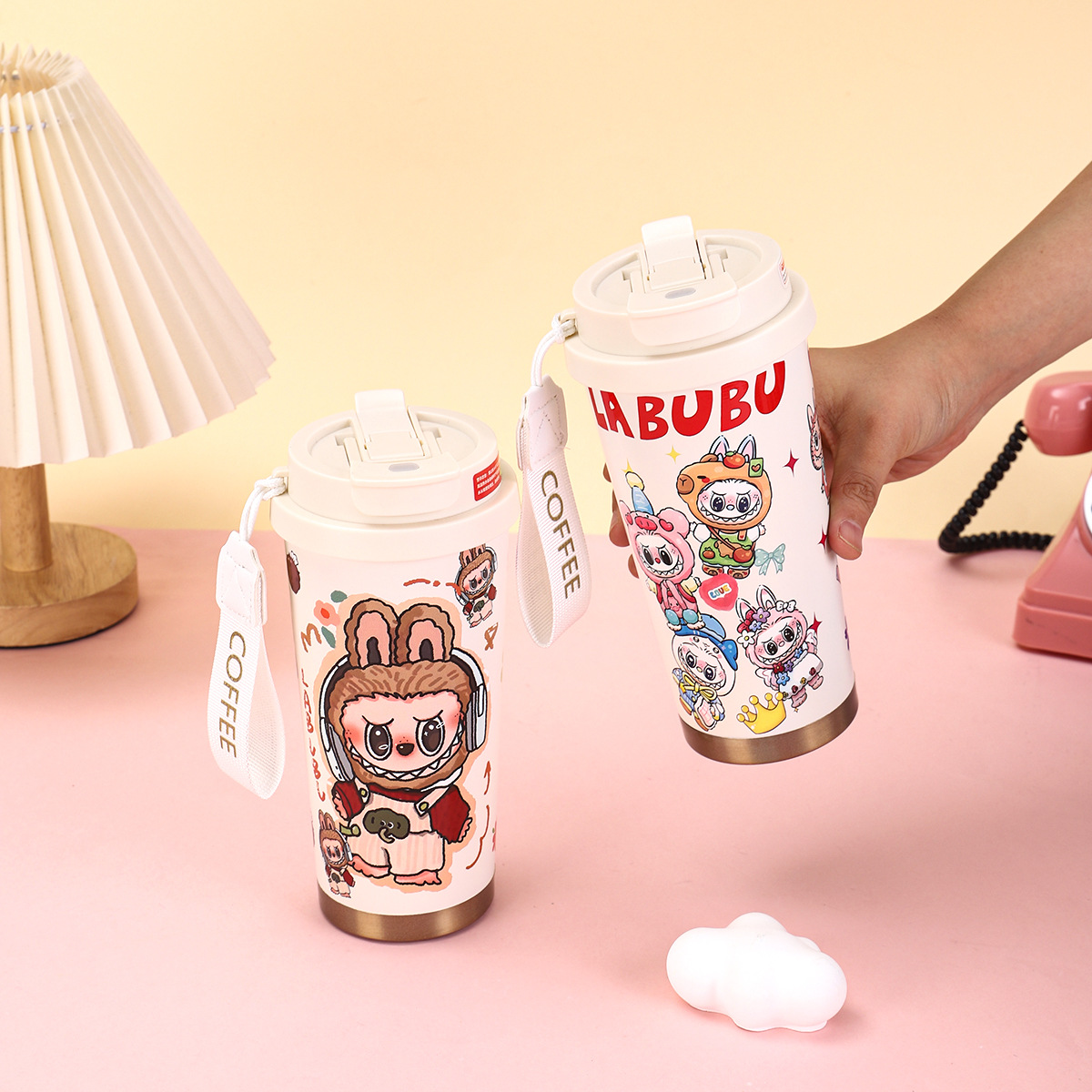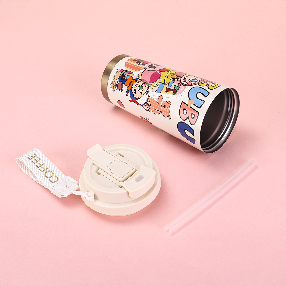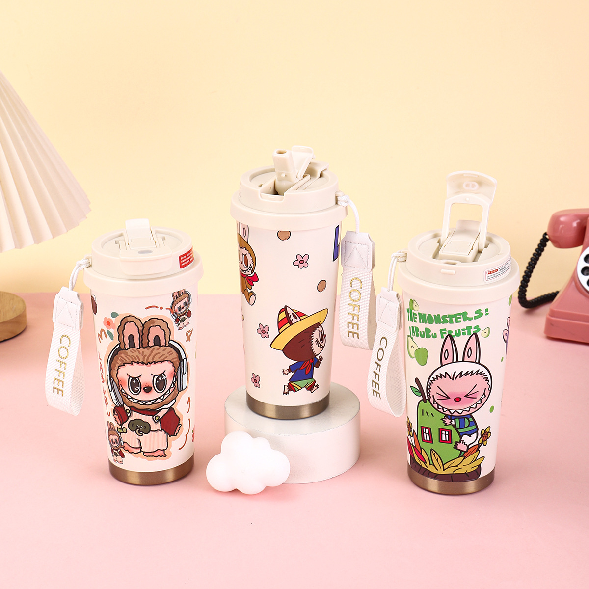 2025년형 크로스보더 316 스테인리스 컵, 고급스러운 디자인의 보온병, 라부부 패턴 3D 이중 빨대 커피컵