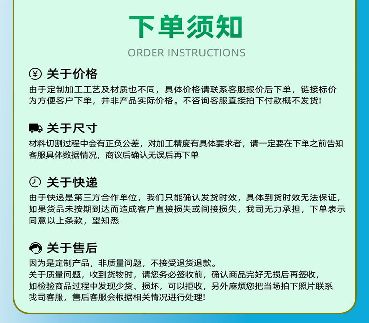 5、定制型产品交货后,非品质问题,不支持退换货。