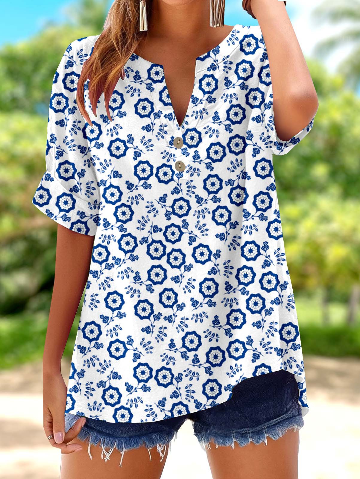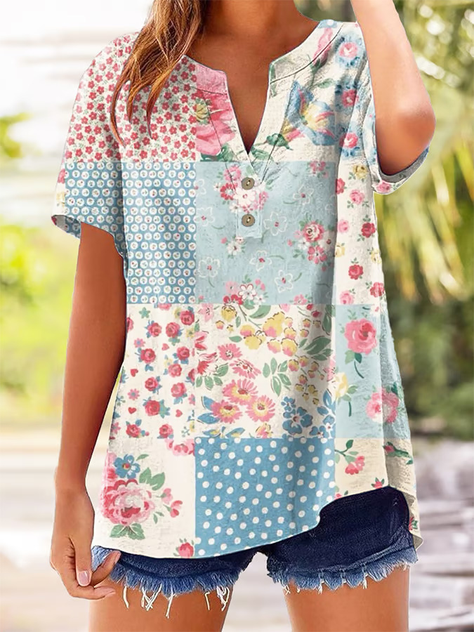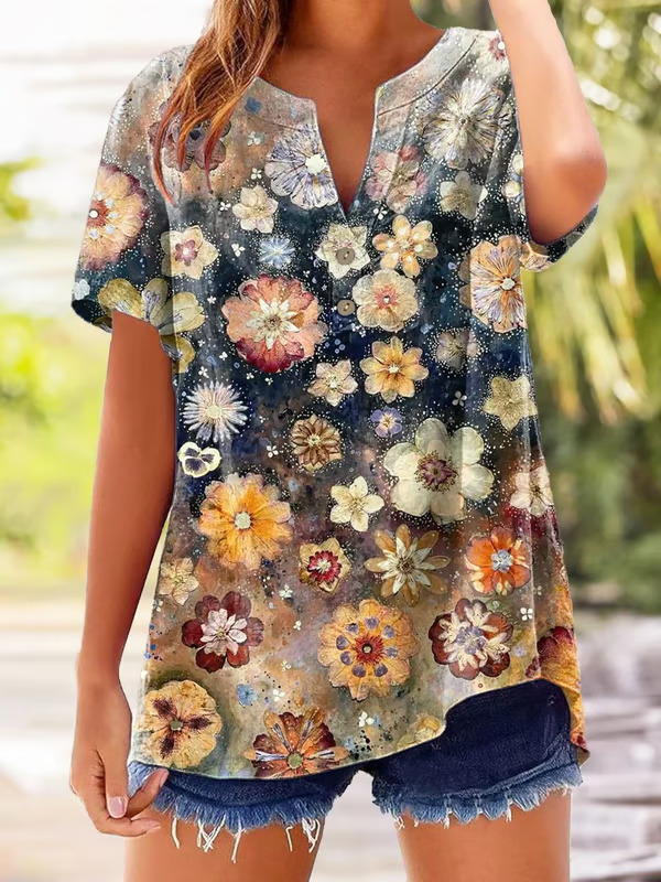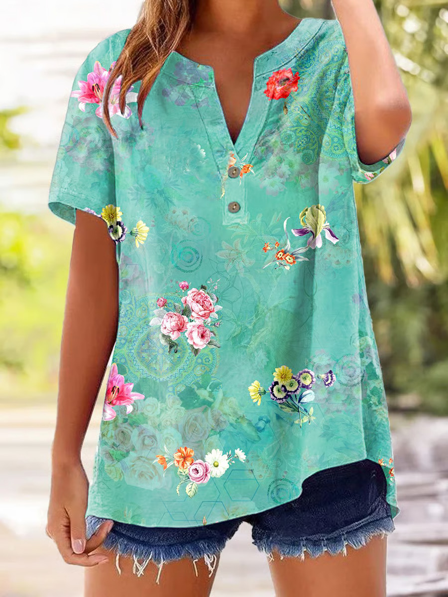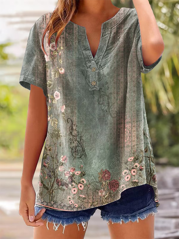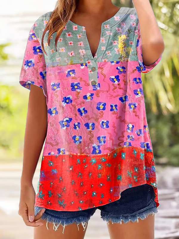 아마존 루즈 셔츠 캐주얼 반팔 여성 여름 프린트 V 넥 풀오버 25 년 유럽과 미국의 국경 간 새로운 스타일스토어 가기