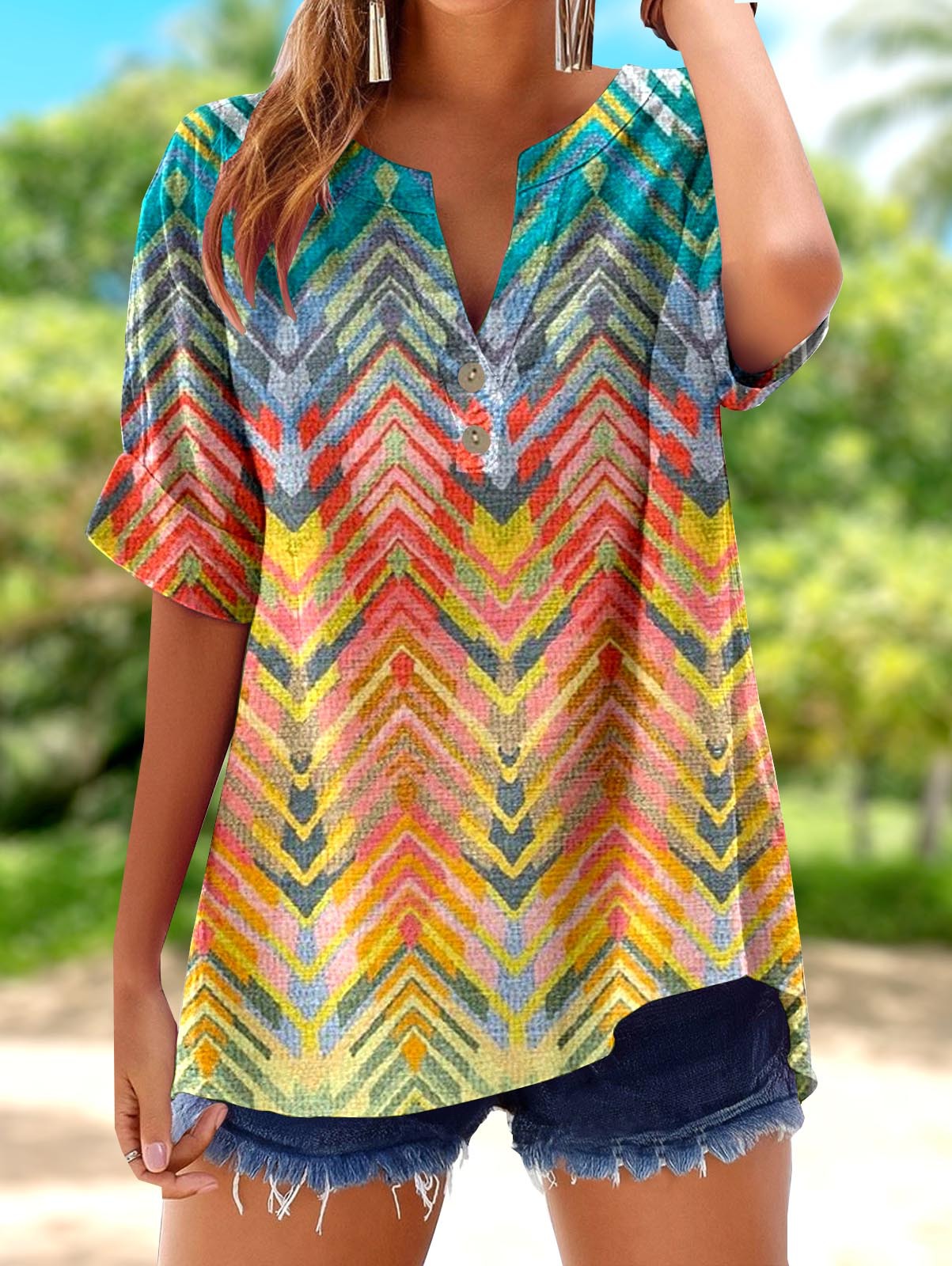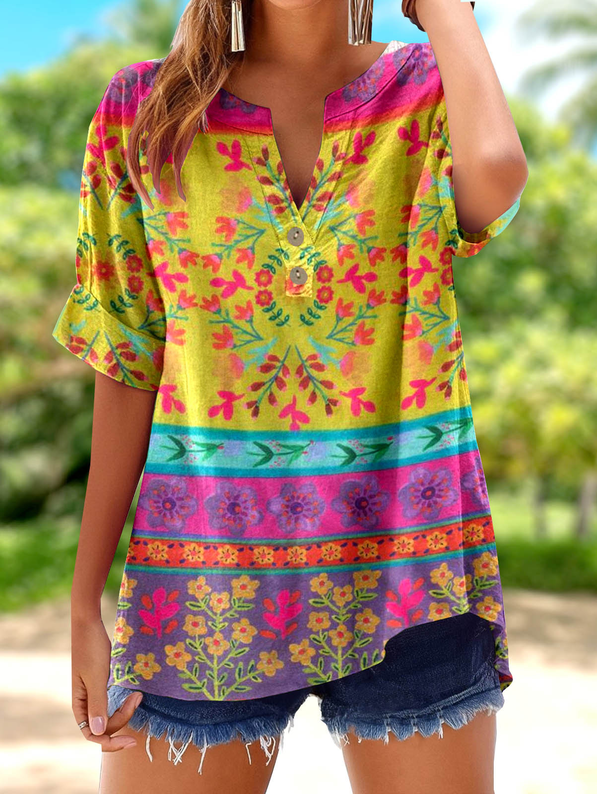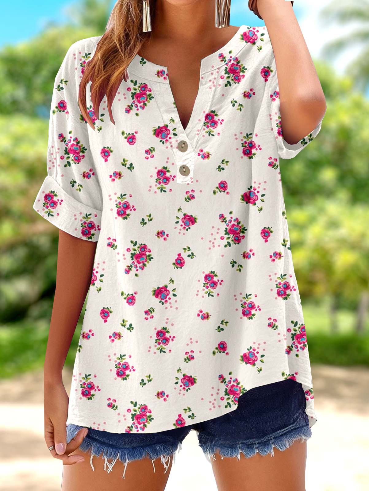 아마존 루즈 셔츠 캐주얼 반팔 여성 여름 프린트 V 넥 풀오버 25 년 유럽과 미국의 국경 간 새로운 스타일스토어 가기