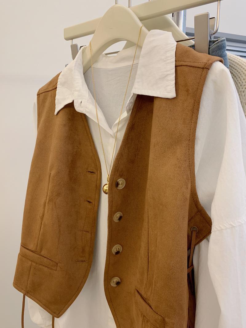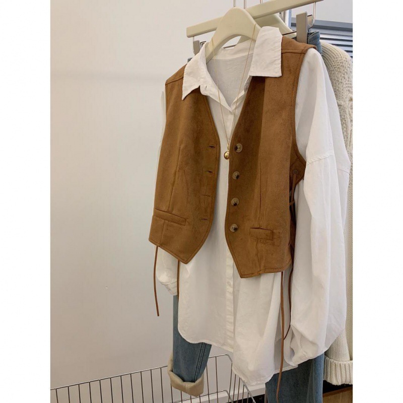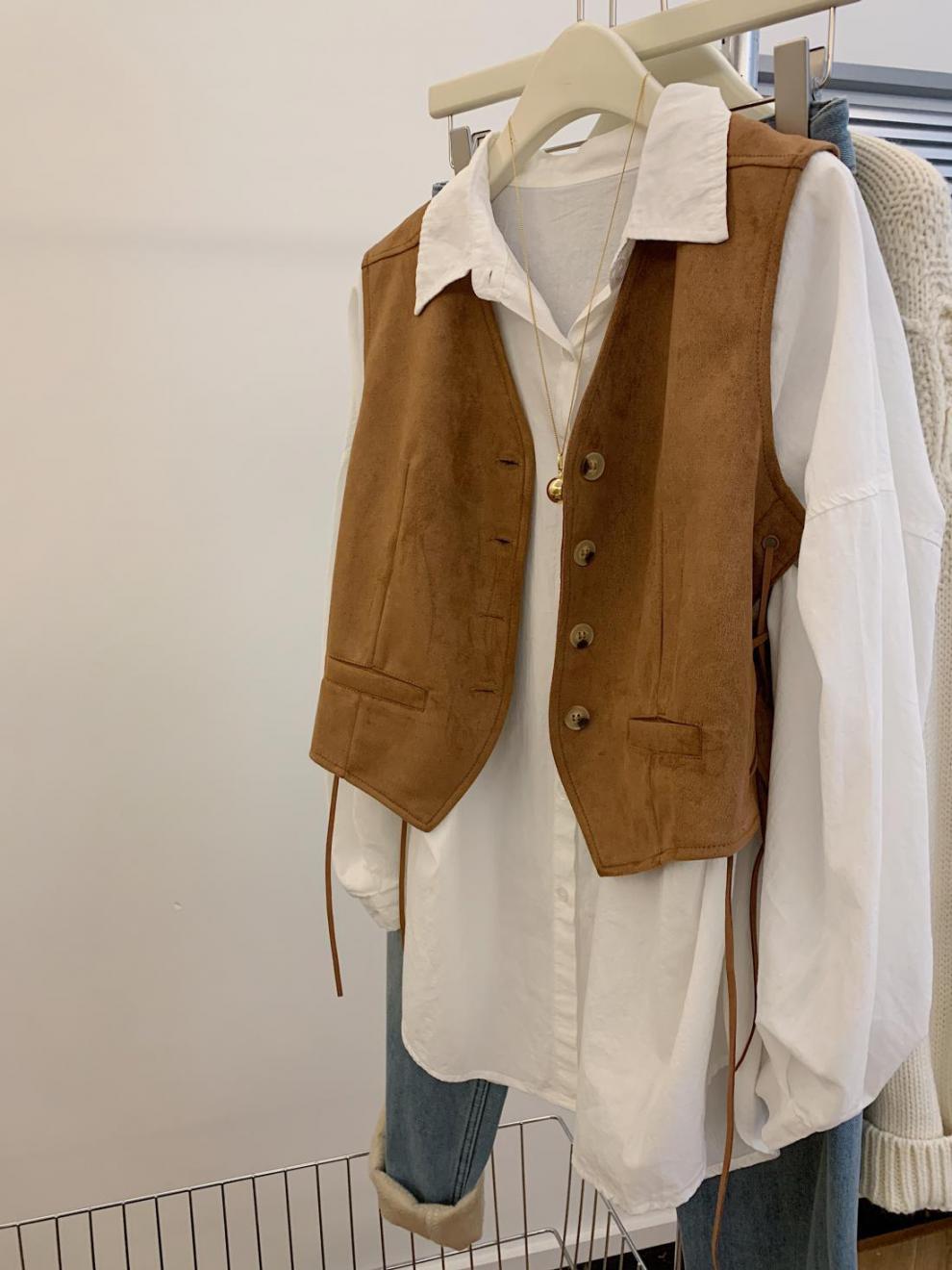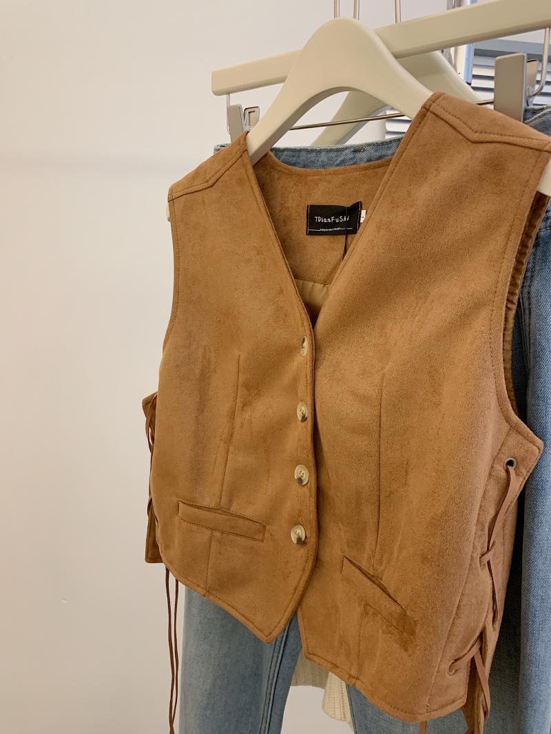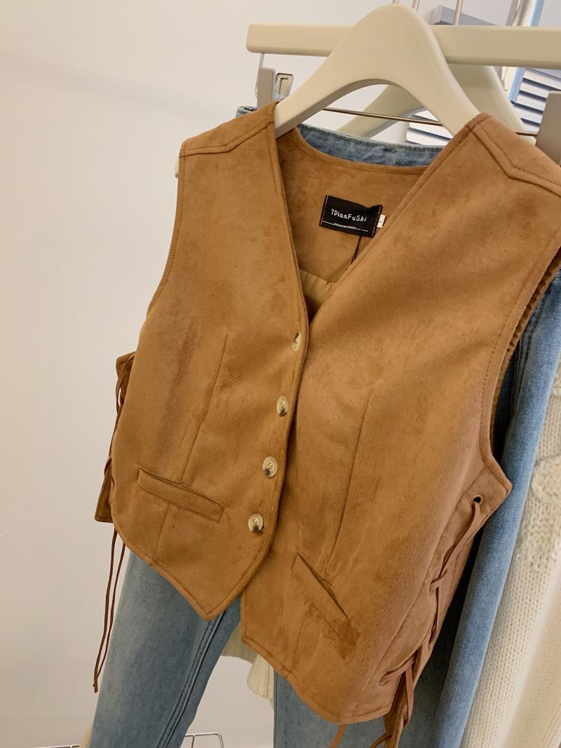 메일라드 스타일 레이스 업 스웨이드 조끼 여성 가을 디자인 틈새 캐주얼 짧은 칼라 조끼스토어 가기