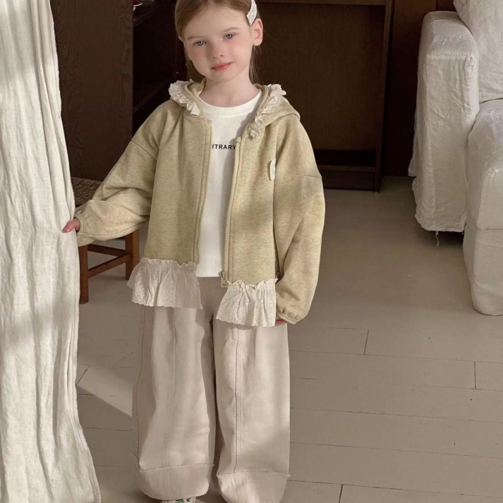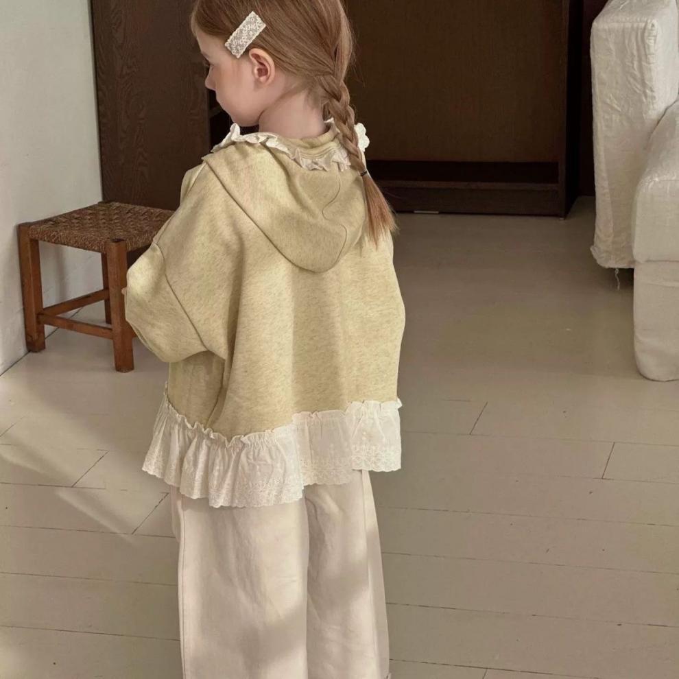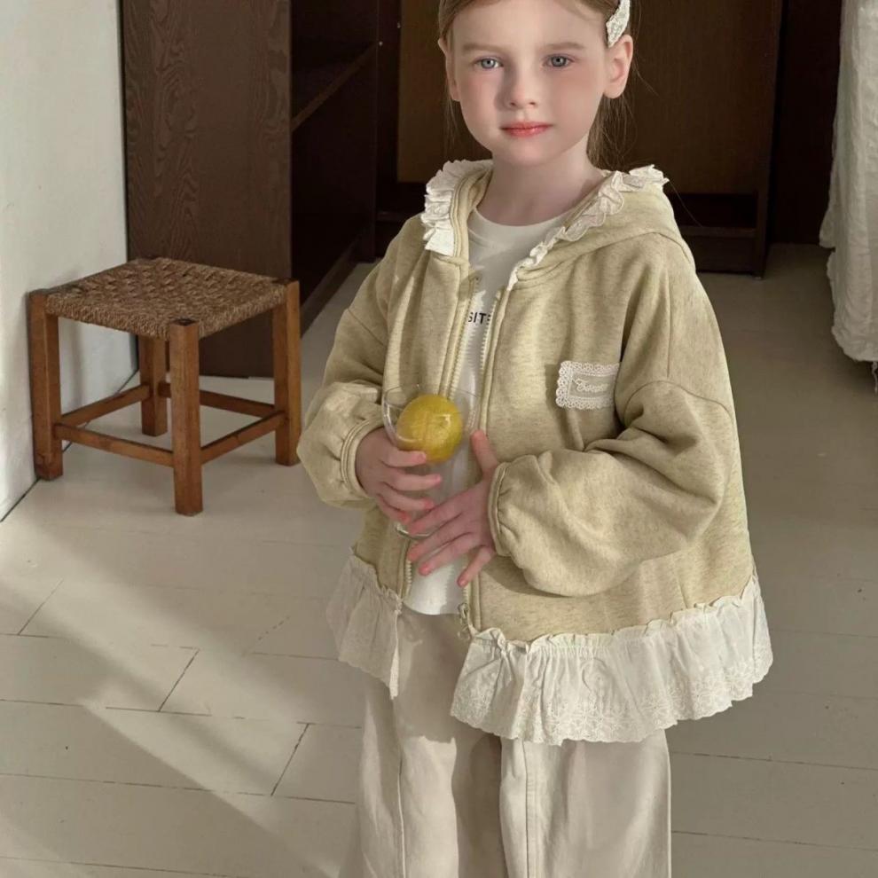 여자를위한 레이스 후드 자켓 레트로 카디건 탑 봄 2025 새로운 한국 스타일 아기 소녀 스플 라이스 지퍼 셔츠스토어 가기