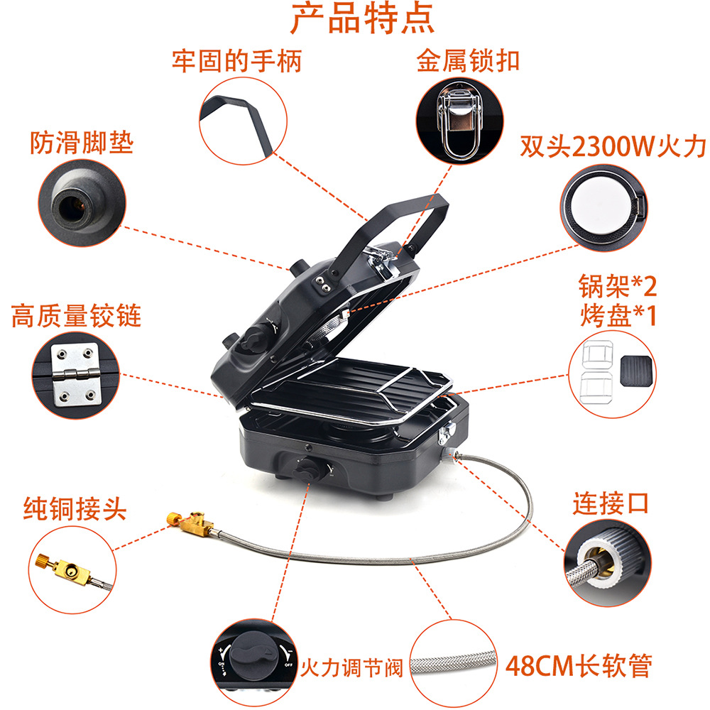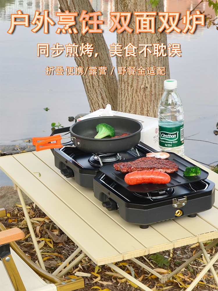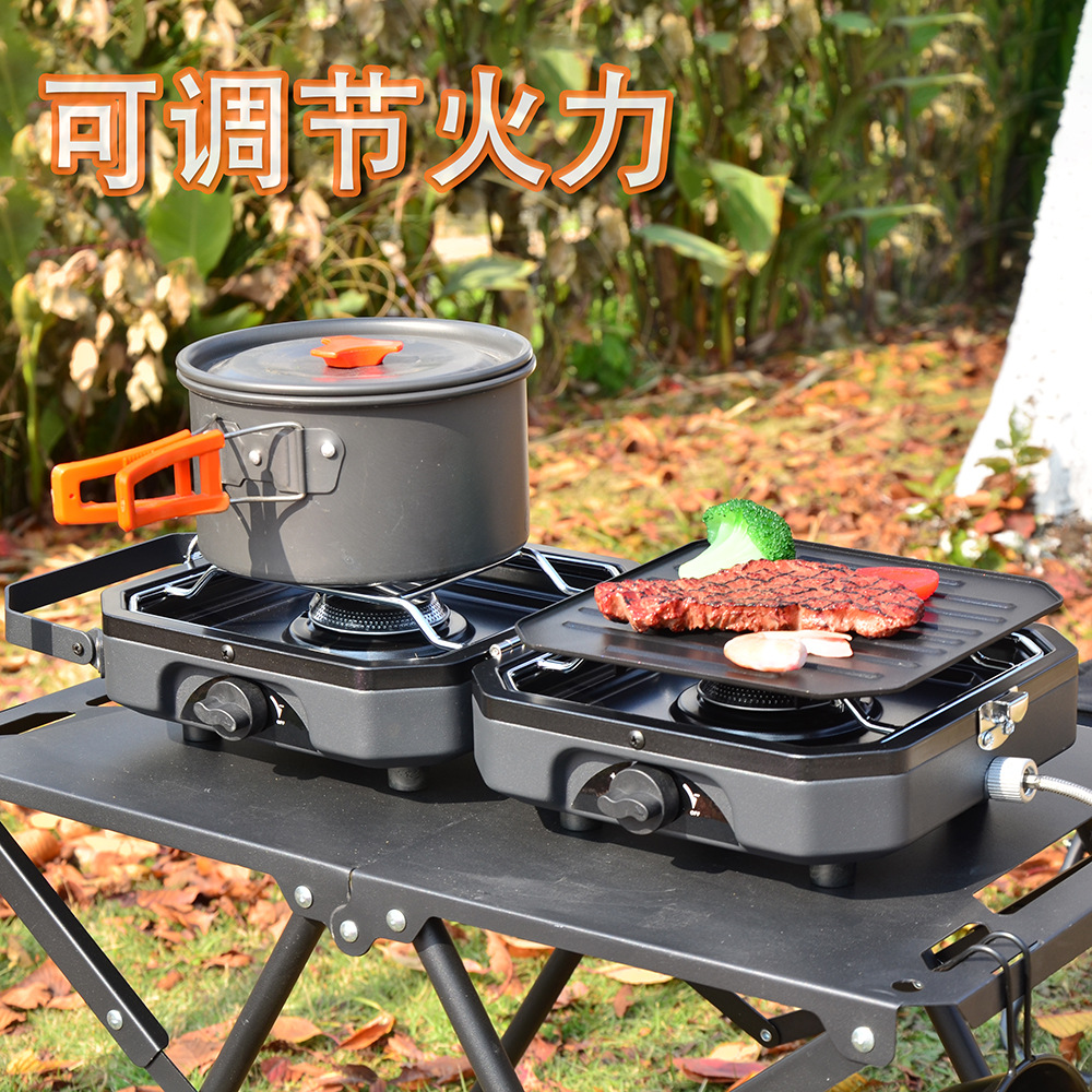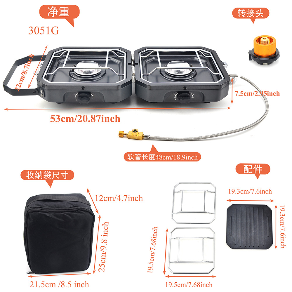 1.Item name: Protable Dual Gas Stove 2.Foldable design, saving more space 3.Simple & safe automatic piezo electric ignition