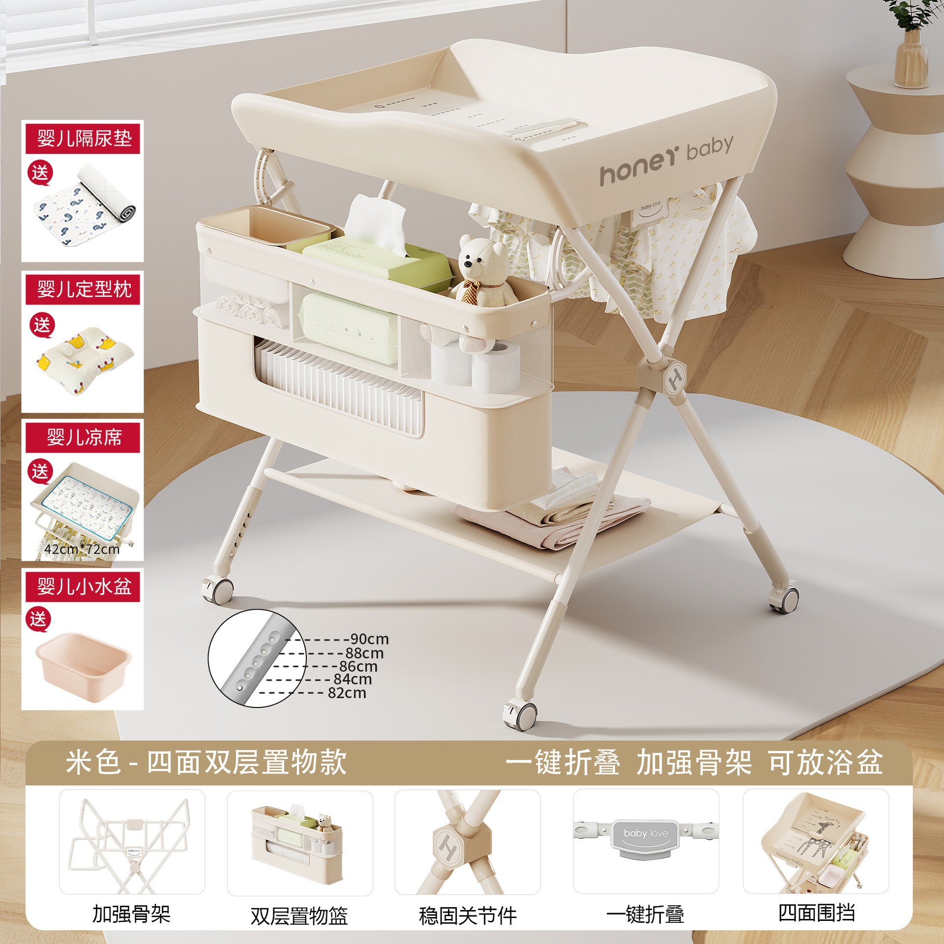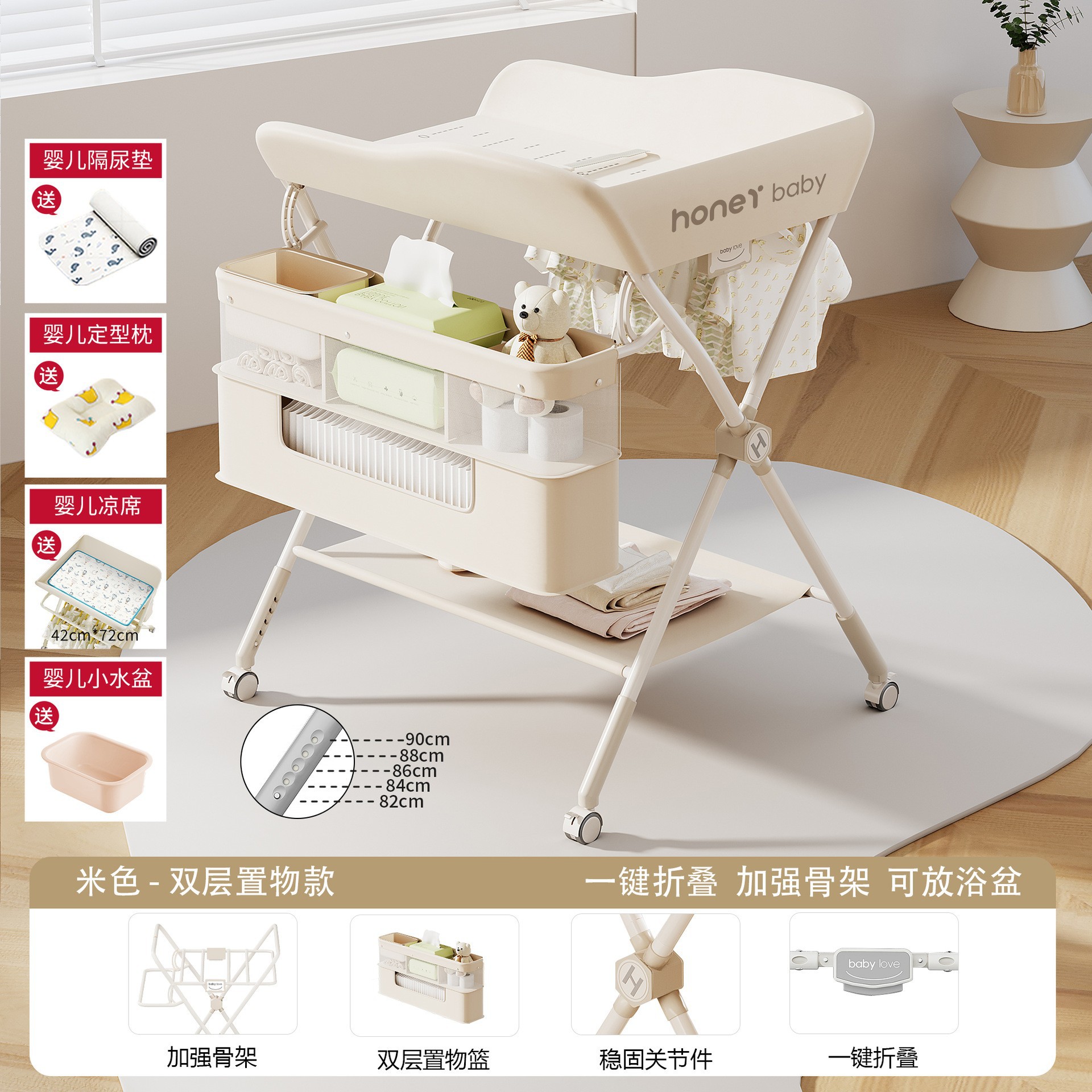 • KT-A.베이지 [이중수납바구니] 5단 리프트 + 매트 + 기저귀패드 + 모양베개 + 작은 세면대