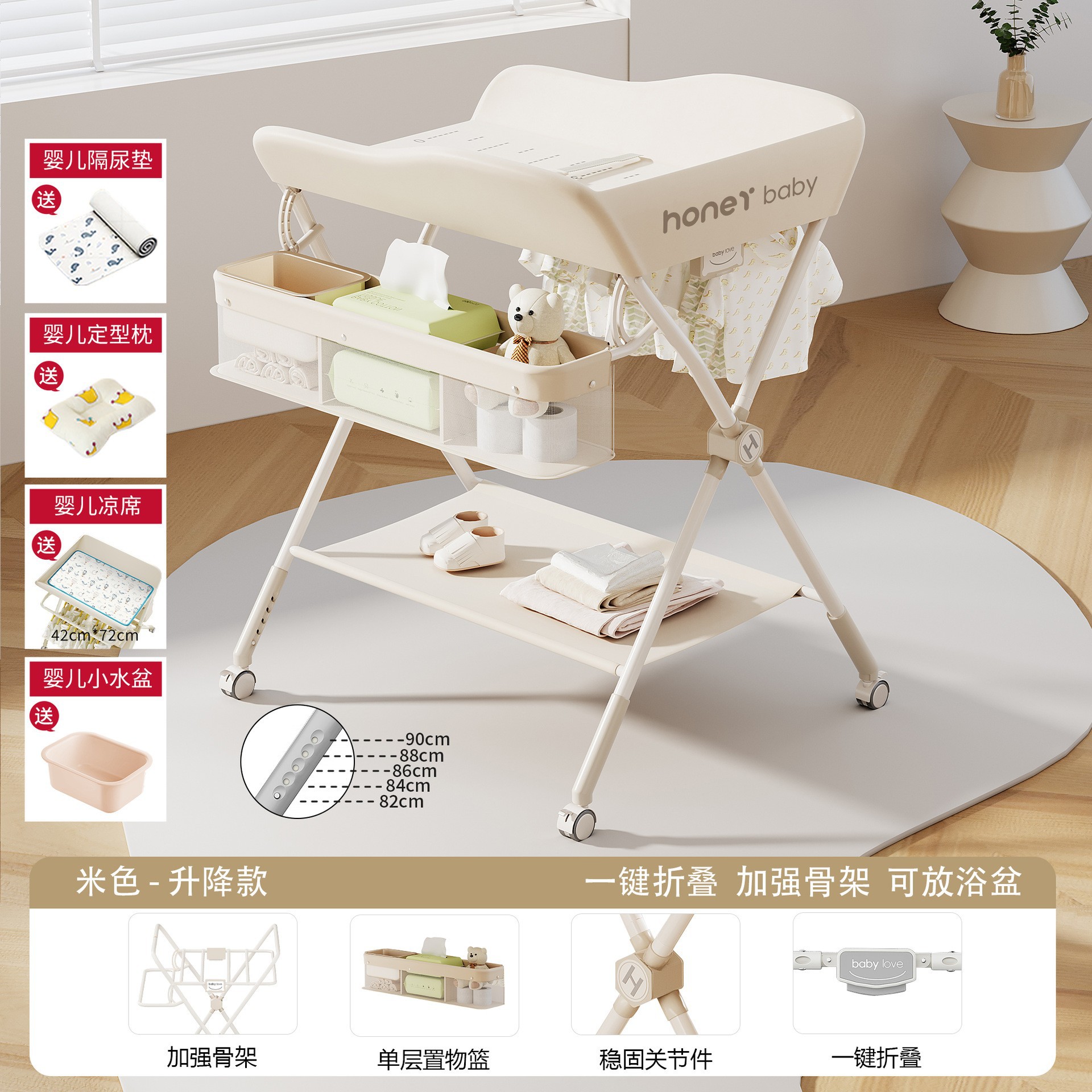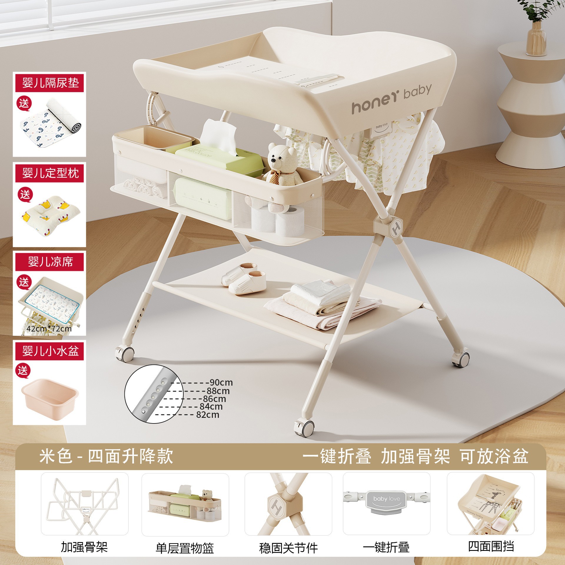 • KT-A. 베이지 [리프팅모델] 5단 리프트 + 매트 + 기저귀패드 + 모양베개 + 작은 세면대