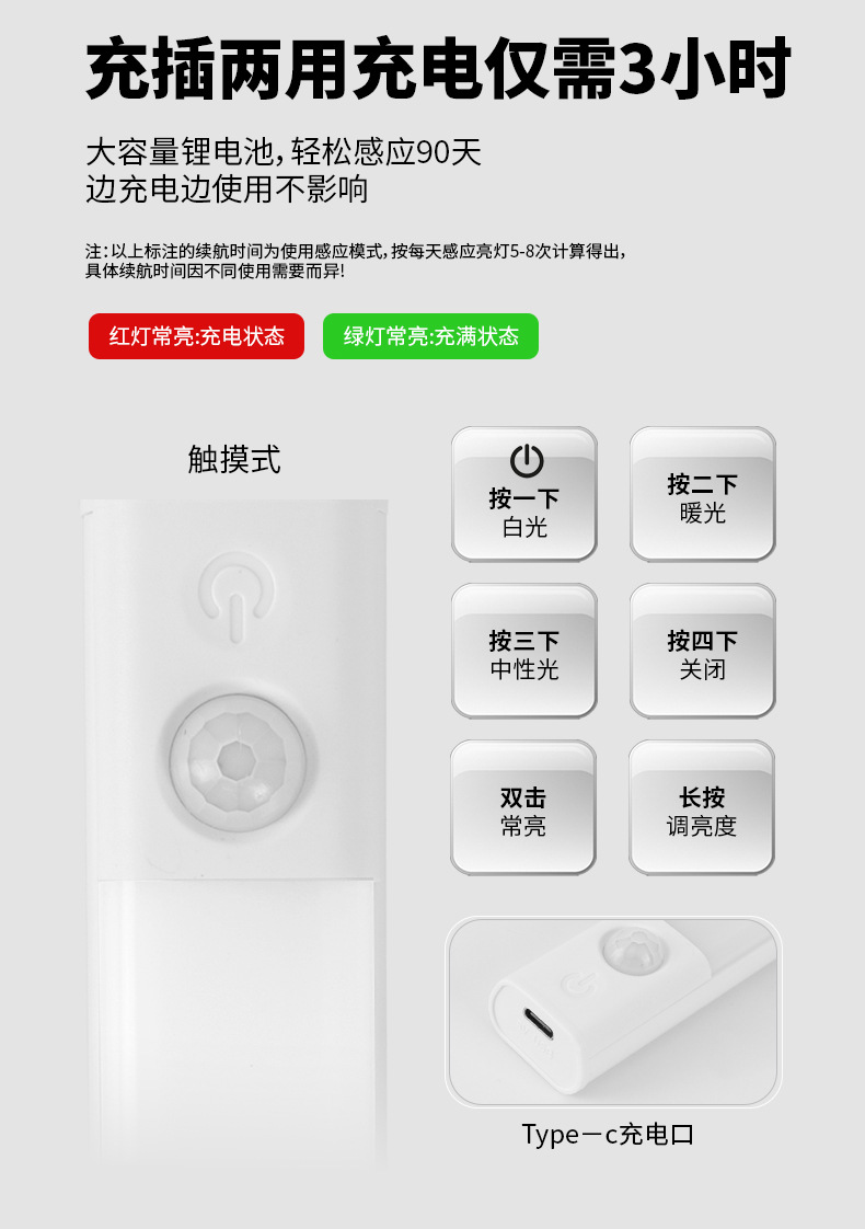 • 10cm 버튼식 백색광 센서 + 충전 + 상시 점등 + 무단계 밝기 조절