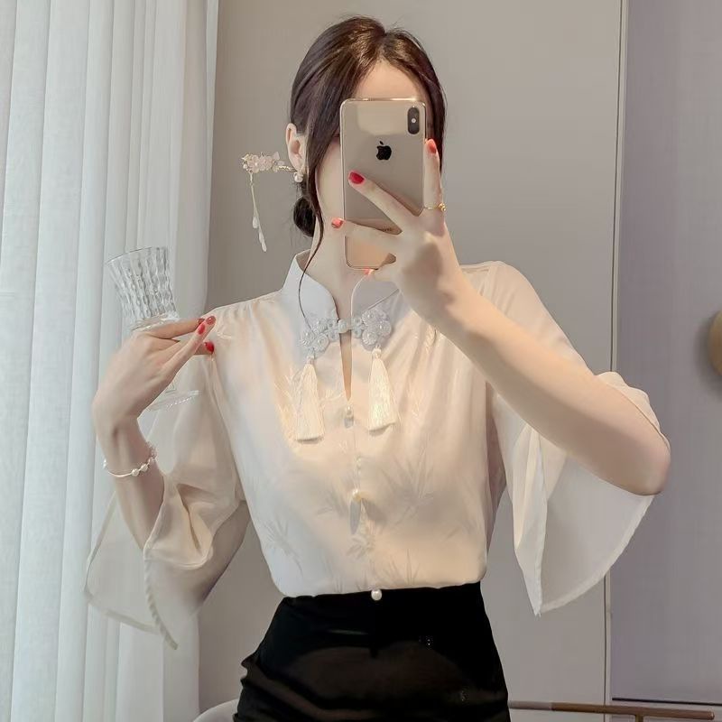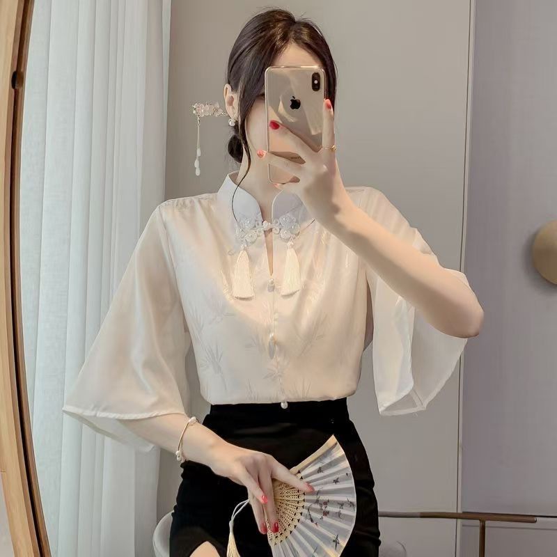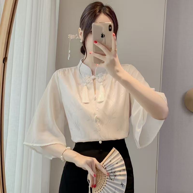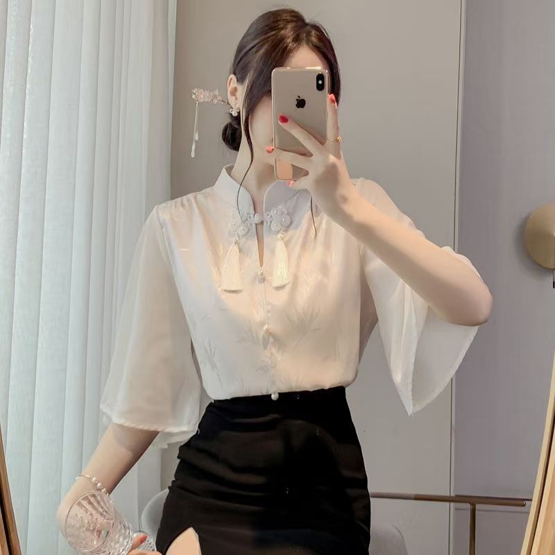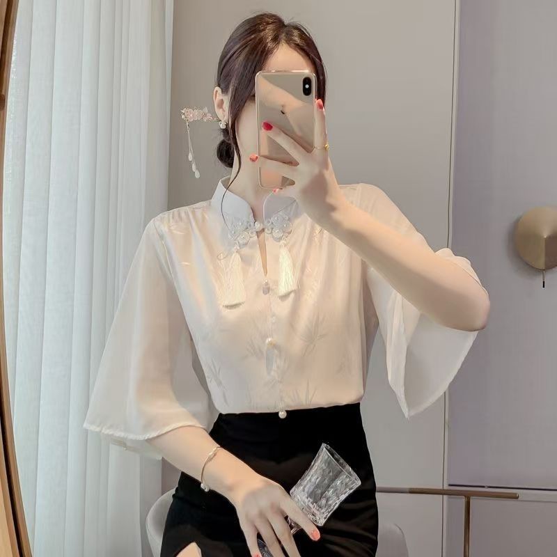 플러스 사이즈 여성을위한 새로운 중국 스타일의 가벼운 중국 스타일 반팔 셔츠 새로운 2025 여름 슬리밍 배 커버 쉬폰 아름다운 탑