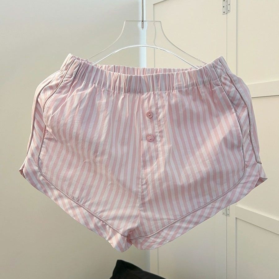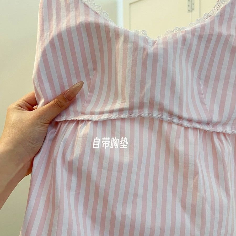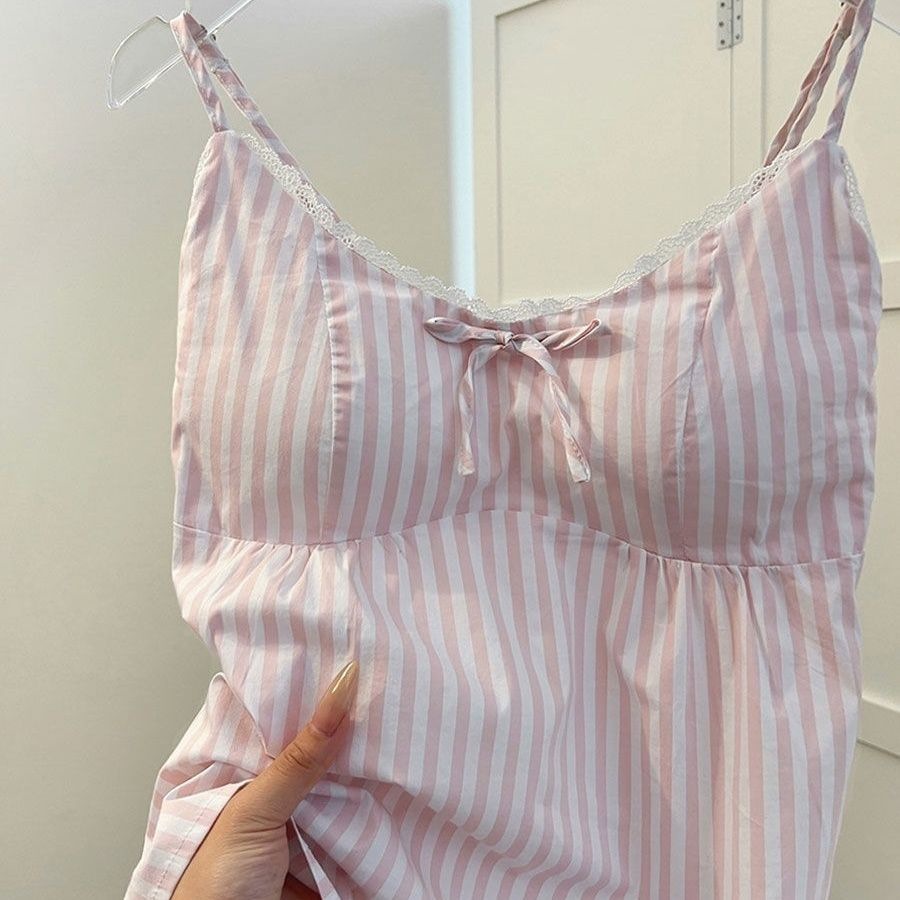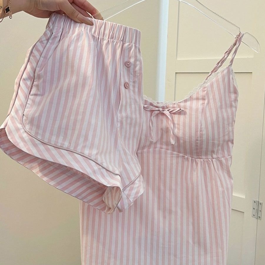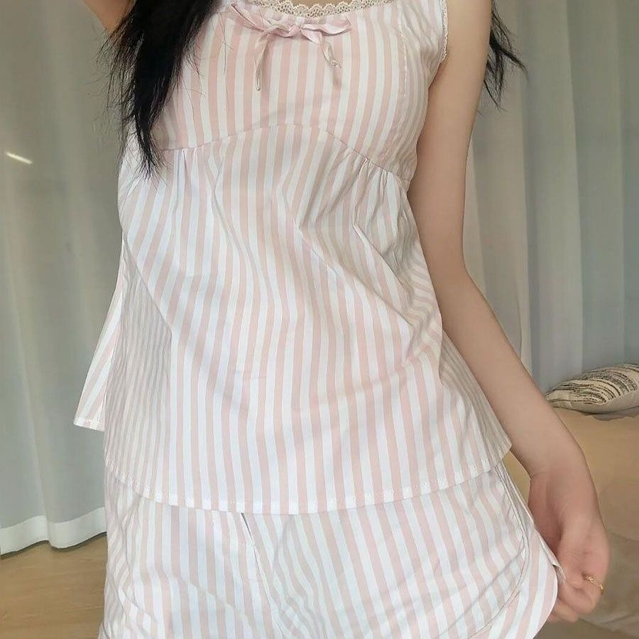 여름 한국 스타일 스트라이프 보우 민소매 반바지 홈웨어 세트 여성용 가슴 패드가 있는 달콤한 소녀 슬립 잠옷스토어 가기