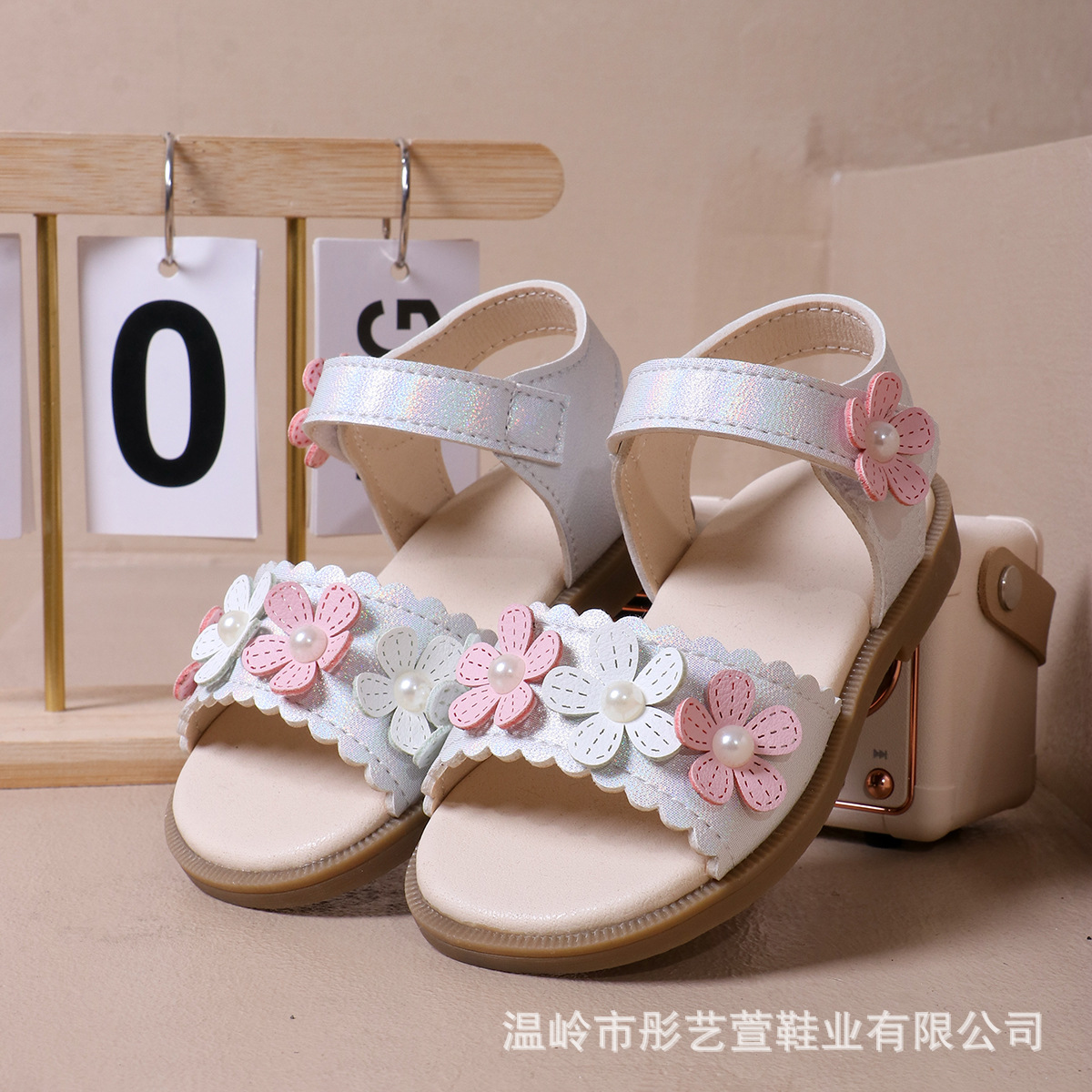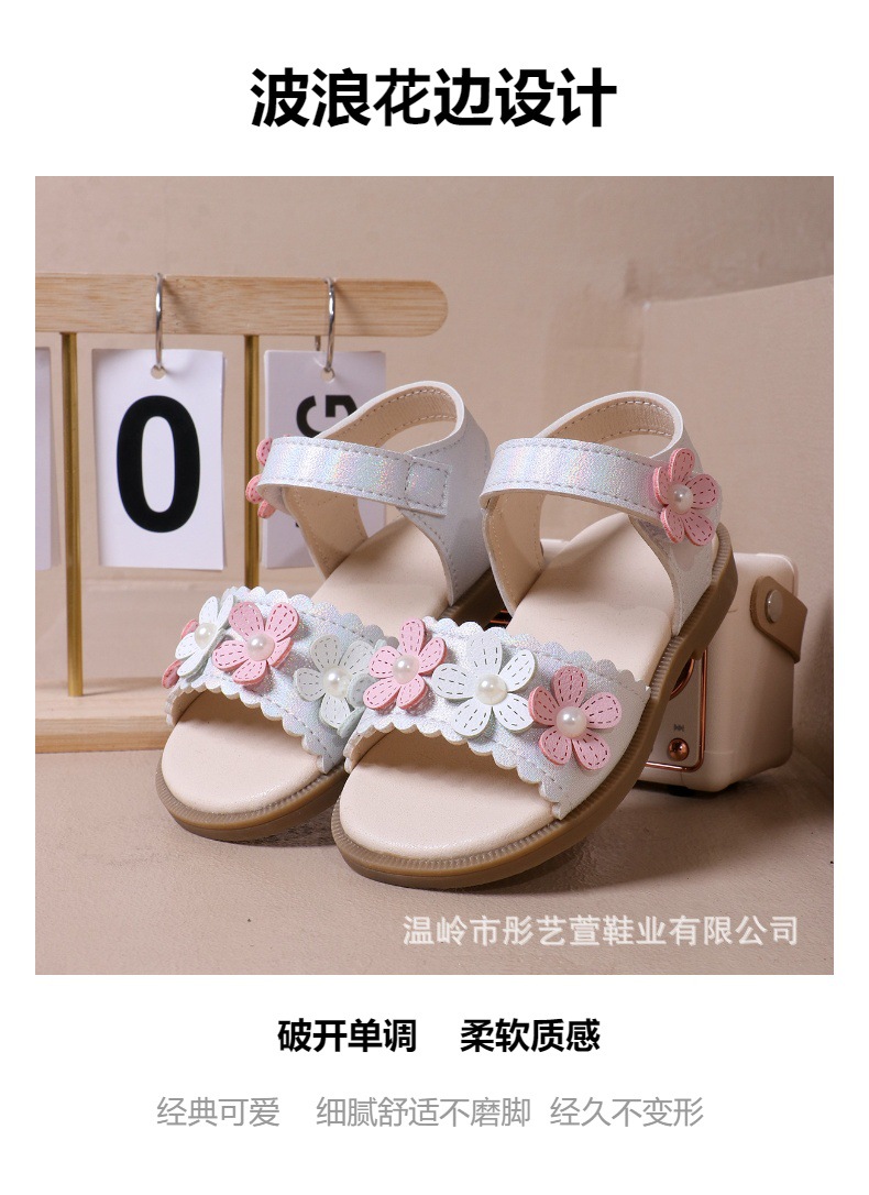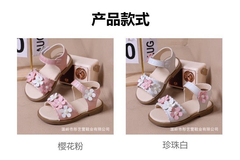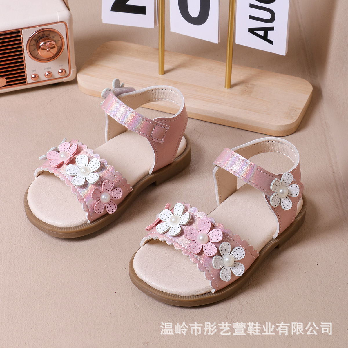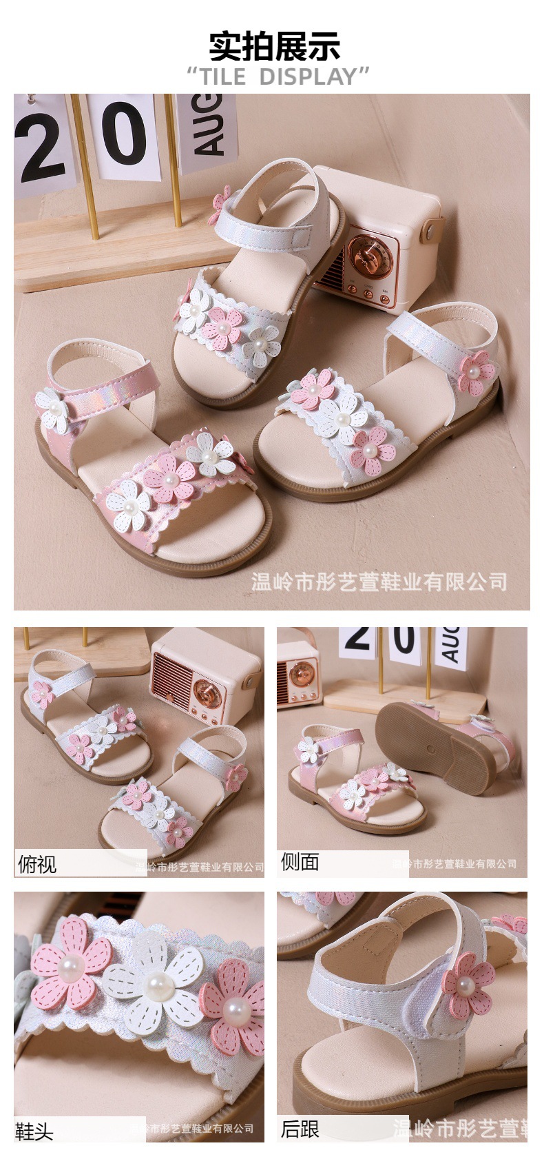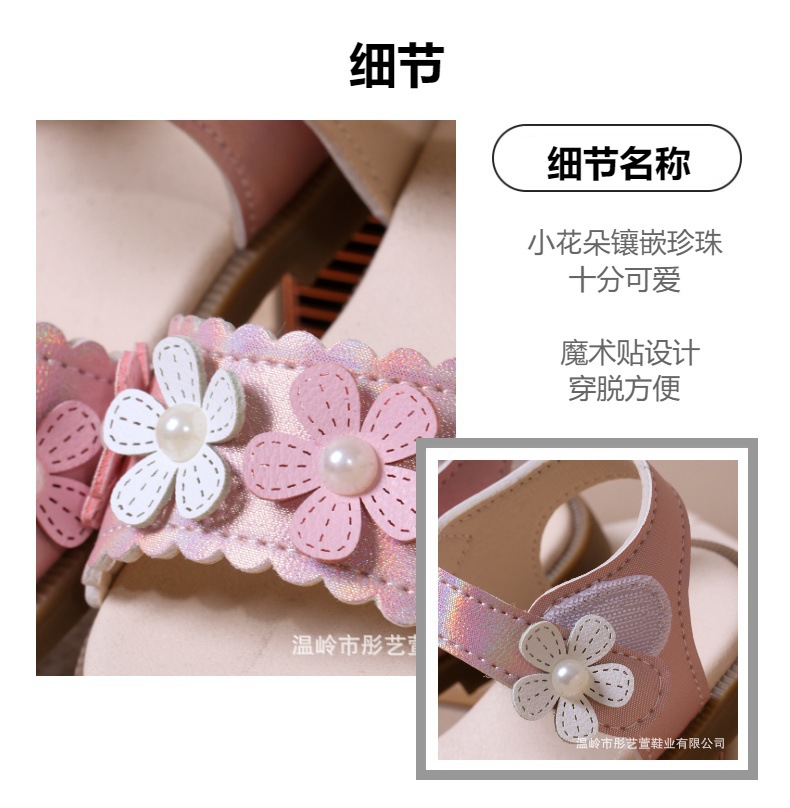 아기 소녀 신발 샌들 스타일 밝은 색상은 분홍색 흰색 꽃 부분 꽃 중앙 상감 진주로 장식되어 있습니다.스토어 가기