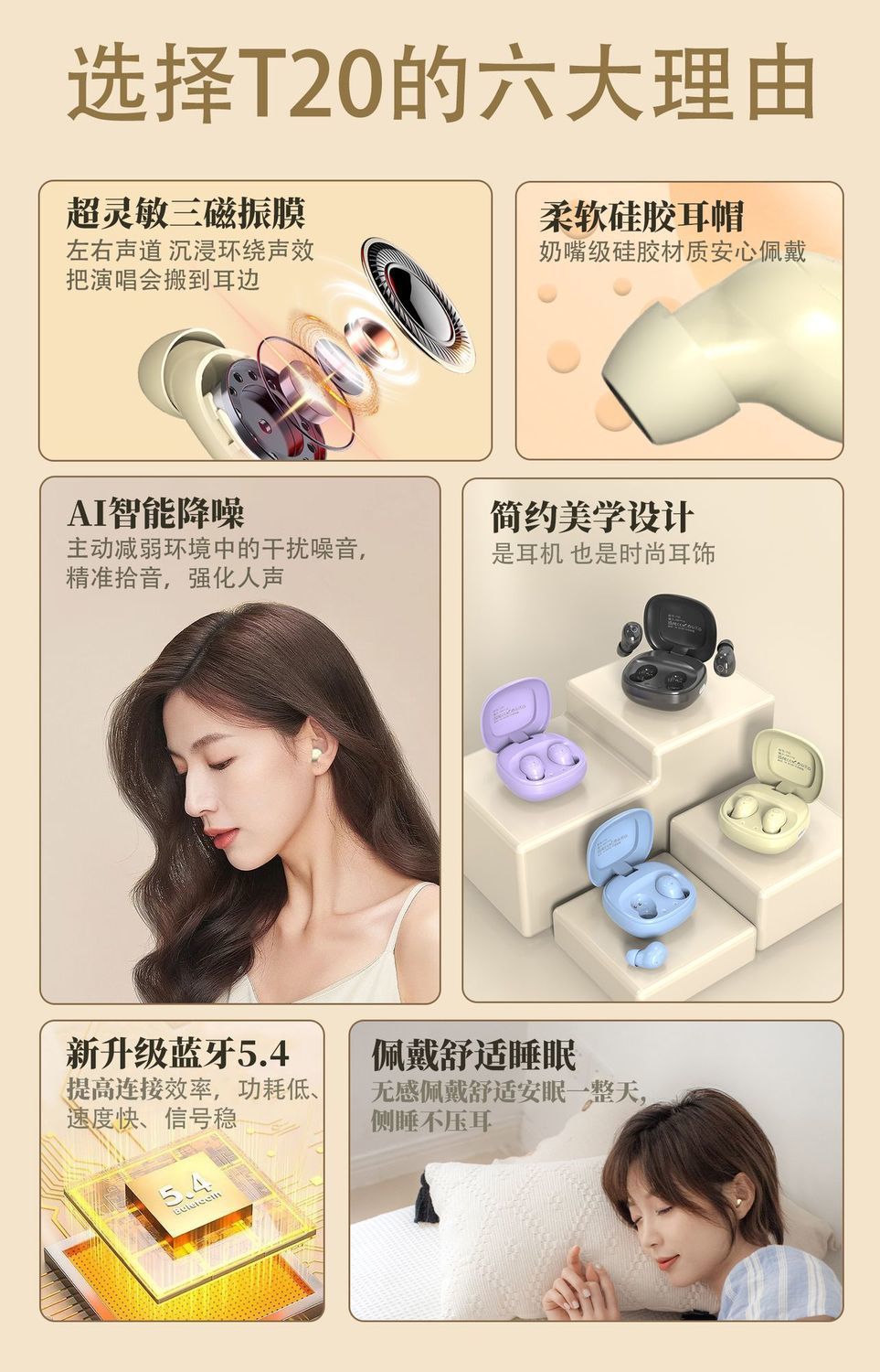 T20 수면 블루투스 헤드셋 인이어 미니 초장기 배터리 수명 바이노럴 소음 감소 보이지 않는 무압력 귀 착용
