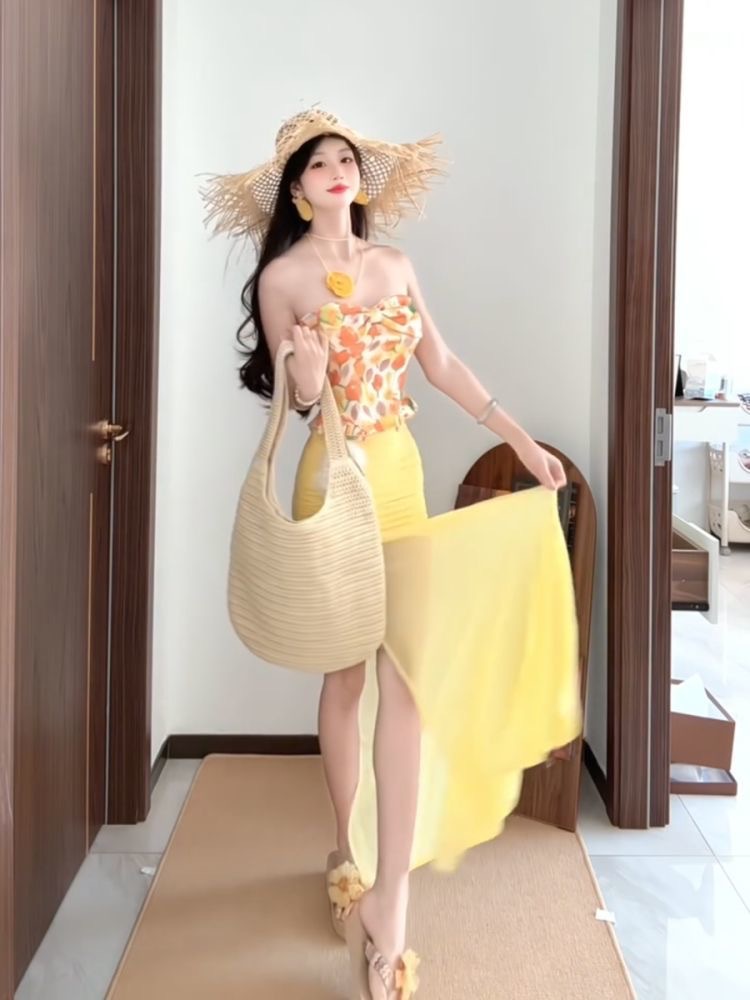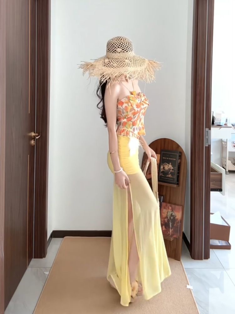 여성을 위한 리조트 스타일 슈트, 여름 도파민, 아름다운 기질, 노란색 프린트 튜브탑, 메쉬 힙 스커트스토어 가기