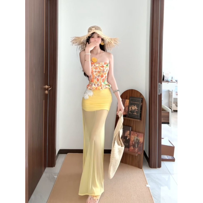여성을 위한 리조트 스타일 슈트, 여름 도파민, 아름다운 기질, 노란색 프린트 튜브탑, 메쉬 힙 스커트