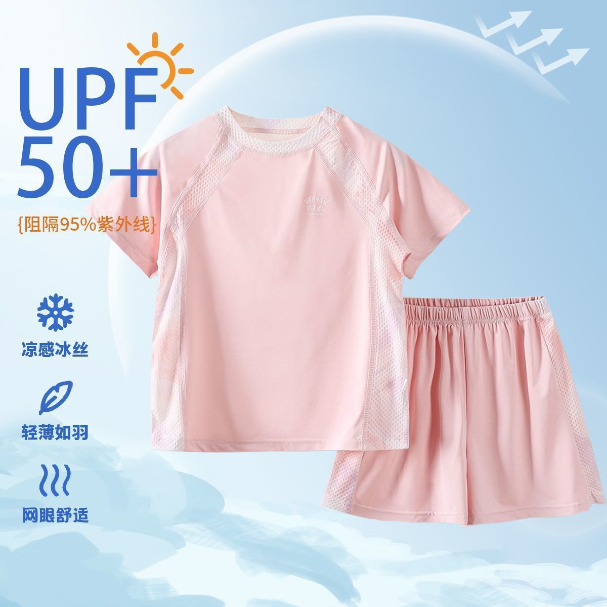 어린이 여름 스포츠 속건성 양복 태양 보호 반팔 반바지 세트 UPF50 + 얼음 느낌 반팔 양복 야외