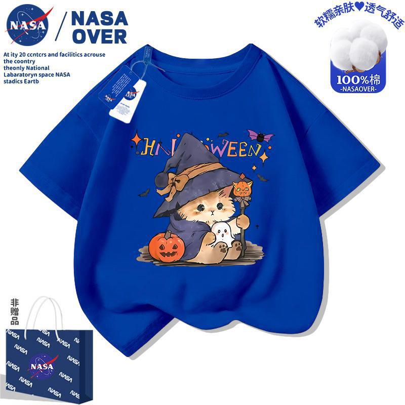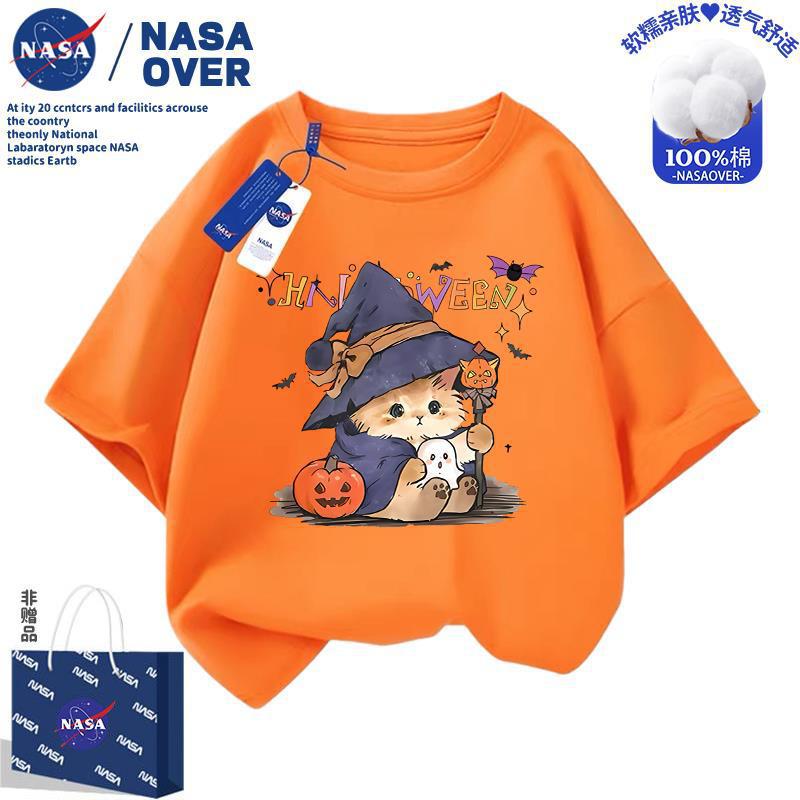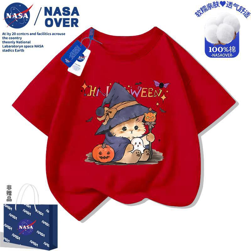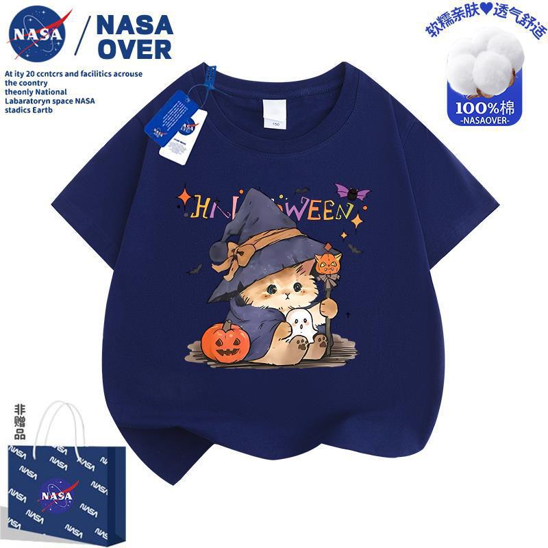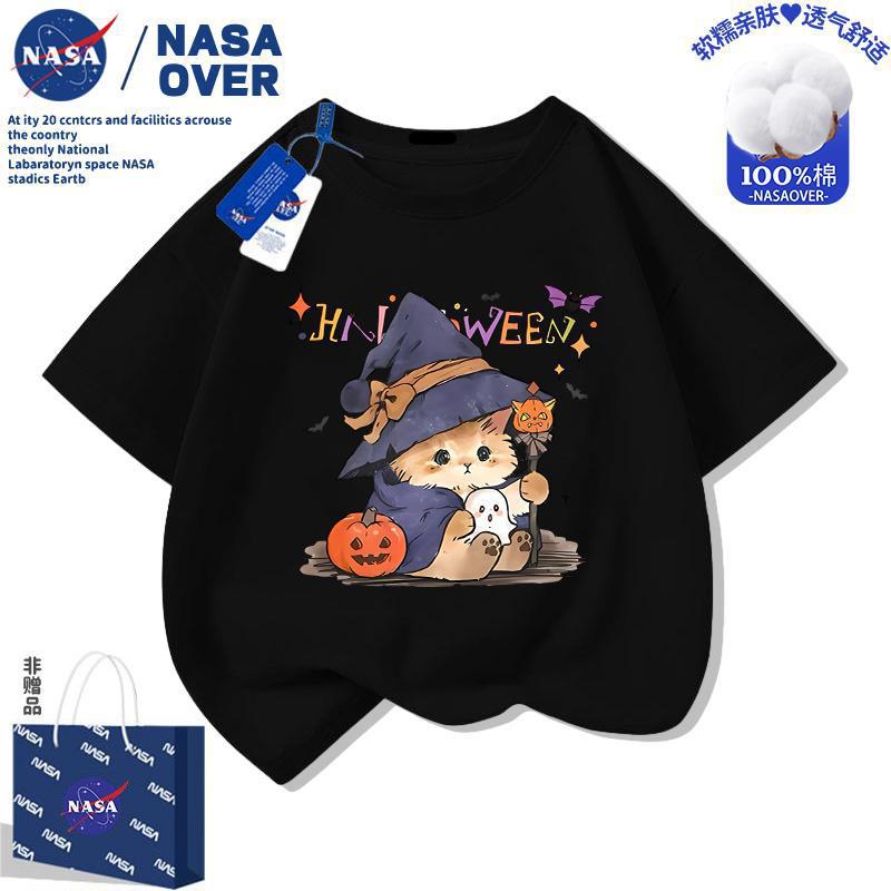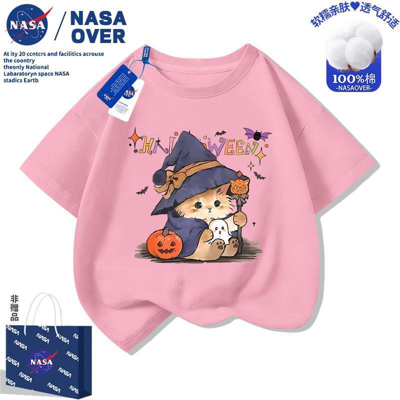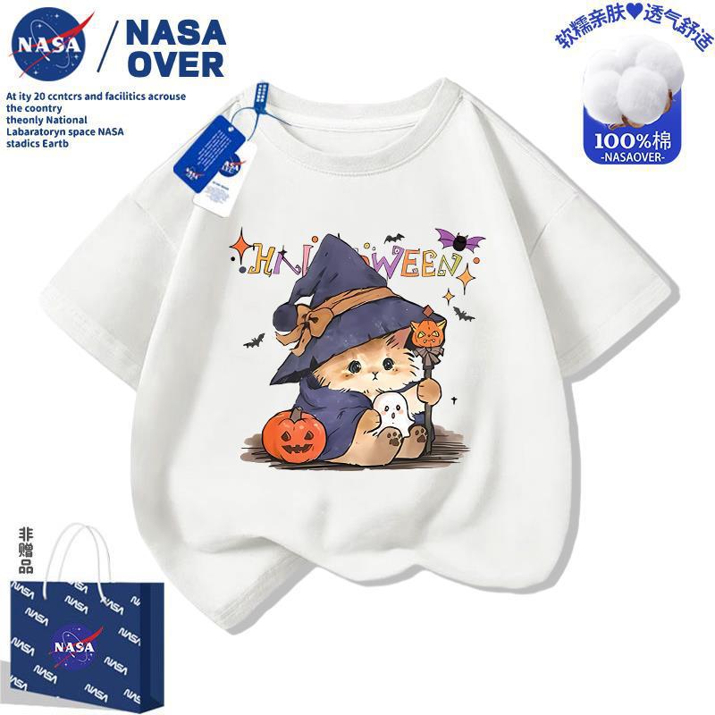 NASA 어린이 마녀 고양이 만화 순수 코튼 반팔 티셔츠 2025 새로운 중대형 아동 의류 반팔 아동 의류상의스토어 가기