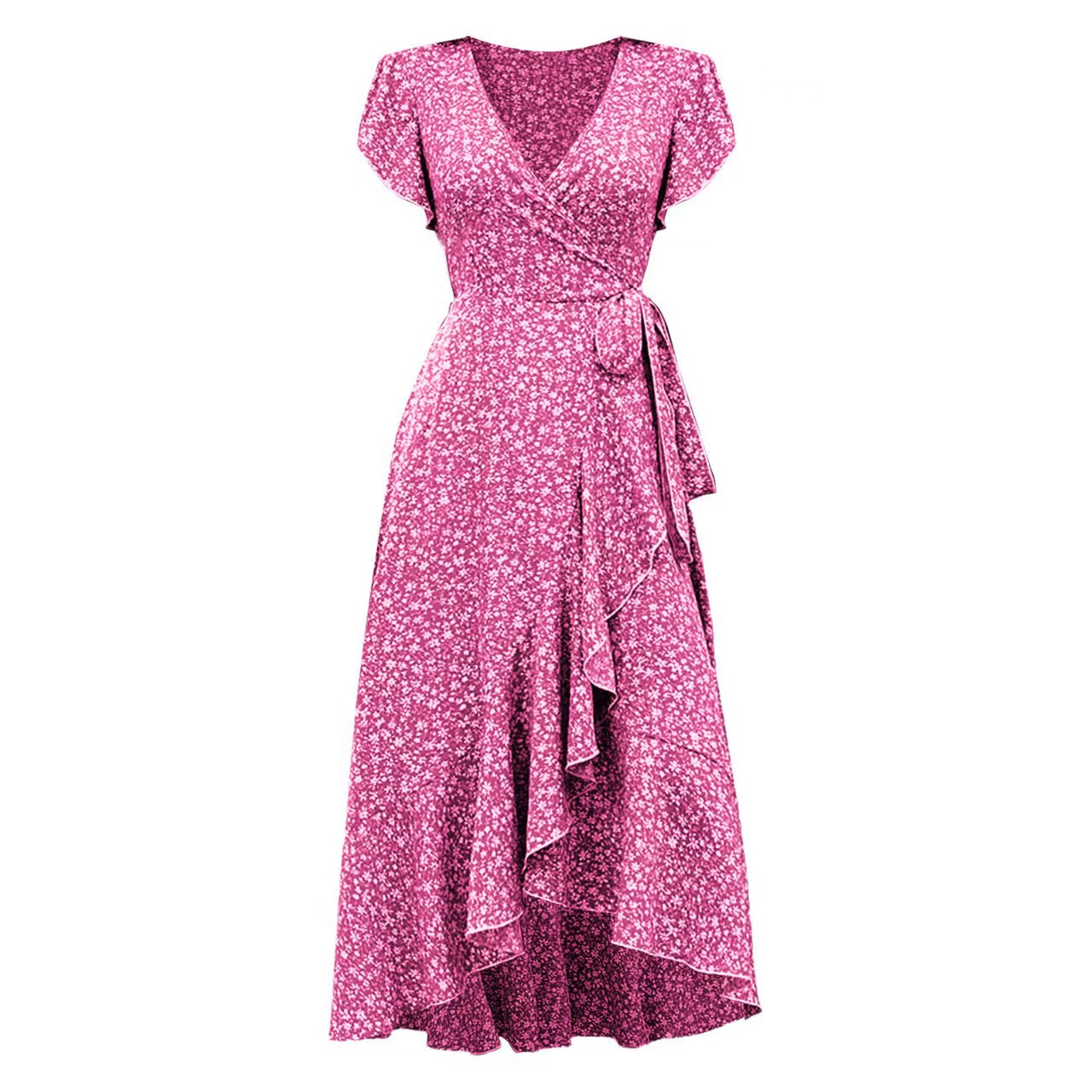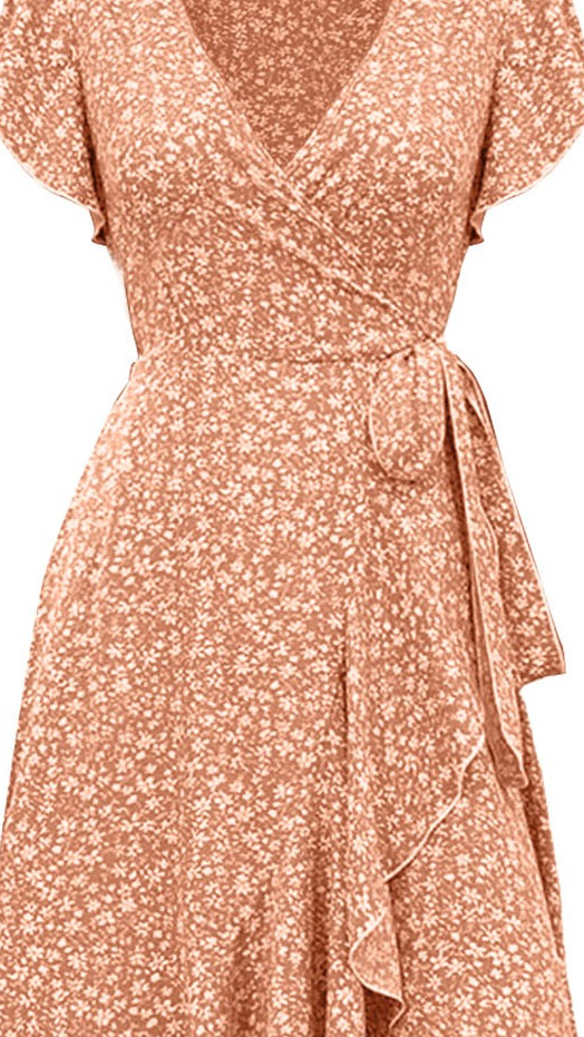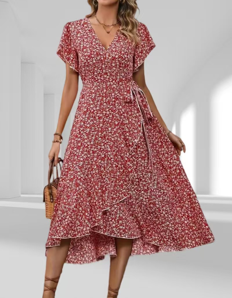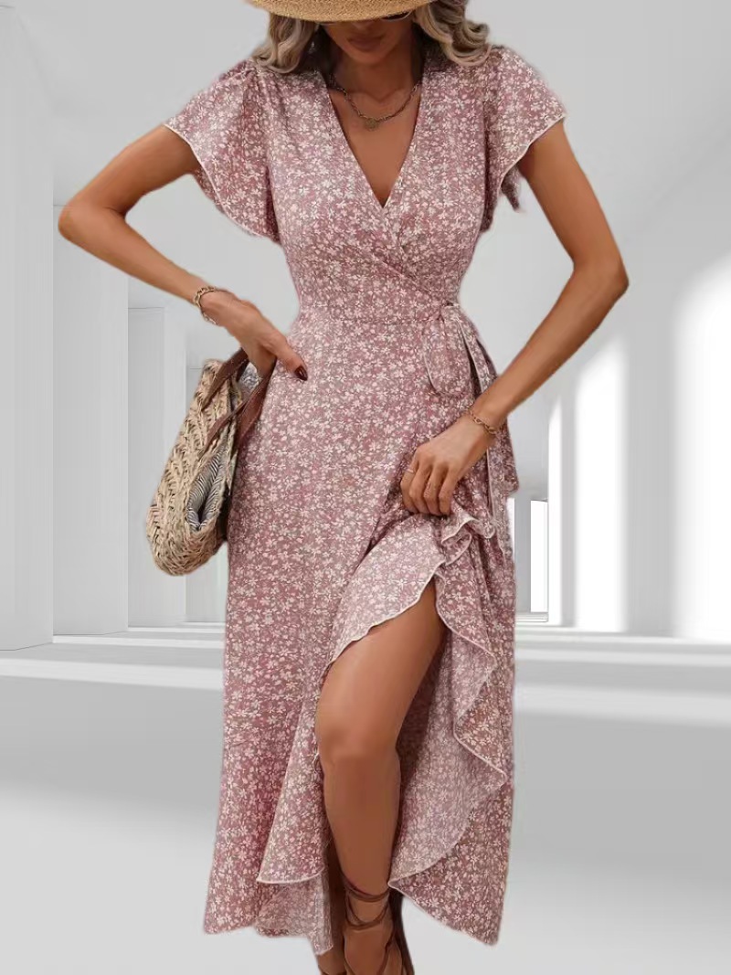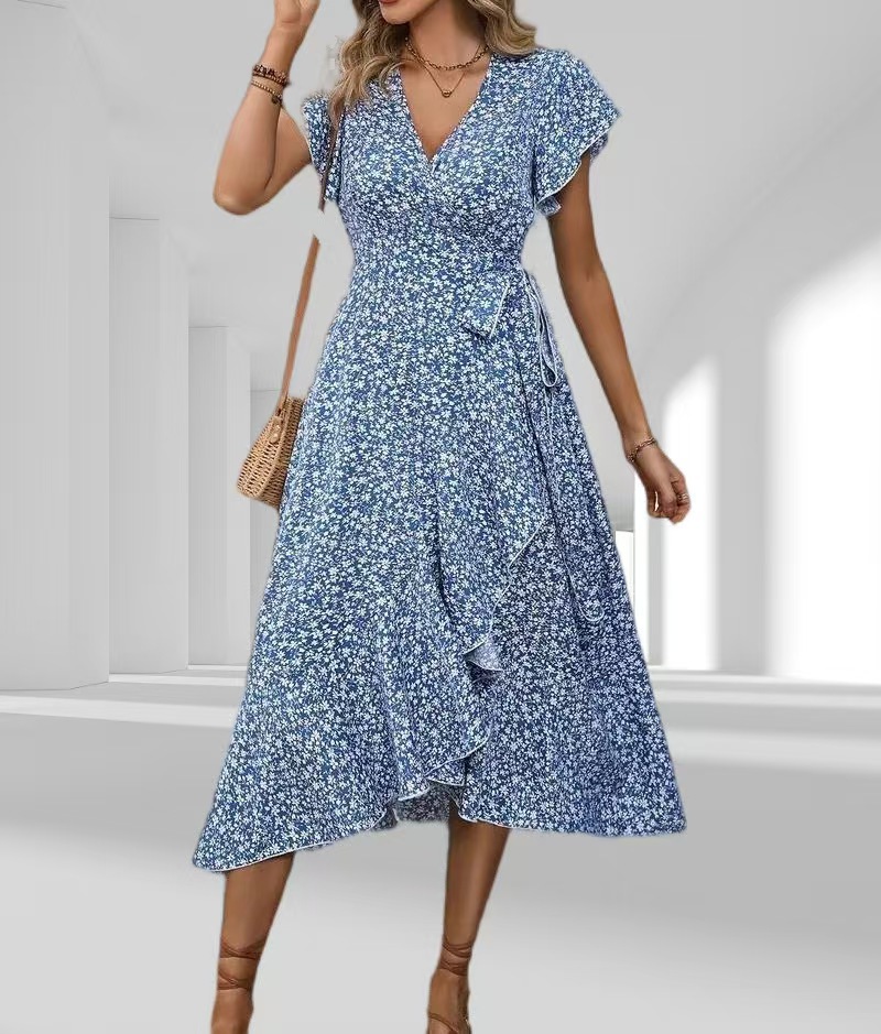 유럽과 미국의 아마존 국경 간 작은 꽃 무늬 v 넥 카디건 벨트 랩 반팔 보헤미안 휴가 드레스 여성용스토어 가기