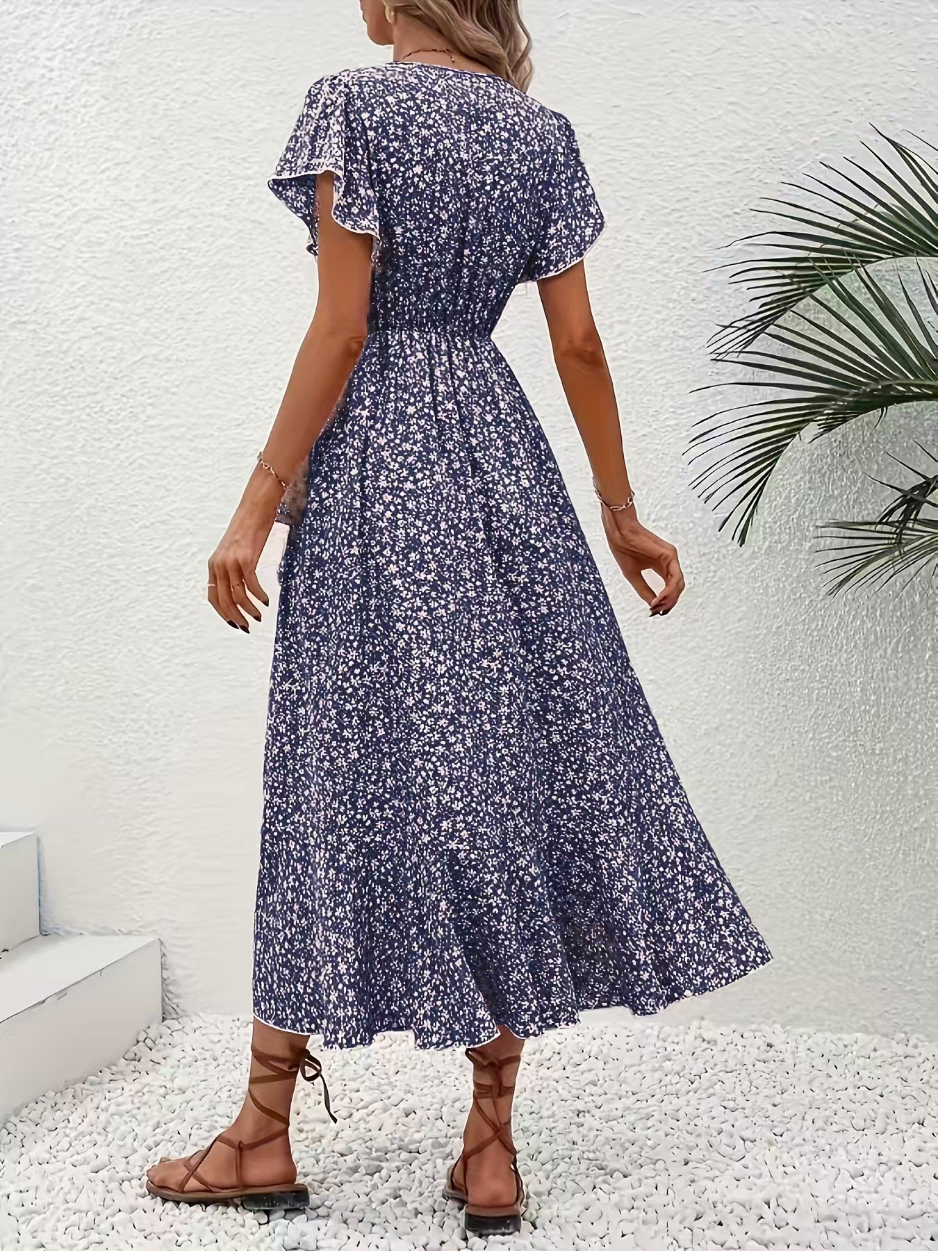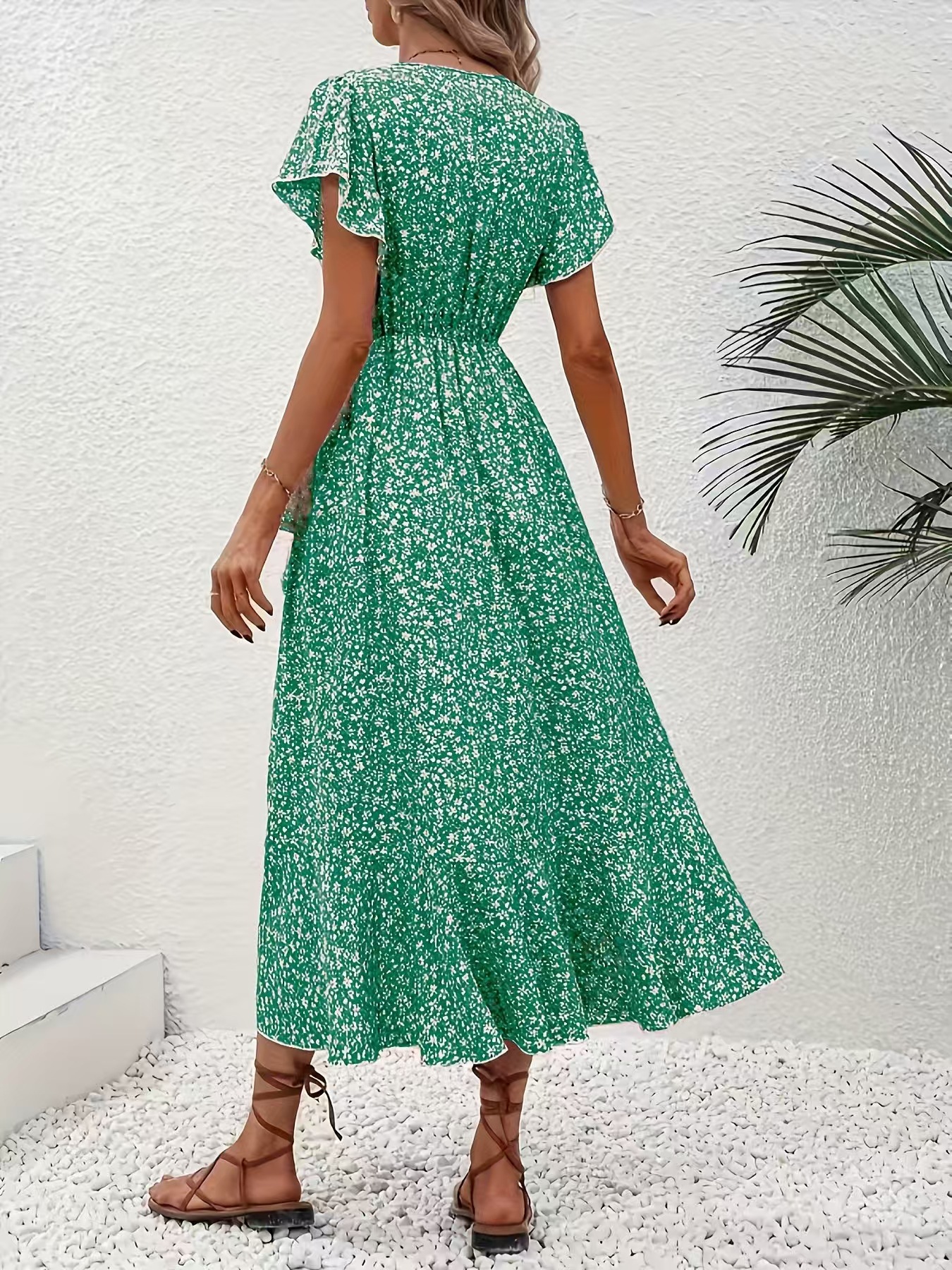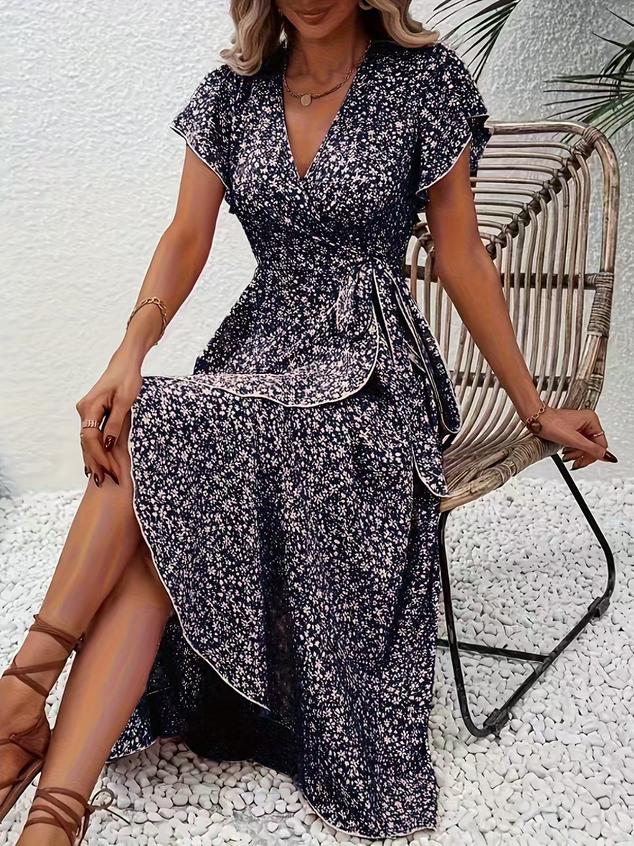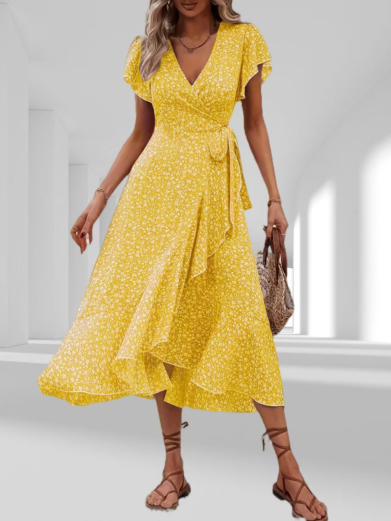 유럽과 미국의 아마존 국경 간 작은 꽃 무늬 v 넥 카디건 벨트 랩 반팔 보헤미안 휴가 드레스 여성용스토어 가기