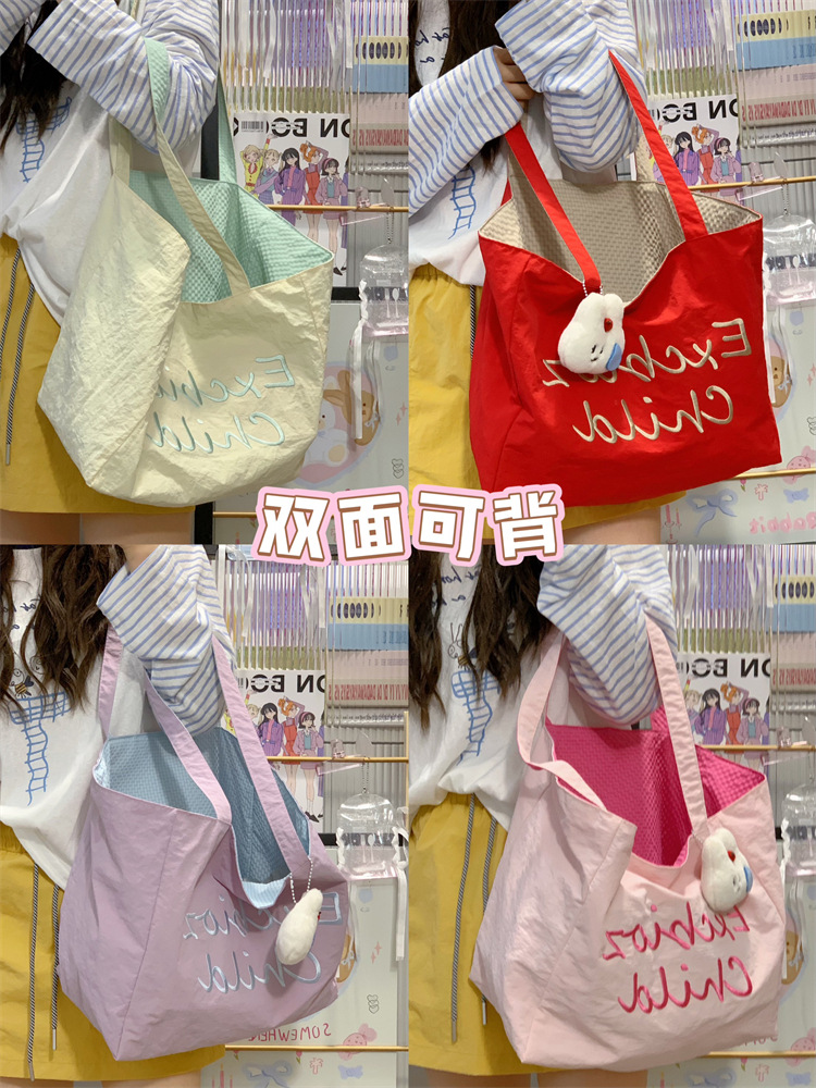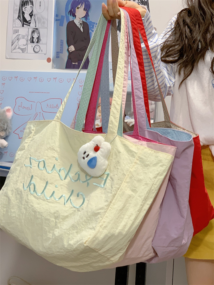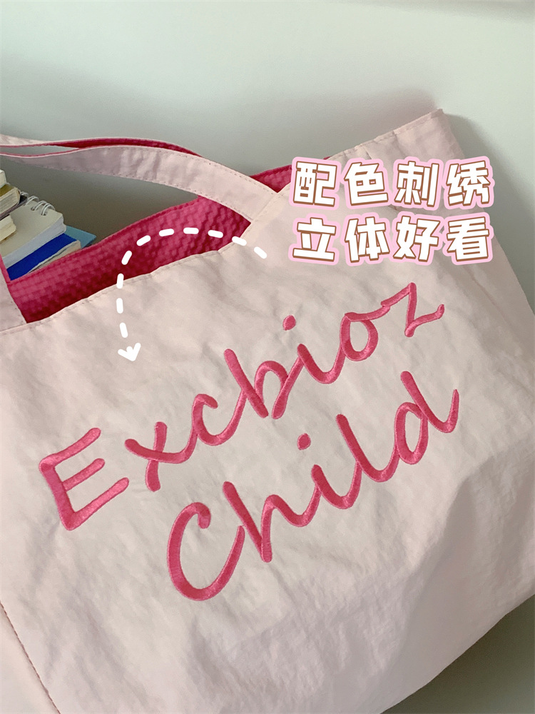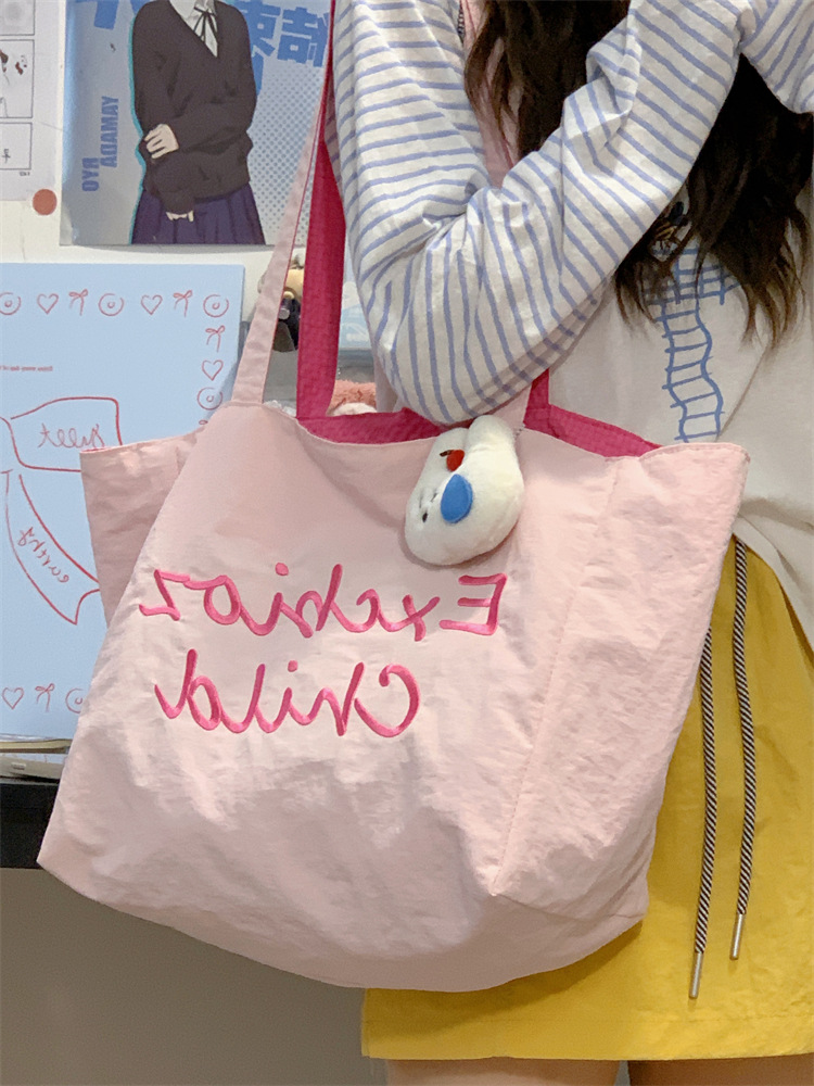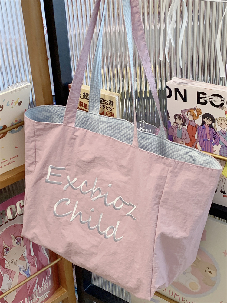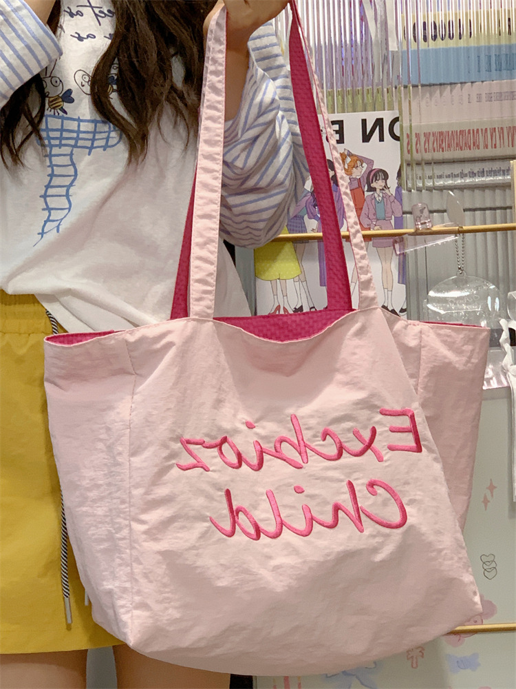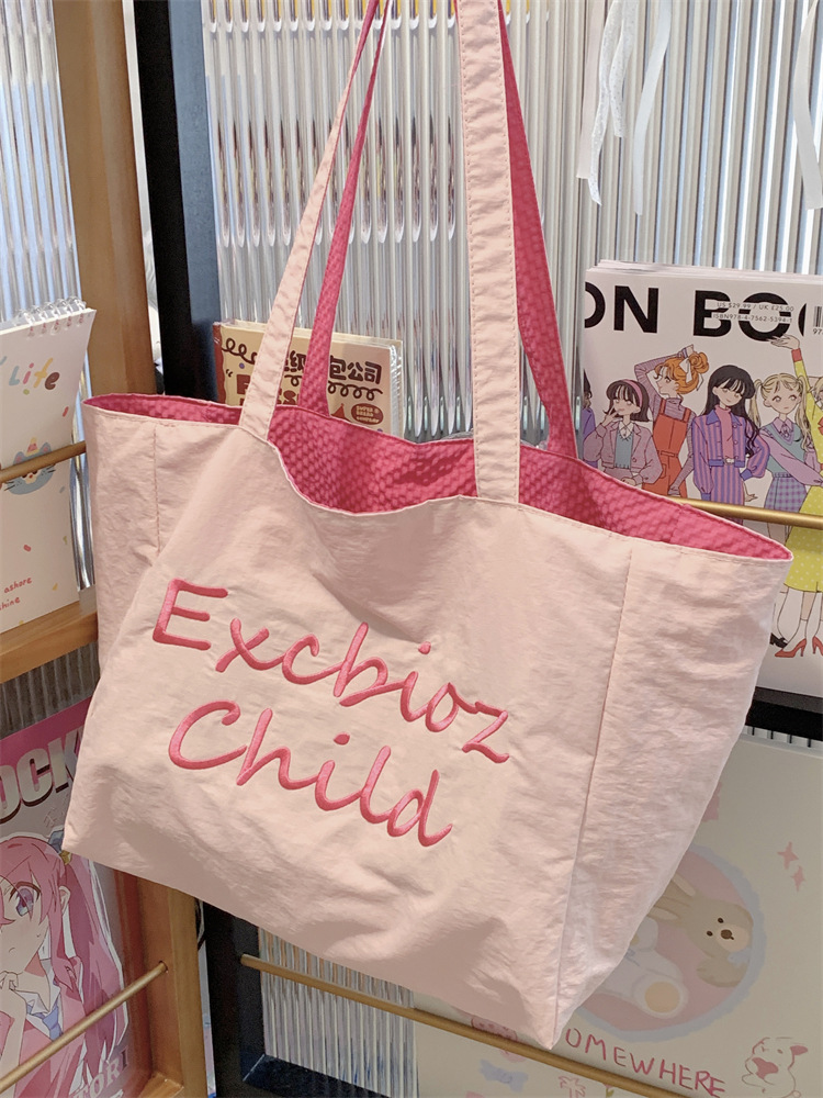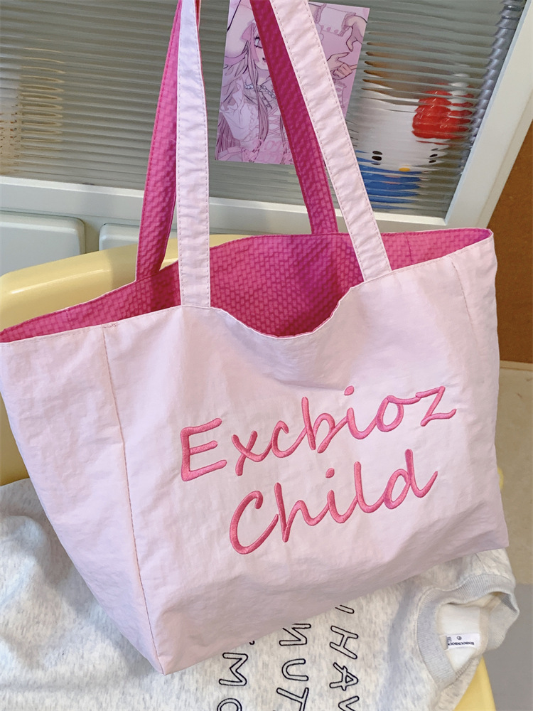 대용량 토트백, 양면 단색 숄더백, 질감 자수 대학생 캔버스백, 여성 통근가방
