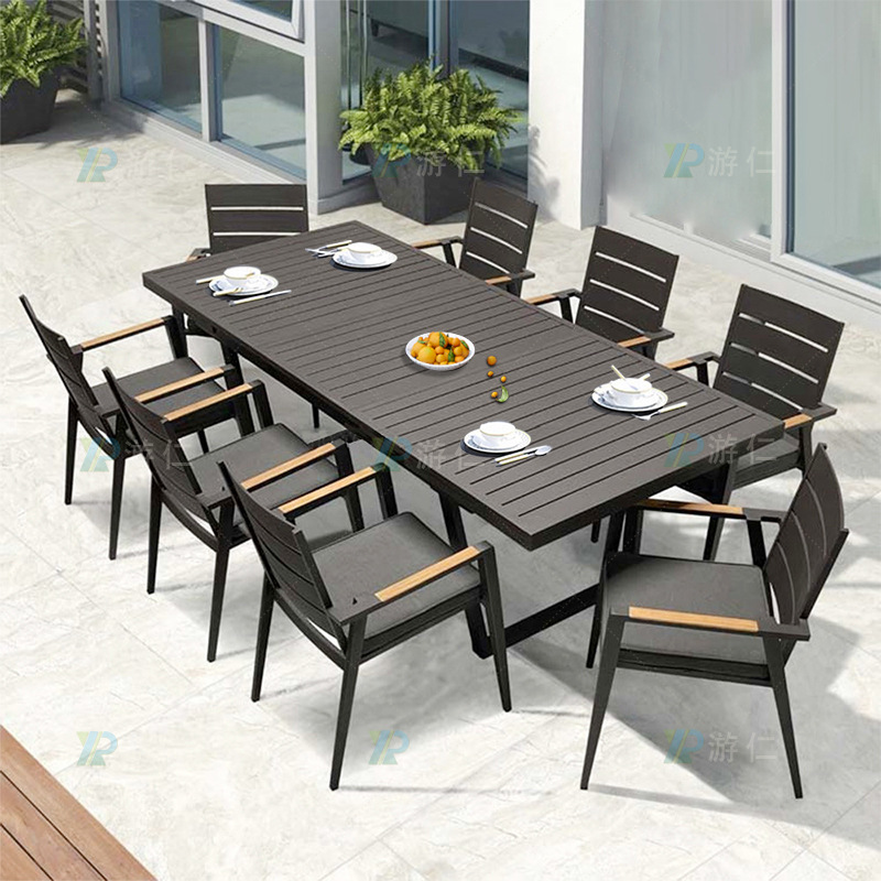 야외 알루미늄 합금 테이블과 의자, 안뜰 빌라 정원, 테라스, 발코니, 방수 및 자외선 차단제, 레저용 긴 식탁 조합