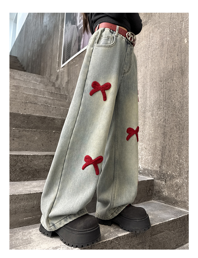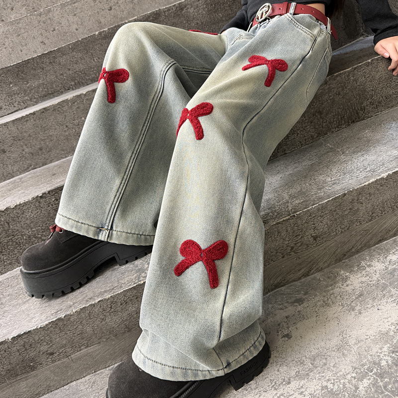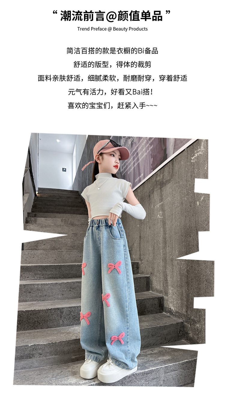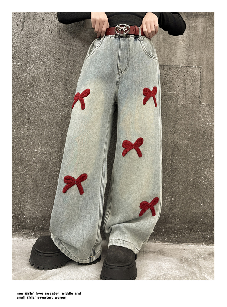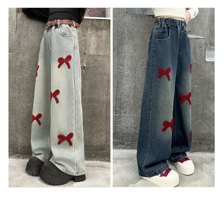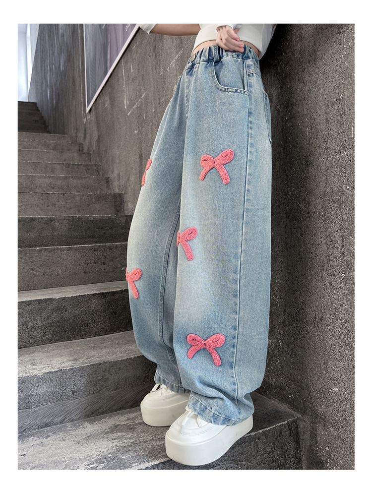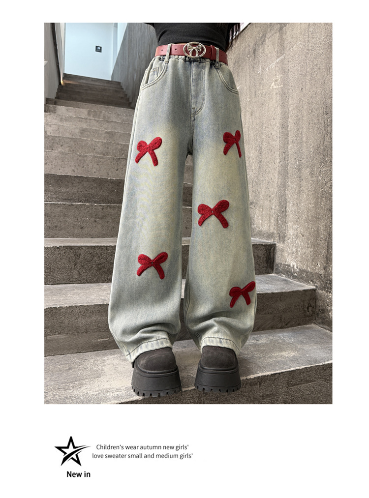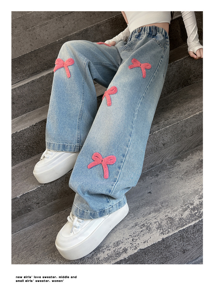 여아 바지 가을 의류 2025 새로운 스타일 아동 청바지 봄, 가을 여아 바지 중대형 아동용 와이드 팬츠