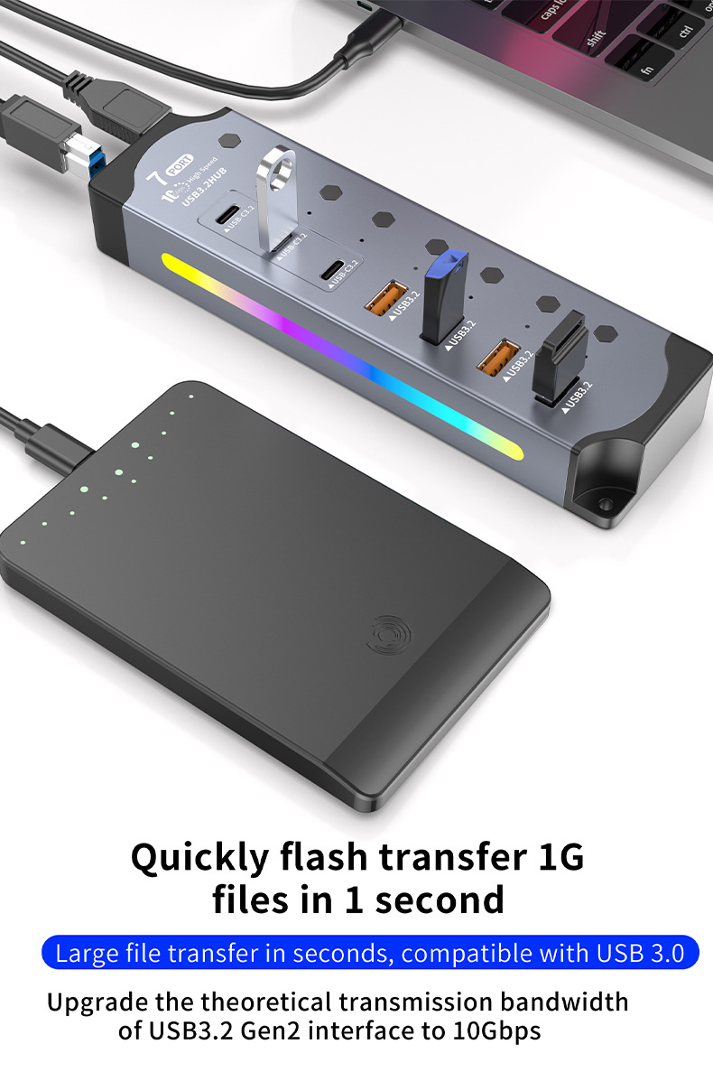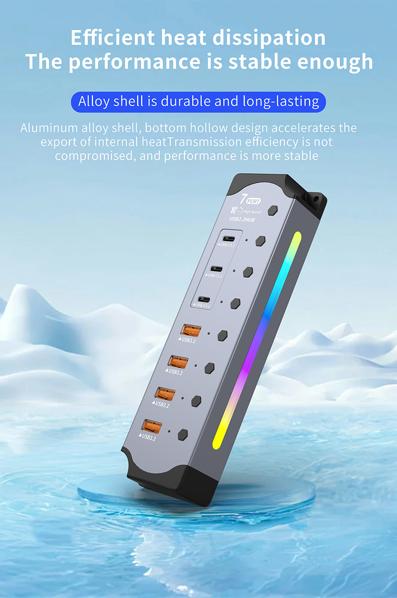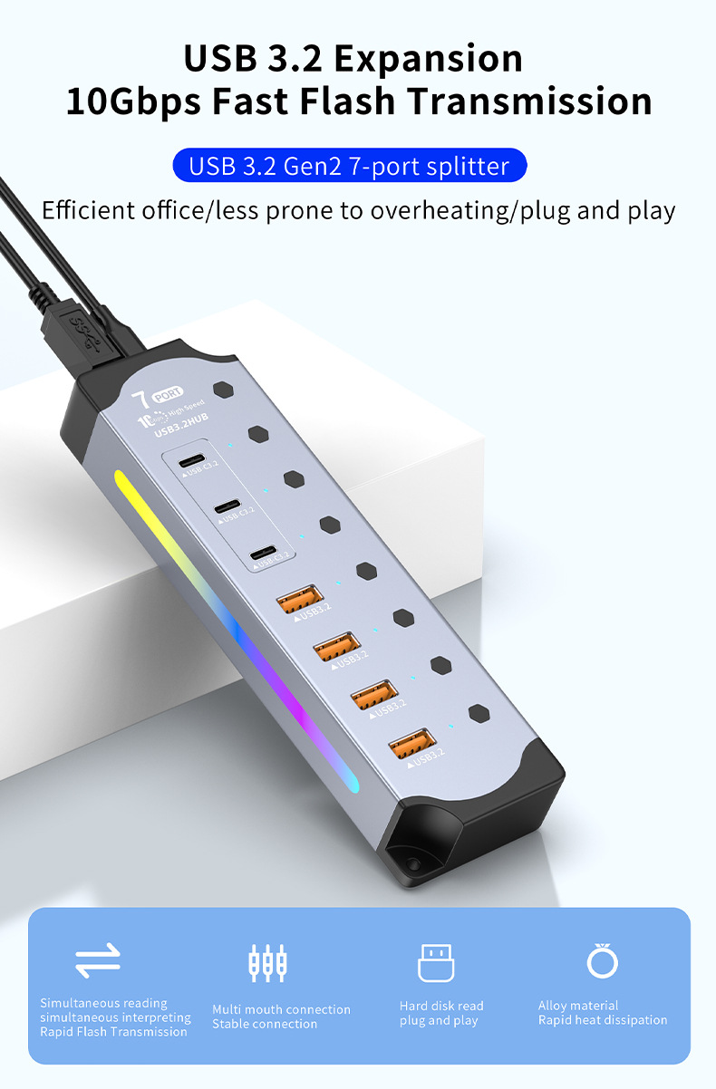 국경 간 핫 세일 RGB 쿨 USB3.2 허브 Gen2 컴퓨터 분배기 10Gbps 고속 확장기