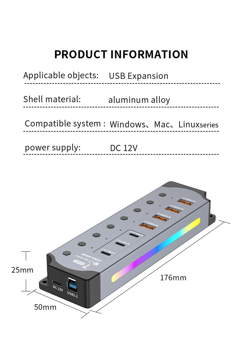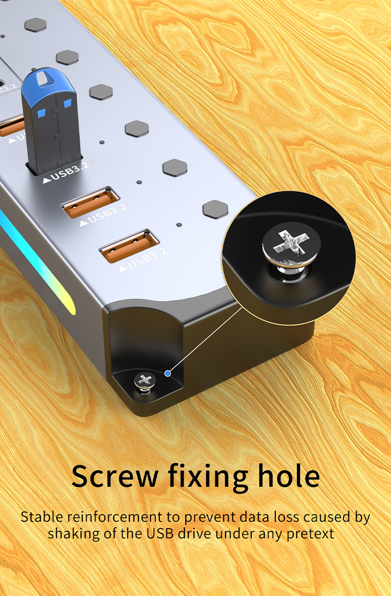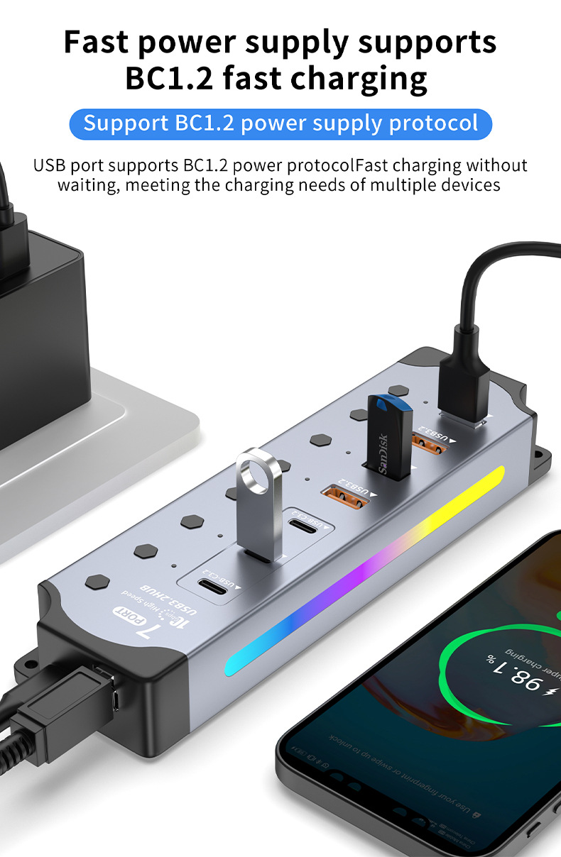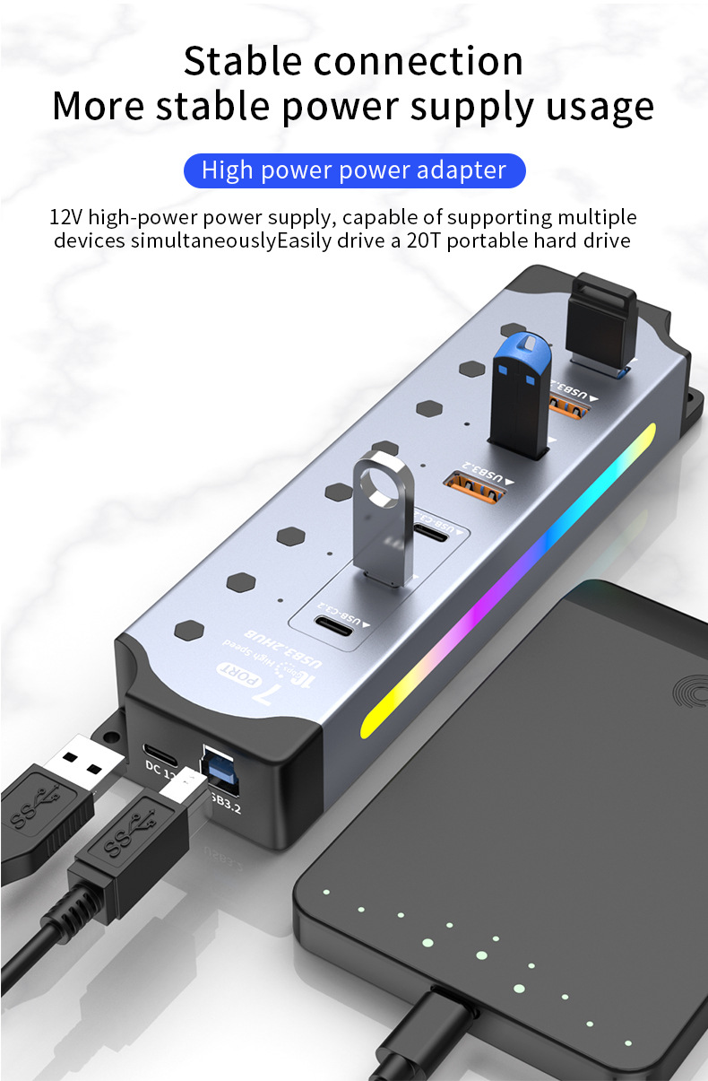 국경 간 핫 세일 RGB 쿨 USB3.2 허브 Gen2 컴퓨터 분배기 10Gbps 고속 확장기