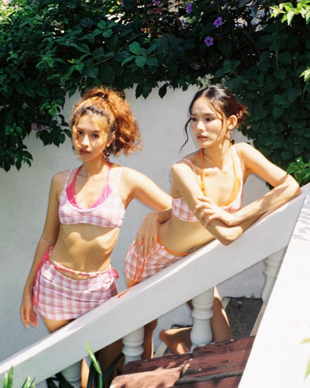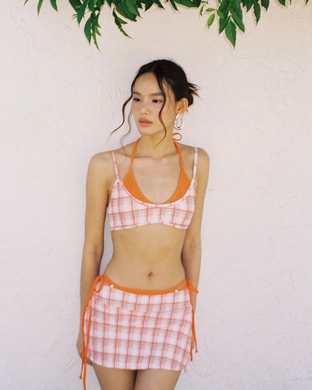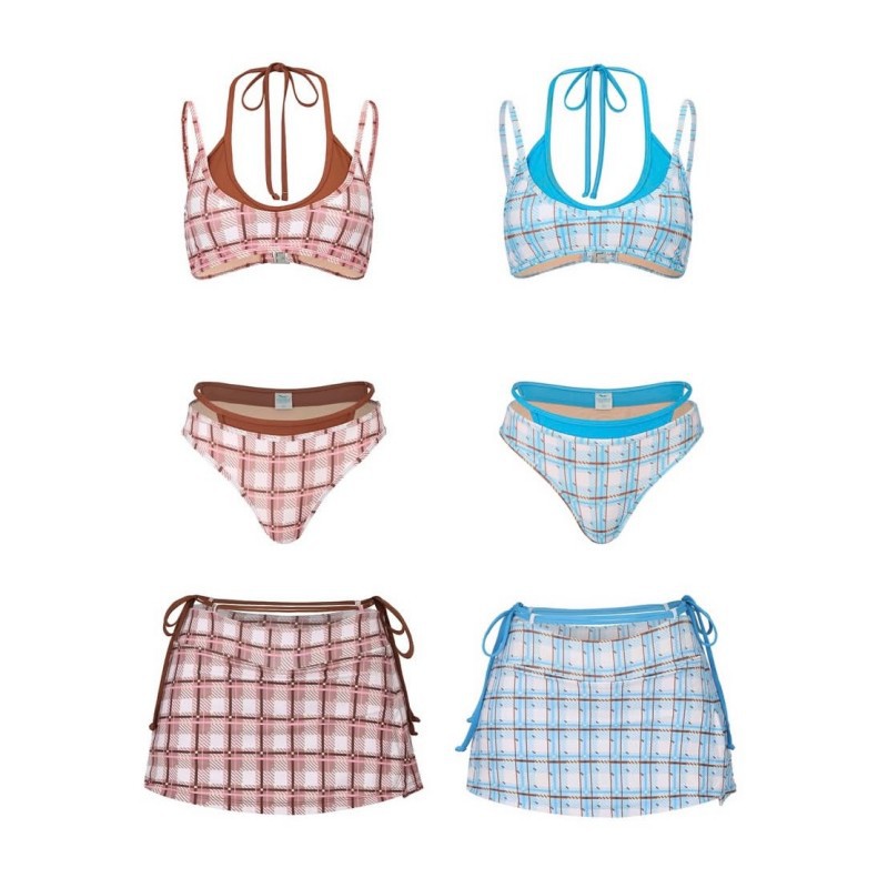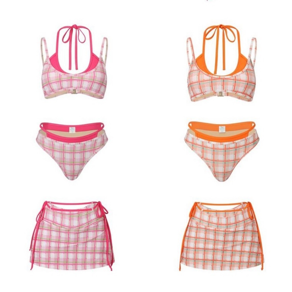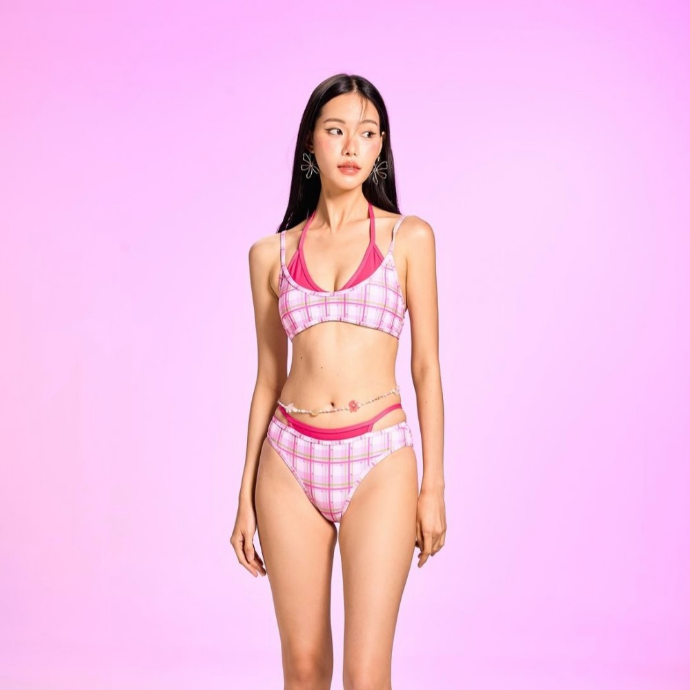 핫걸 대비 체크 무늬 스플라이싱 섹시 비키니 3피스 바비 핑크 섬 온천 휴가 수영복 비키니