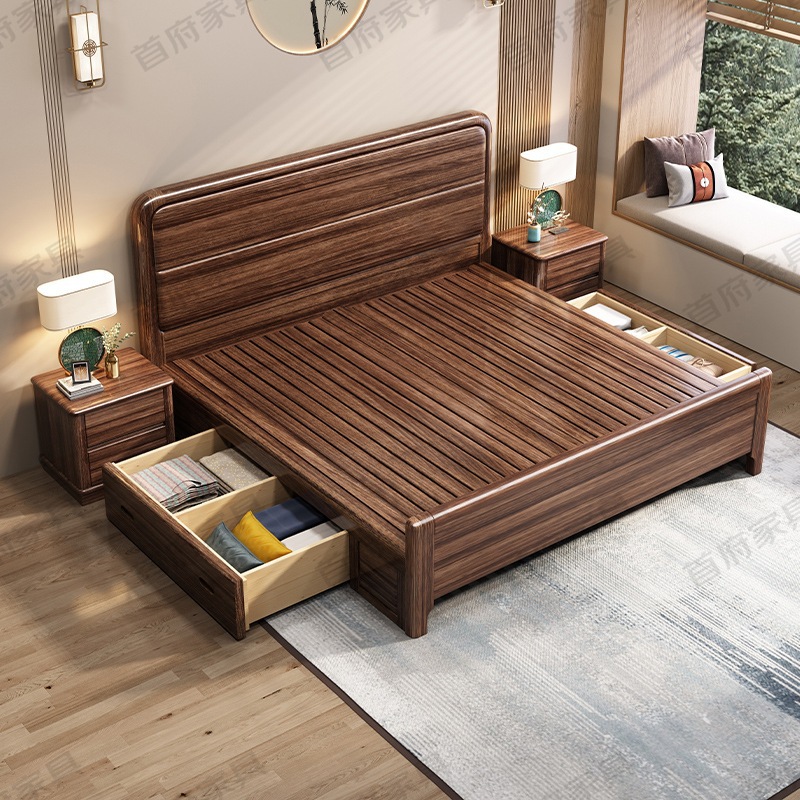 호두나무 침대, 가벼운 럭셔리, 미니멀리스트 홈 침실, 단단한 나무 침대, 중소형 수납 마스터 침실, 새로운 중국 스타일의 단단한 나무 침대