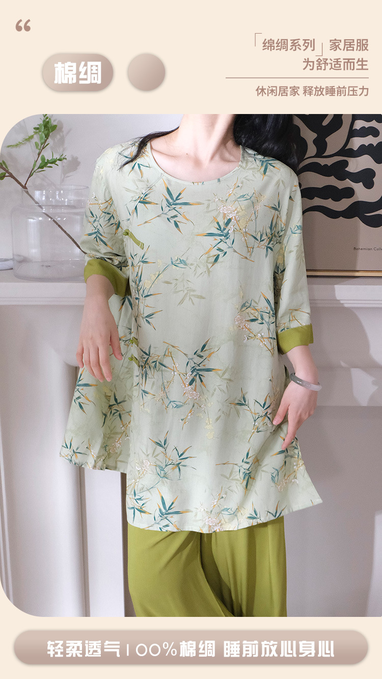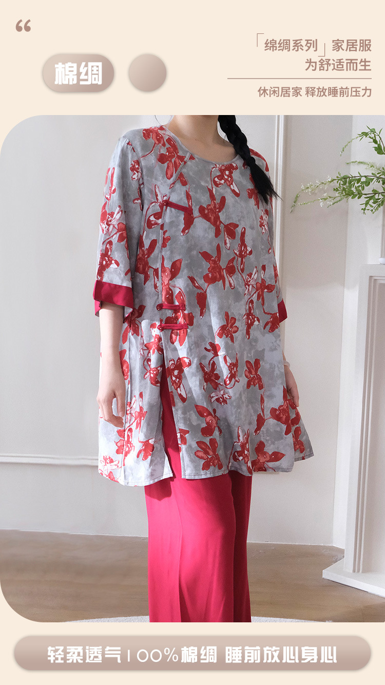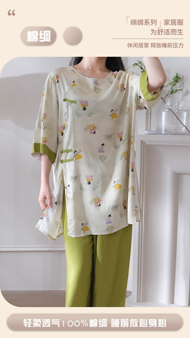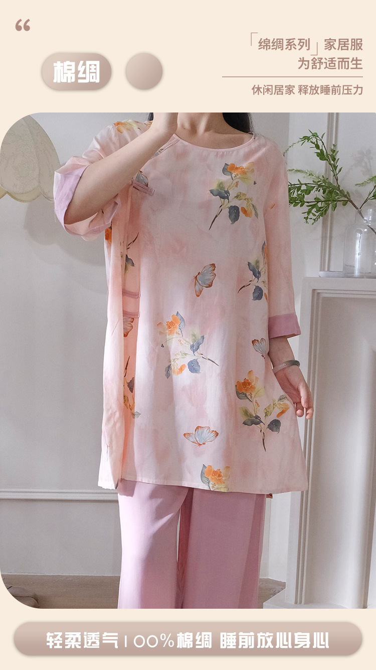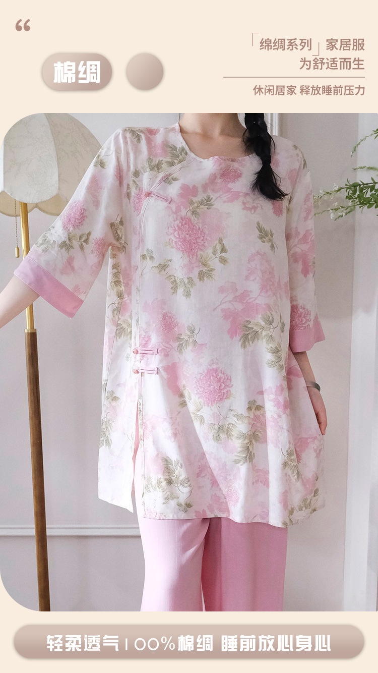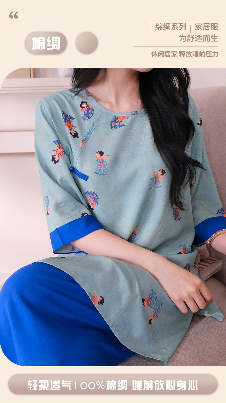 여름 새로운 중국 스타일 복고풍 면 실크 중간 소매 얇은 잠옷 여성 정장은 집 밖에서 착용할 수 있습니다 투피스 세트스토어 가기