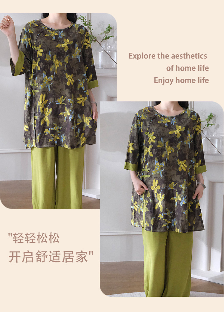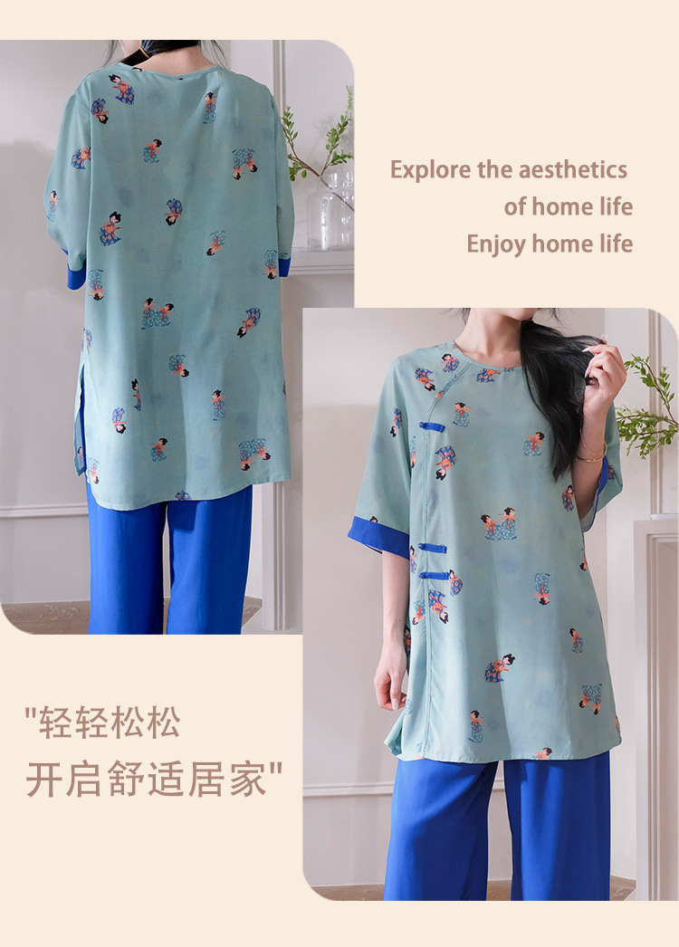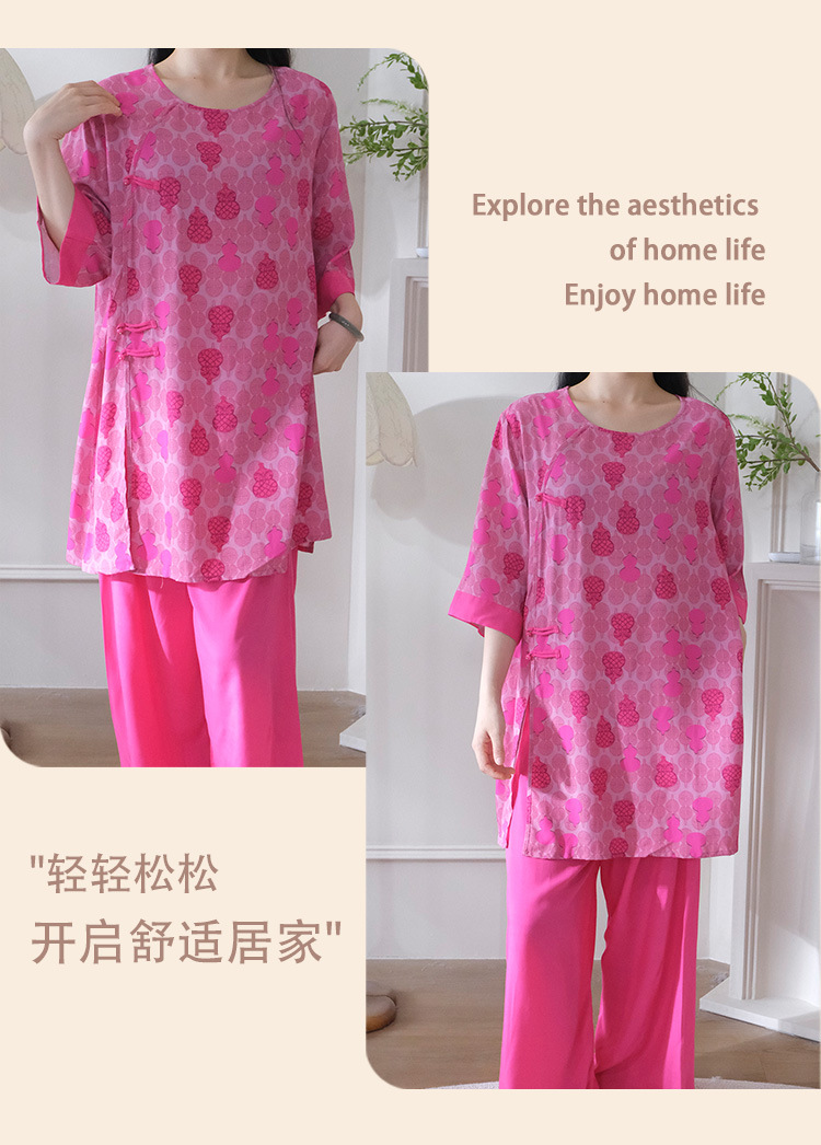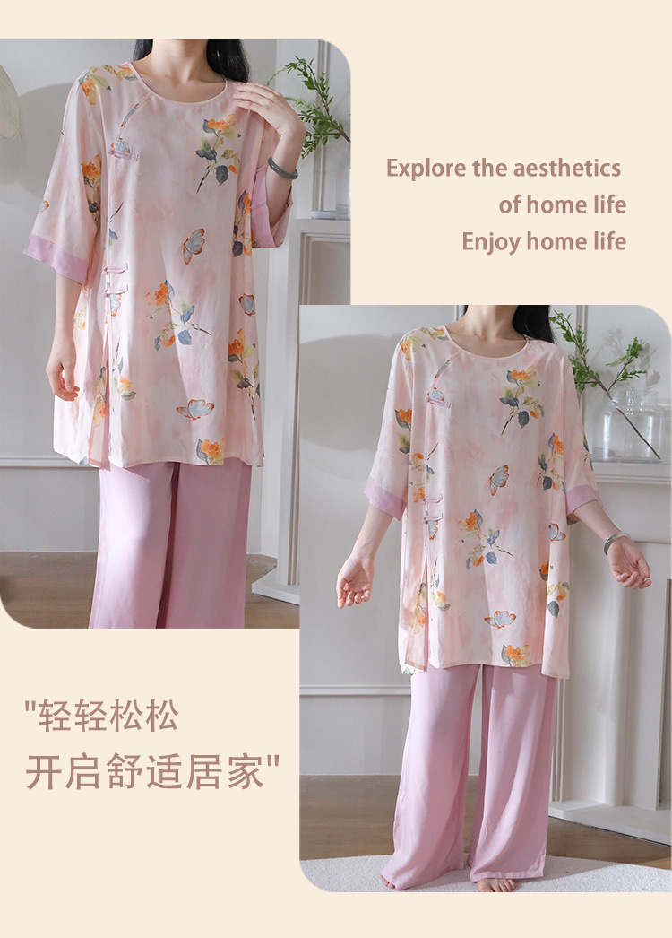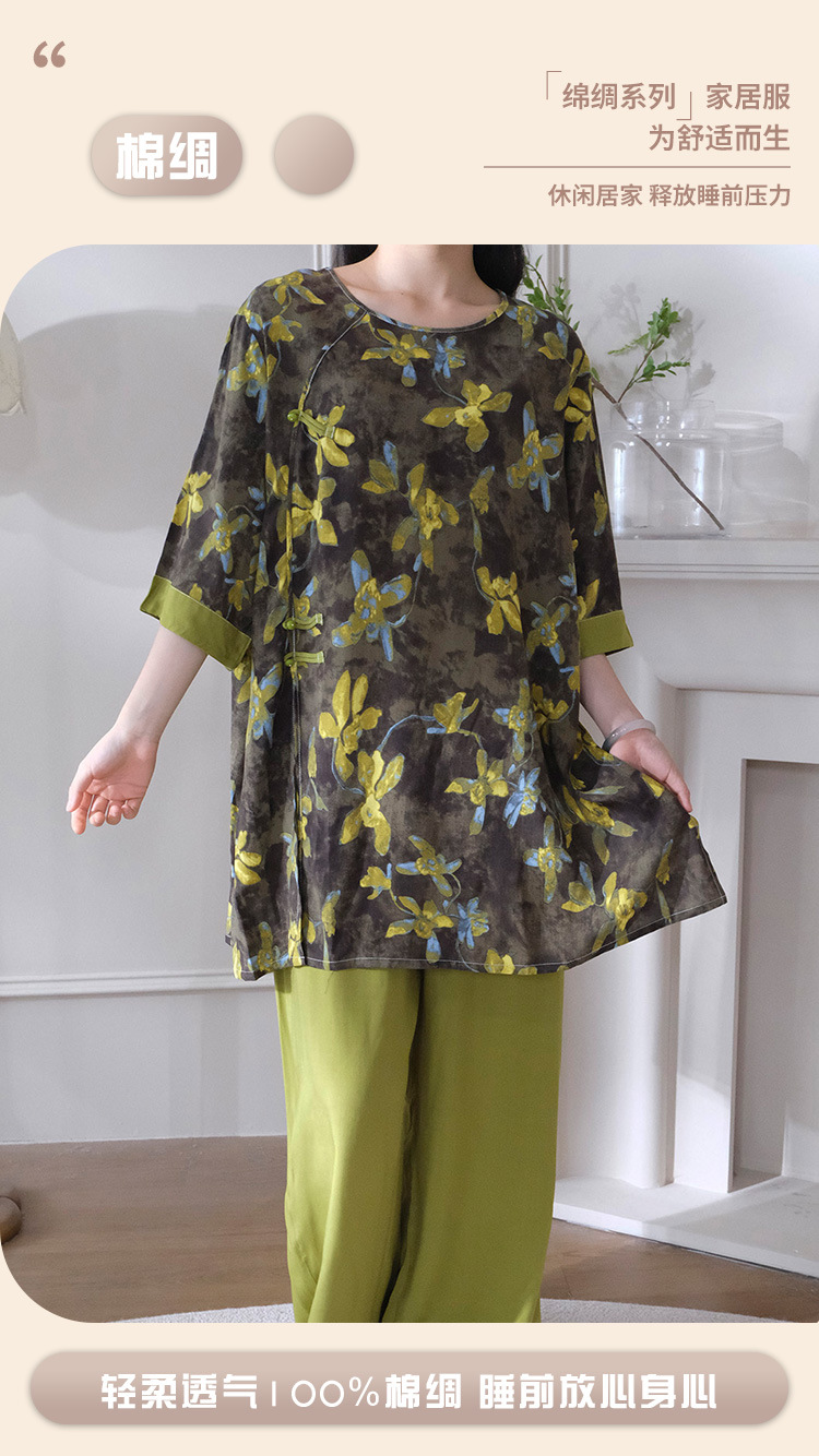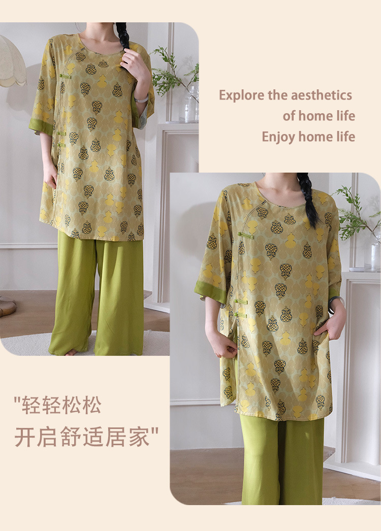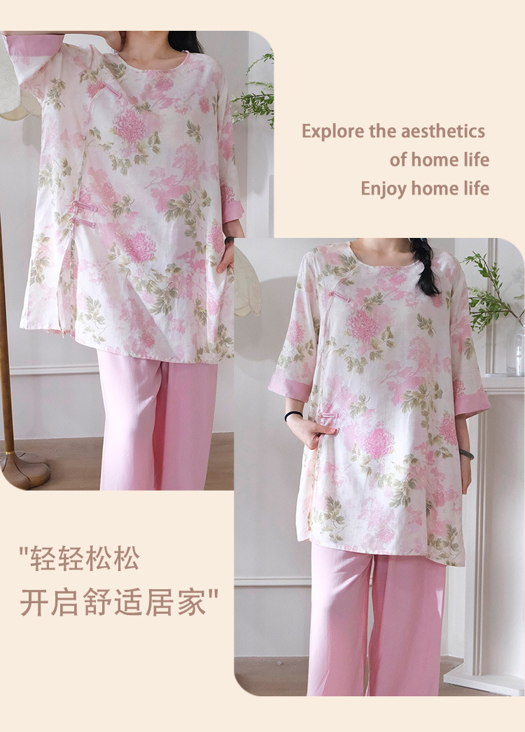 여름 새로운 중국 스타일 복고풍 면 실크 중간 소매 얇은 잠옷 여성 정장은 집 밖에서 착용할 수 있습니다 투피스 세트스토어 가기