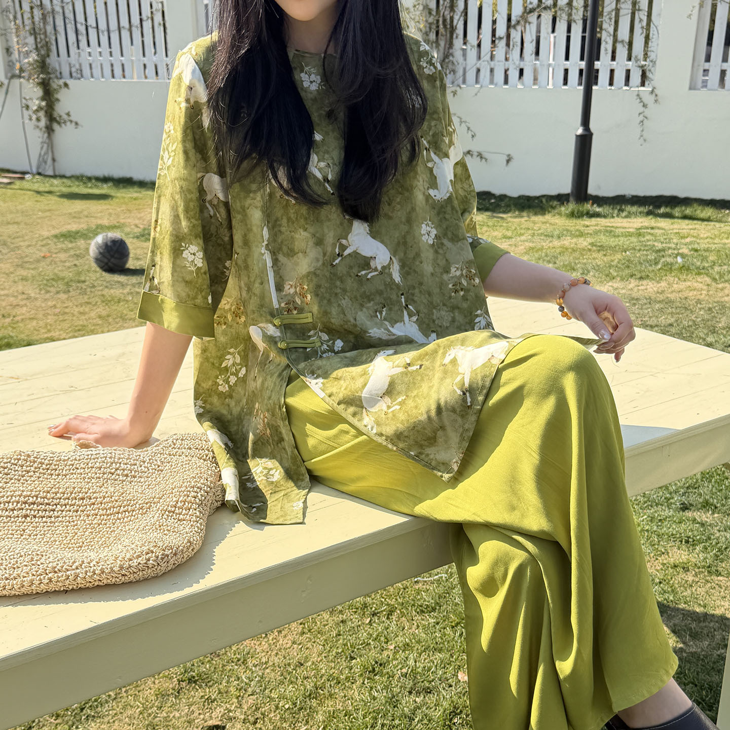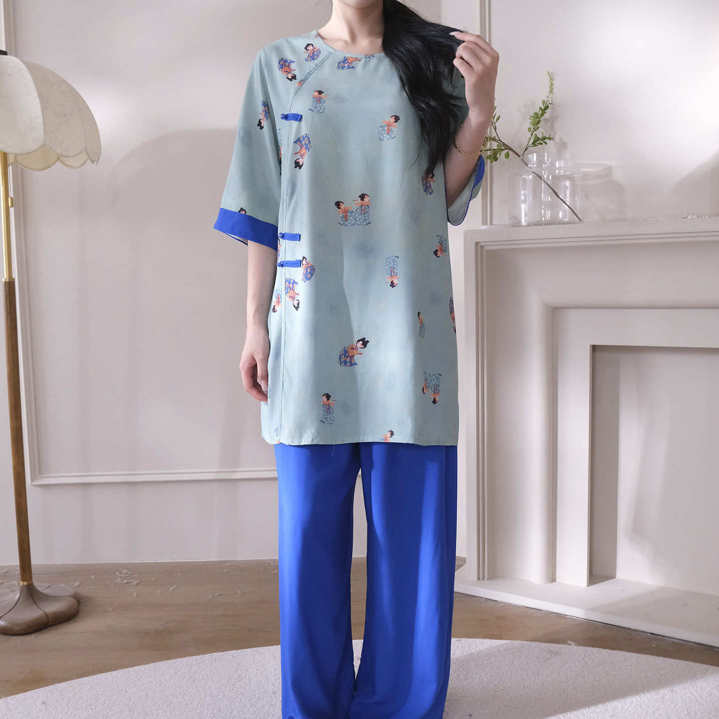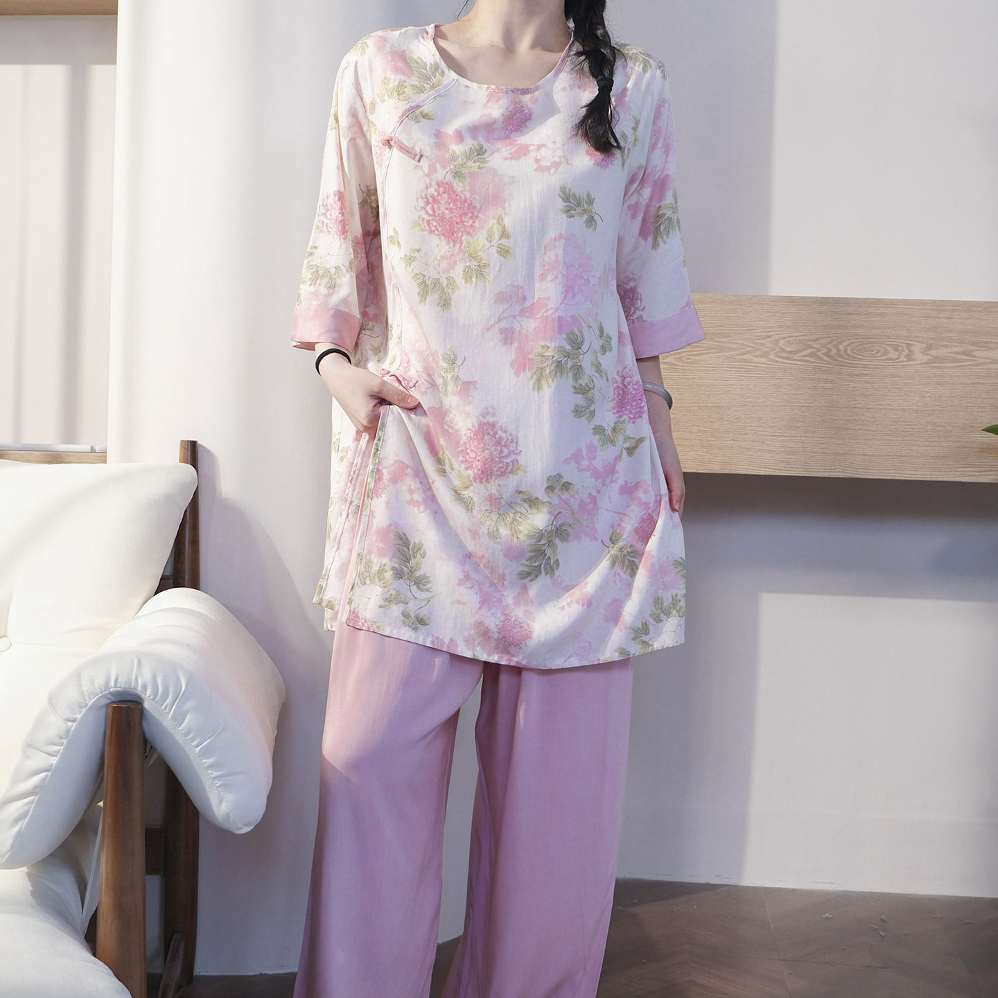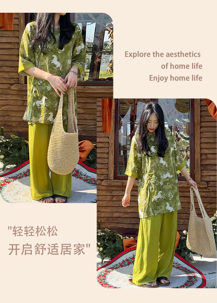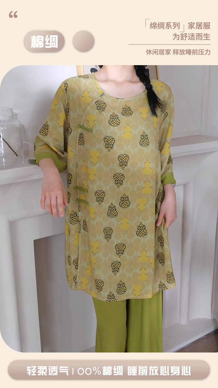여름 새로운 중국 스타일 복고풍 면 실크 중간 소매 얇은 잠옷 여성 정장은 집 밖에서 착용할 수 있습니다 투피스 세트스토어 가기