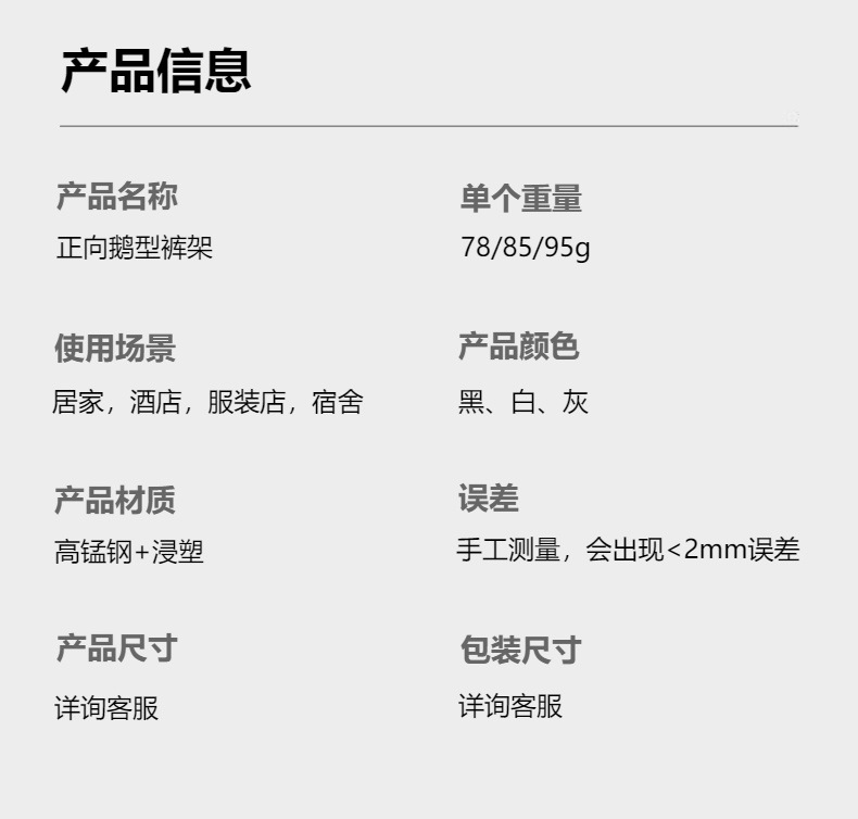 정방향 및 역방향 거위 모양 바지 걸이 25.5/28.5/32.5 거위 모양 바지 걸이 낮은 목 8cm 두꺼운 단단한 고망간 강철스토어 가기