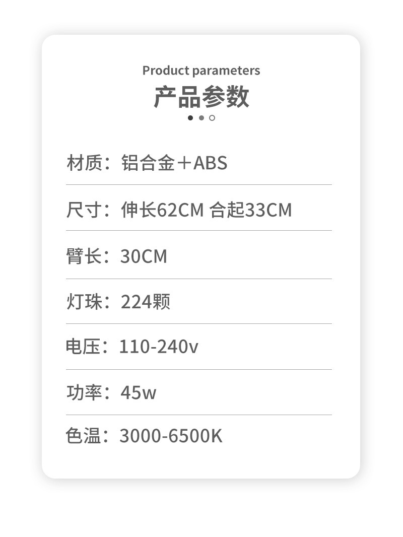 • 22inch 단일 조명 + 리모콘 + 보관 가방 + 2.1m 접이식 브래킷