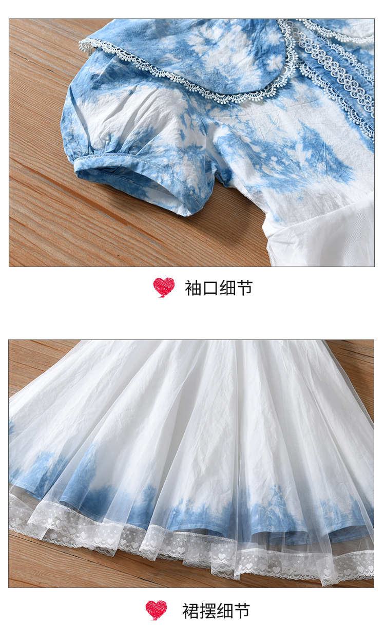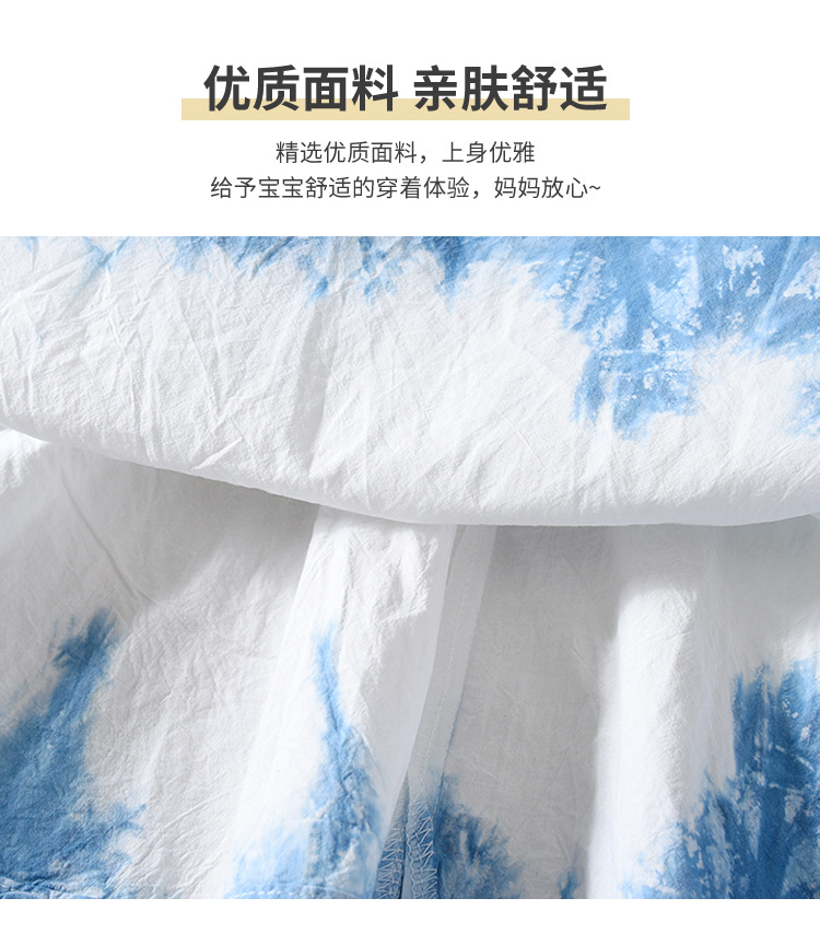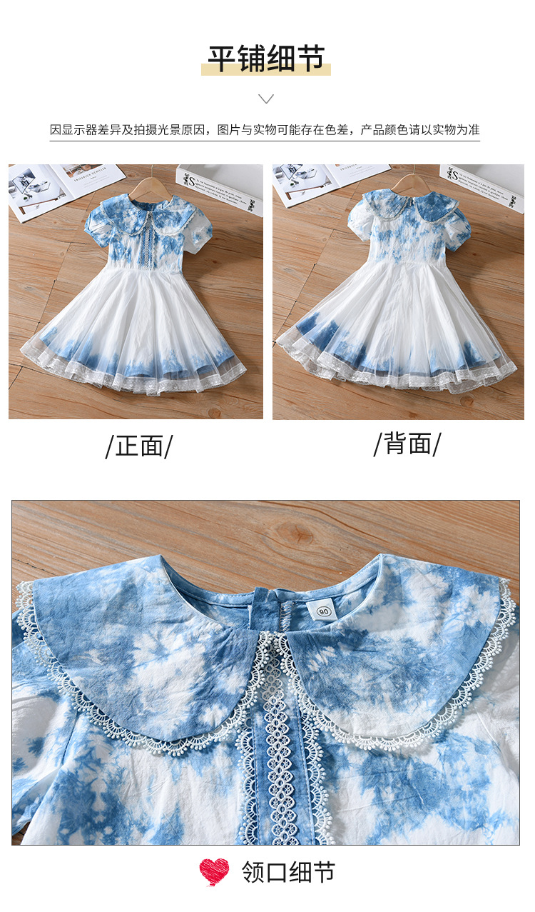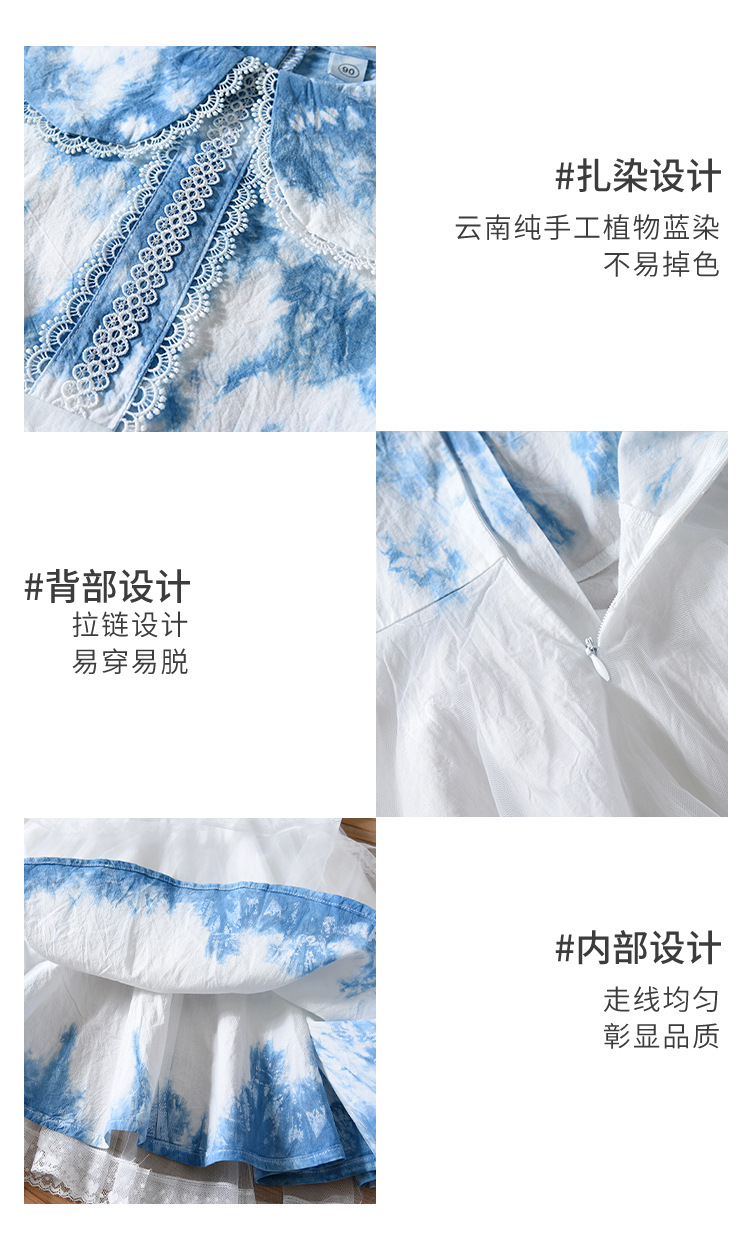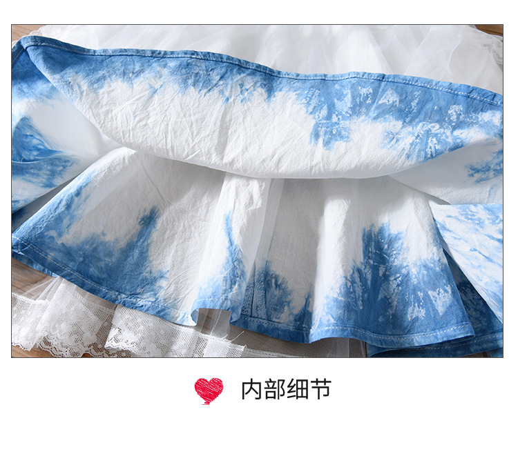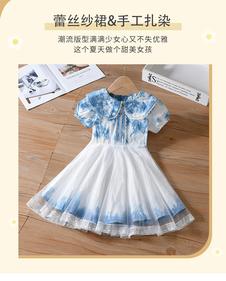 운남 고대 수제 식물 타이 염색 어린이 레이스 스플 라이스 드레스 소녀 반팔 여름 소녀 공주 드레스