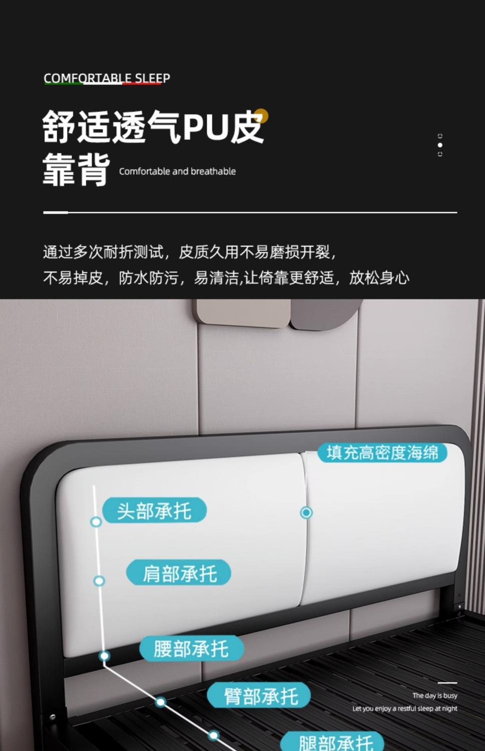 • 고급스러운 블랙 침대 + 화이트 소프트백 + 5cm 매트리스