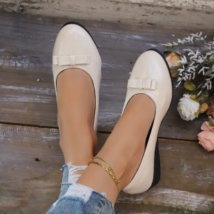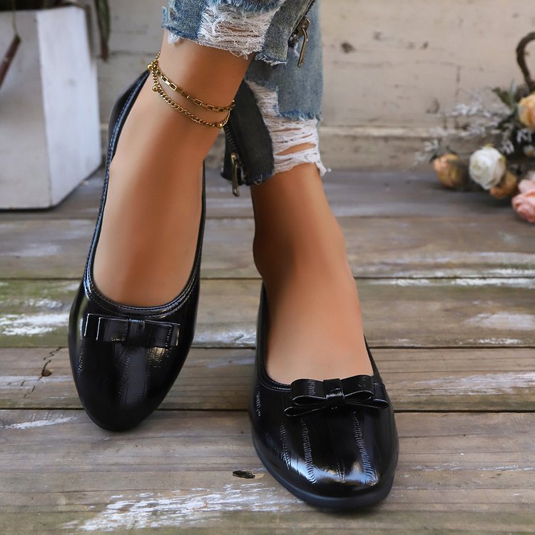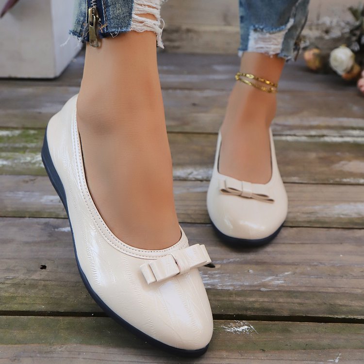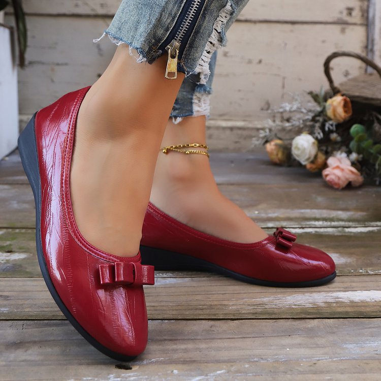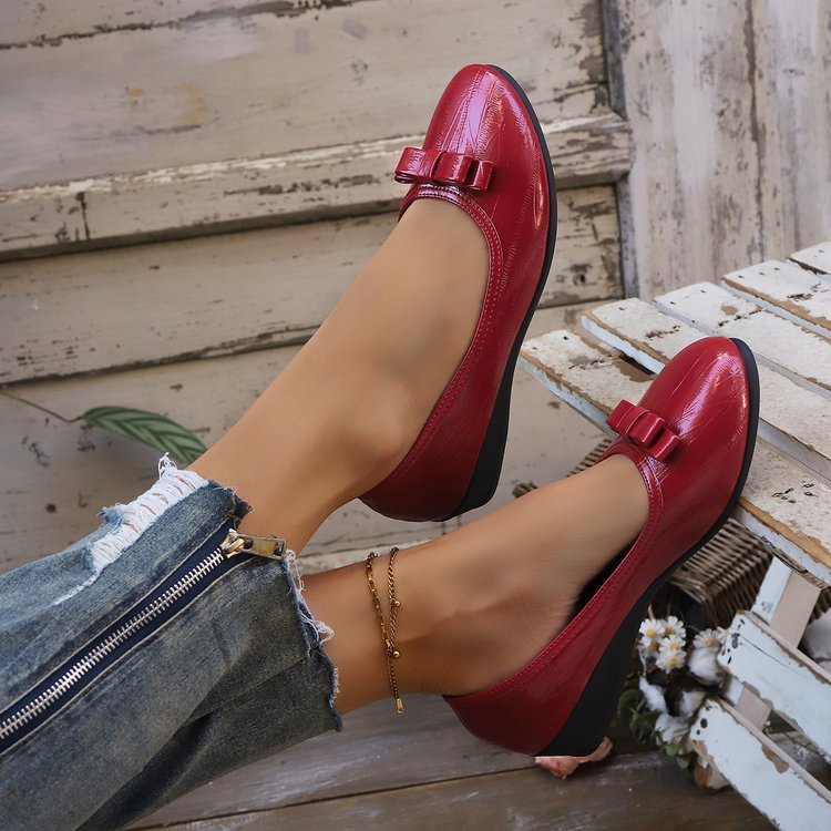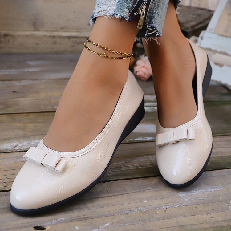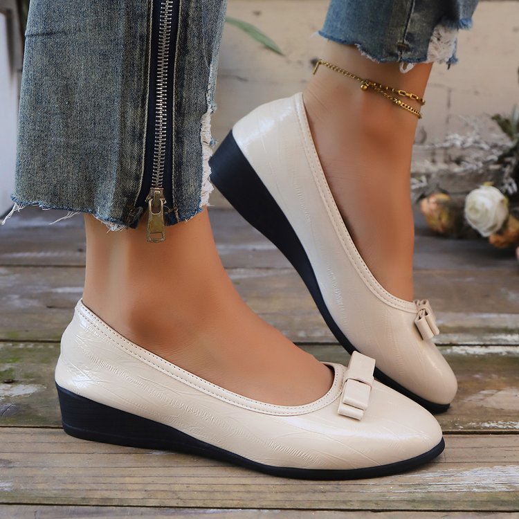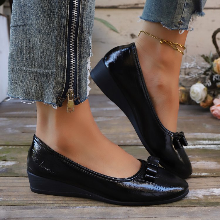대외 무역 대형 플랫 슈즈 여성용 새 스타일 보우 웨지 로우 힐 여성용 신발 라운드 발가락 여성용 작업 신발 가죽 신발스토어 가기