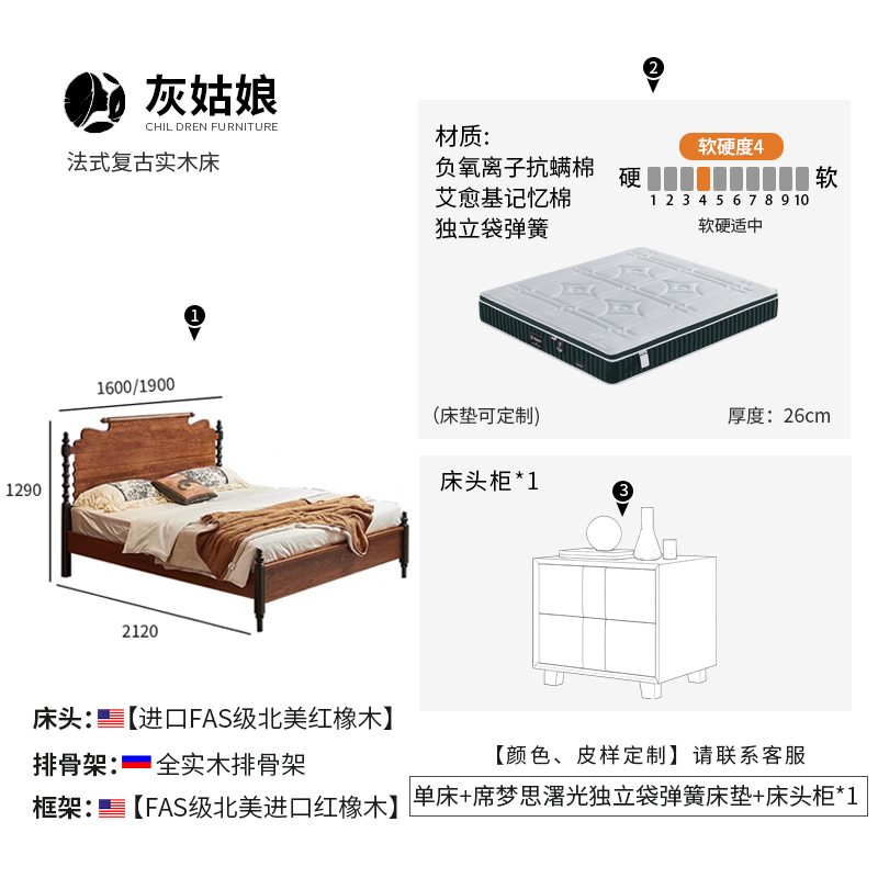 • [★◇★◇]【FAS级北美红橡木】单床+席梦思濖光独立袋艾愈基记忆棉床垫+床头柜*1[★◇★◇]