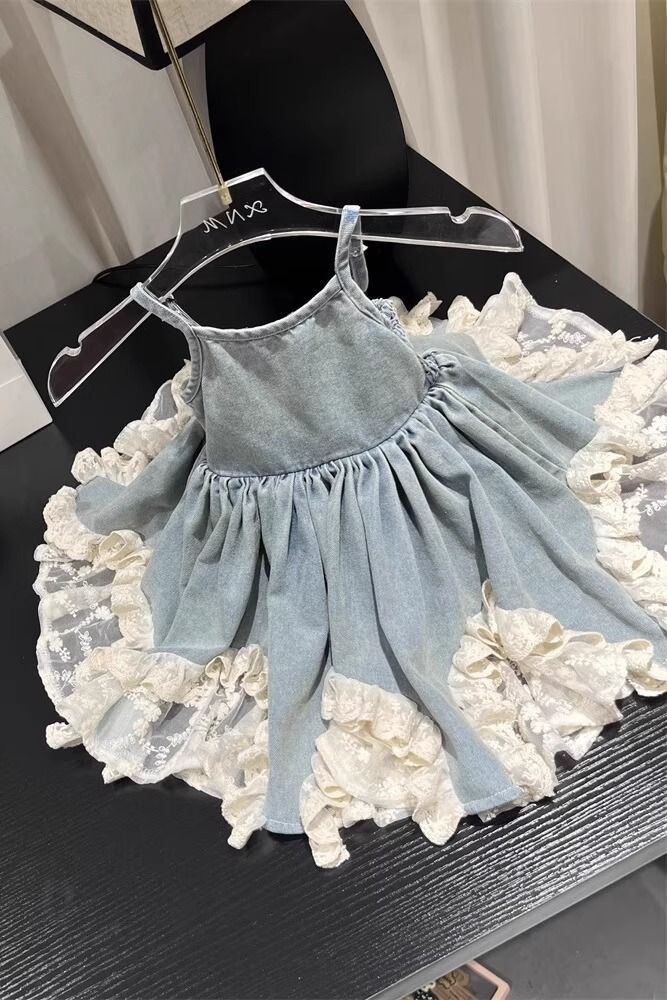 여자 2025 여름 새로운 스타일 복고풍 달콤한 패션 귀여운 다목적 데님 레이스 스플 라이스 공주 드레스
