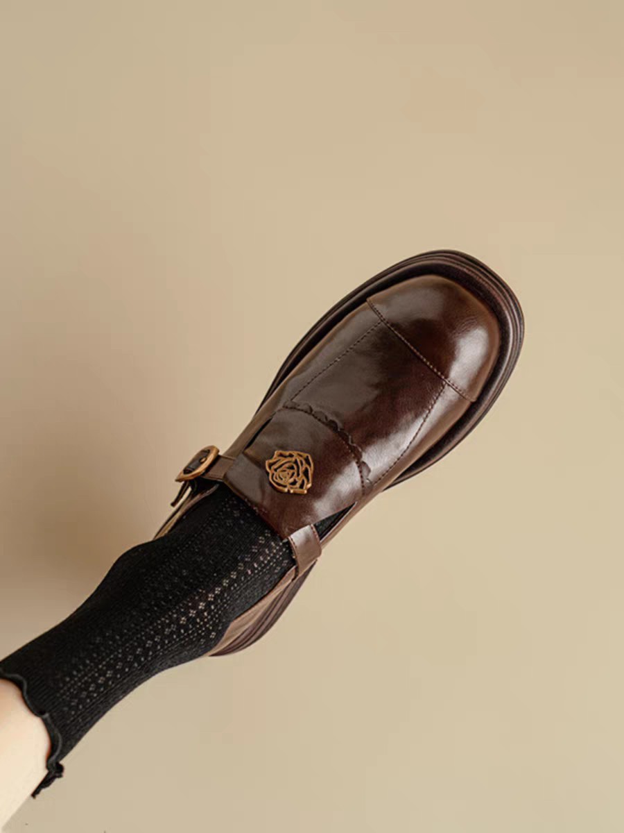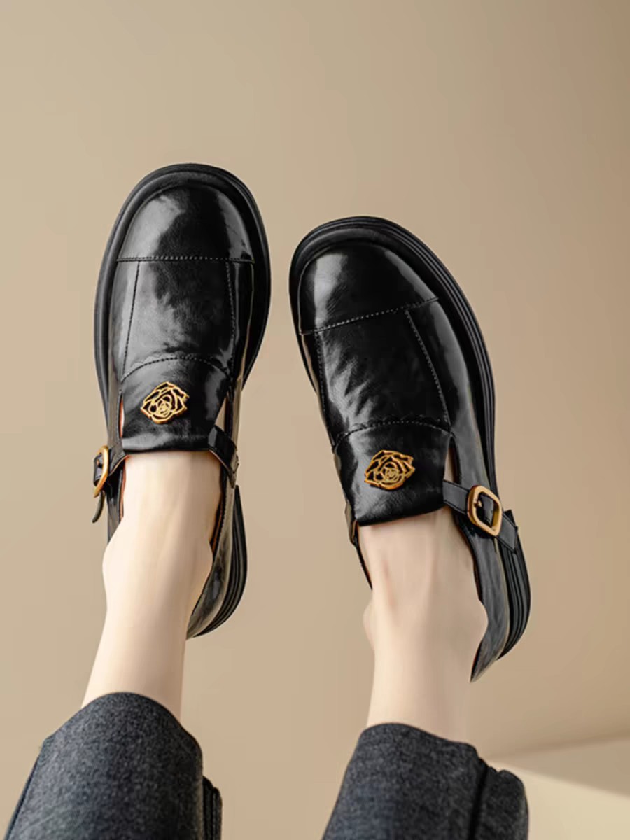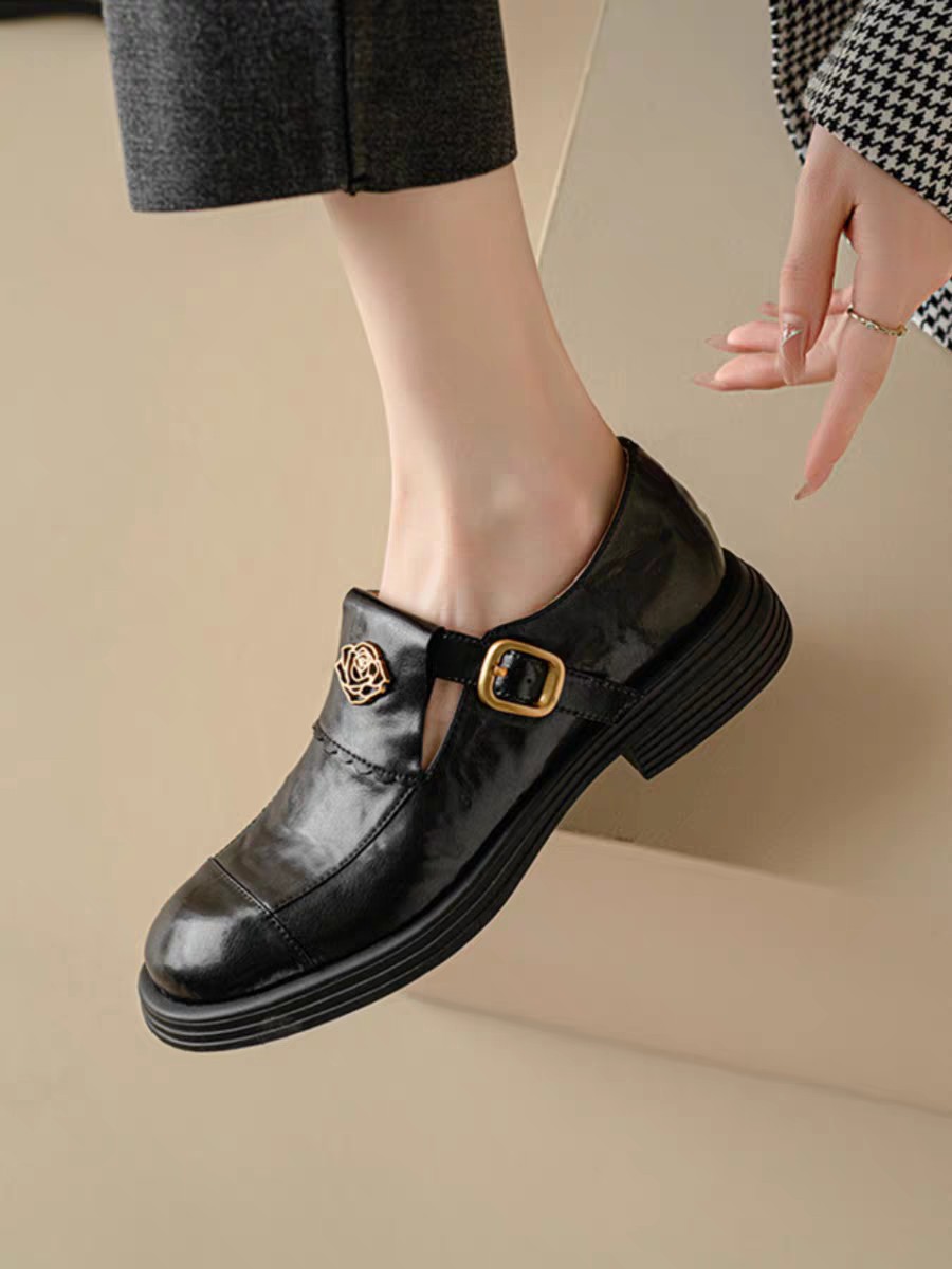 레트로 가죽신발 2024 가을 여성화 두꺼운 굽 낮은굽 딥컷 로우탑 슈즈 캐주얼하고 다용도로 활용 가능한 신발