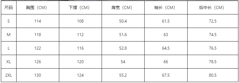尺码 胸围(CM) 下摆(CM) 肩宽(CM) 袖长(CM) 后中长(CM)