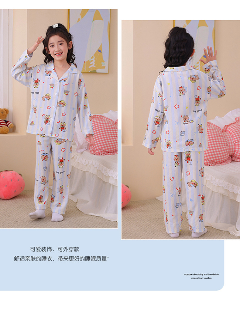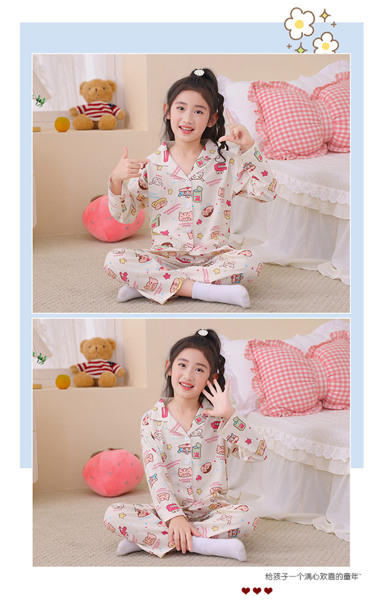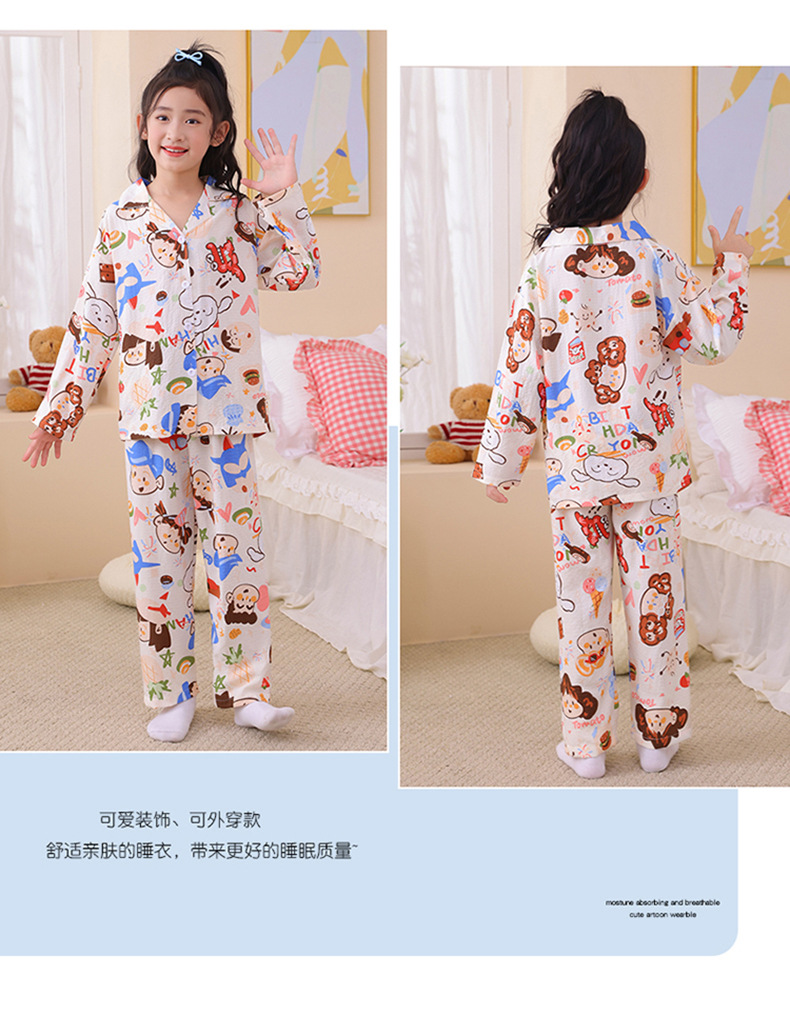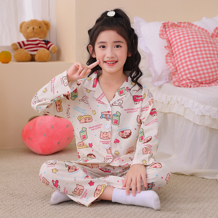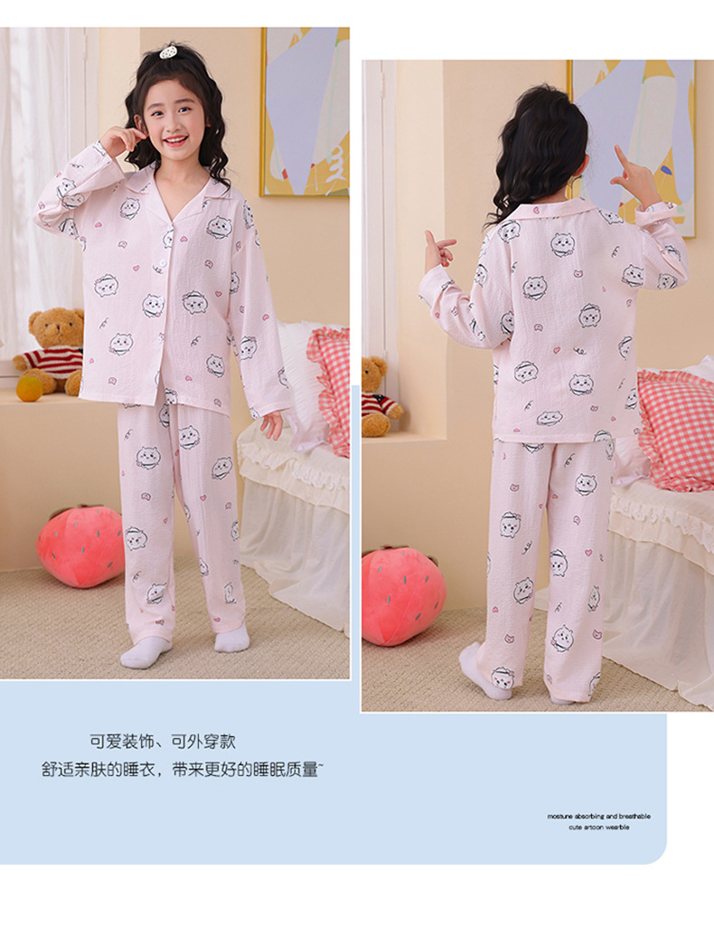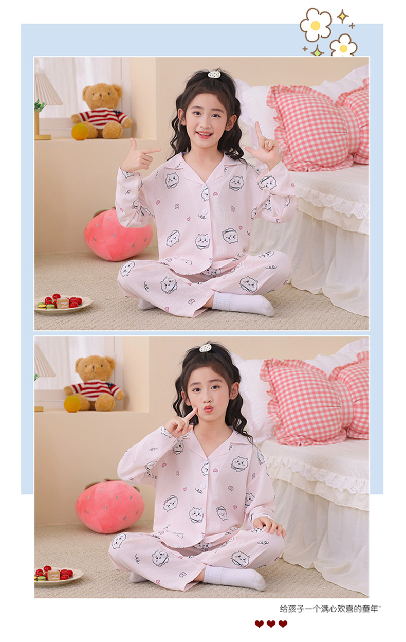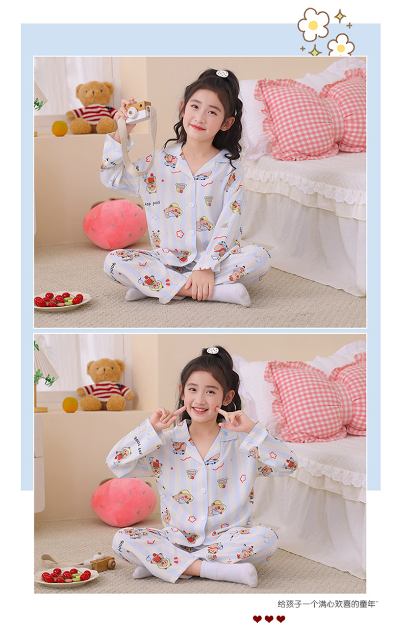한국 스타일 봄과 여름 새로운 어린이 만화 귀여운 잠옷 봄과 가을 버블 코튼 긴팔 소녀 홈웨어 세트