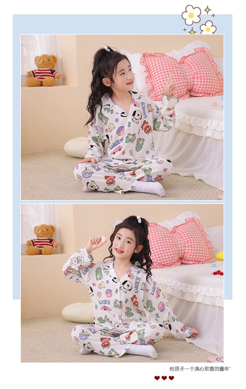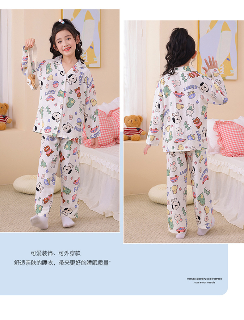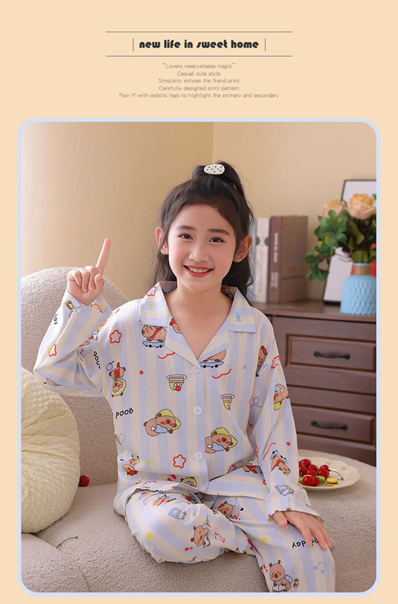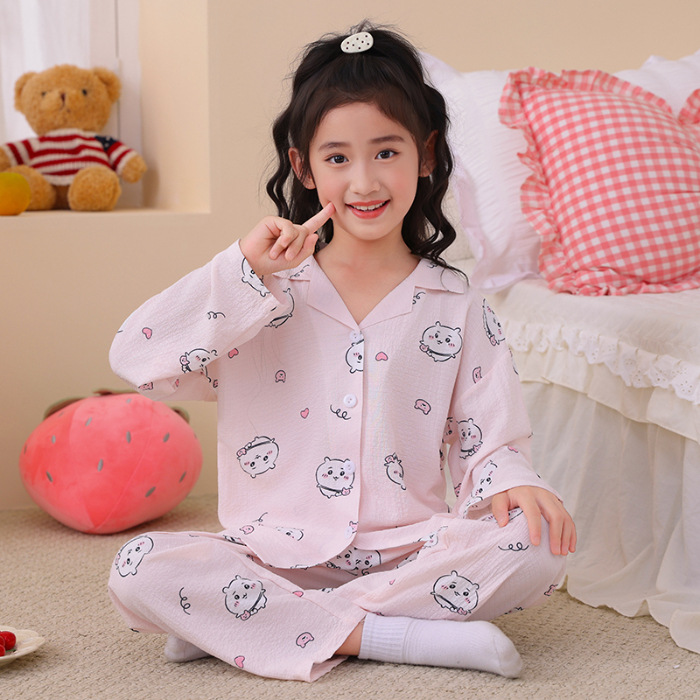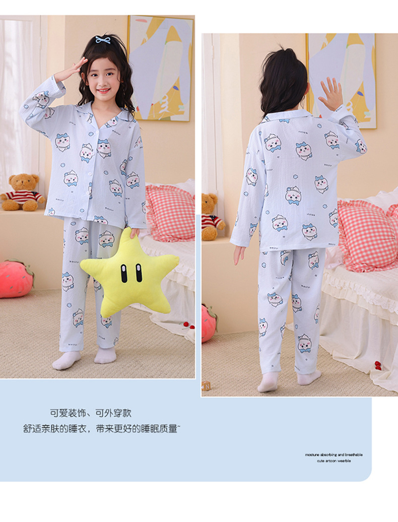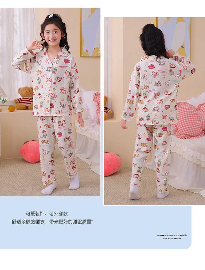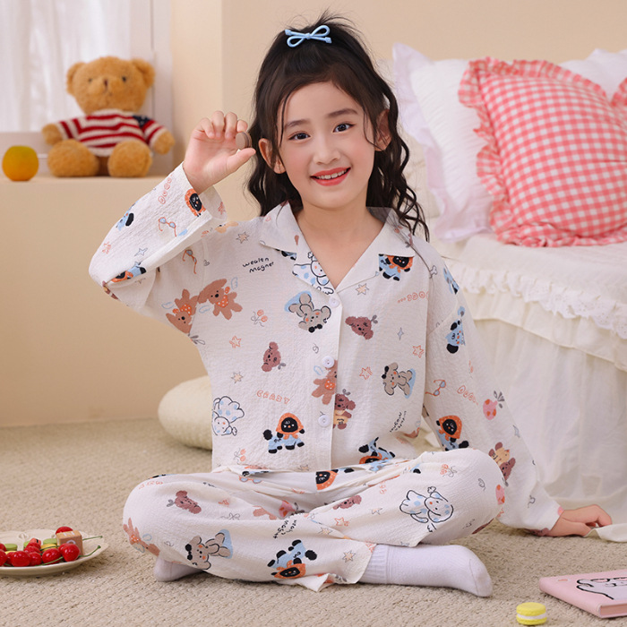 한국 스타일 봄과 여름 새로운 어린이 만화 귀여운 잠옷 봄과 가을 버블 코튼 긴팔 소녀 홈웨어 세트