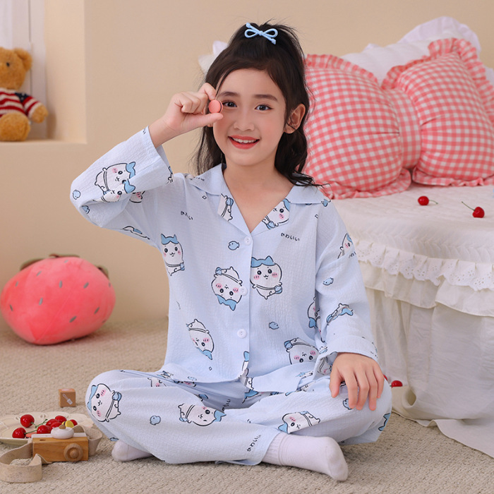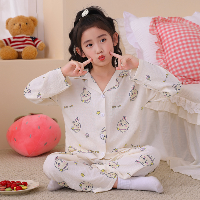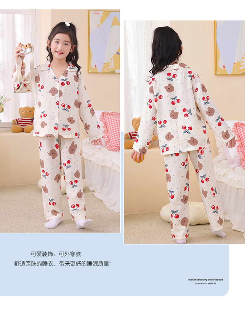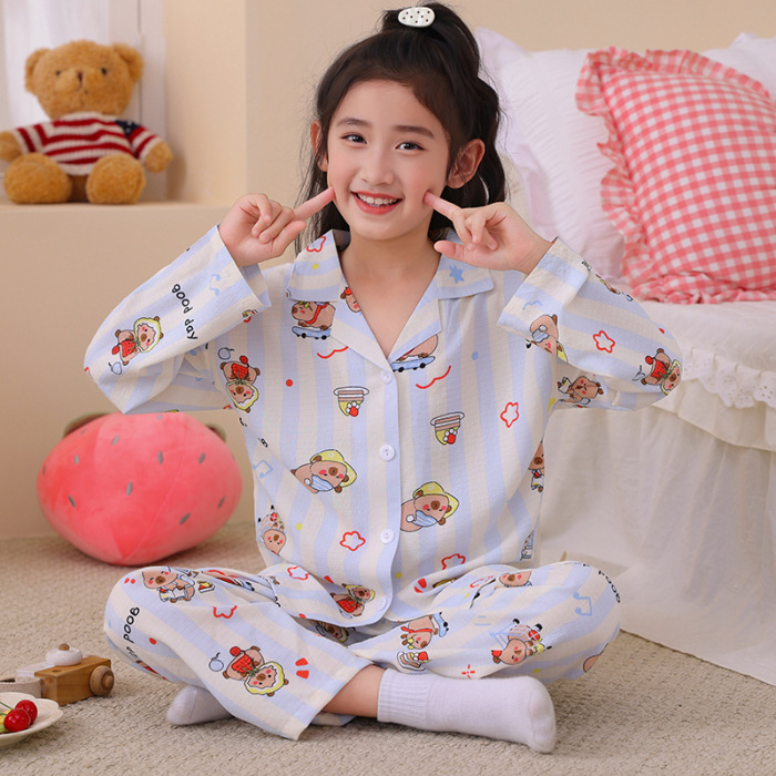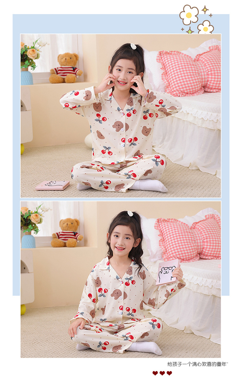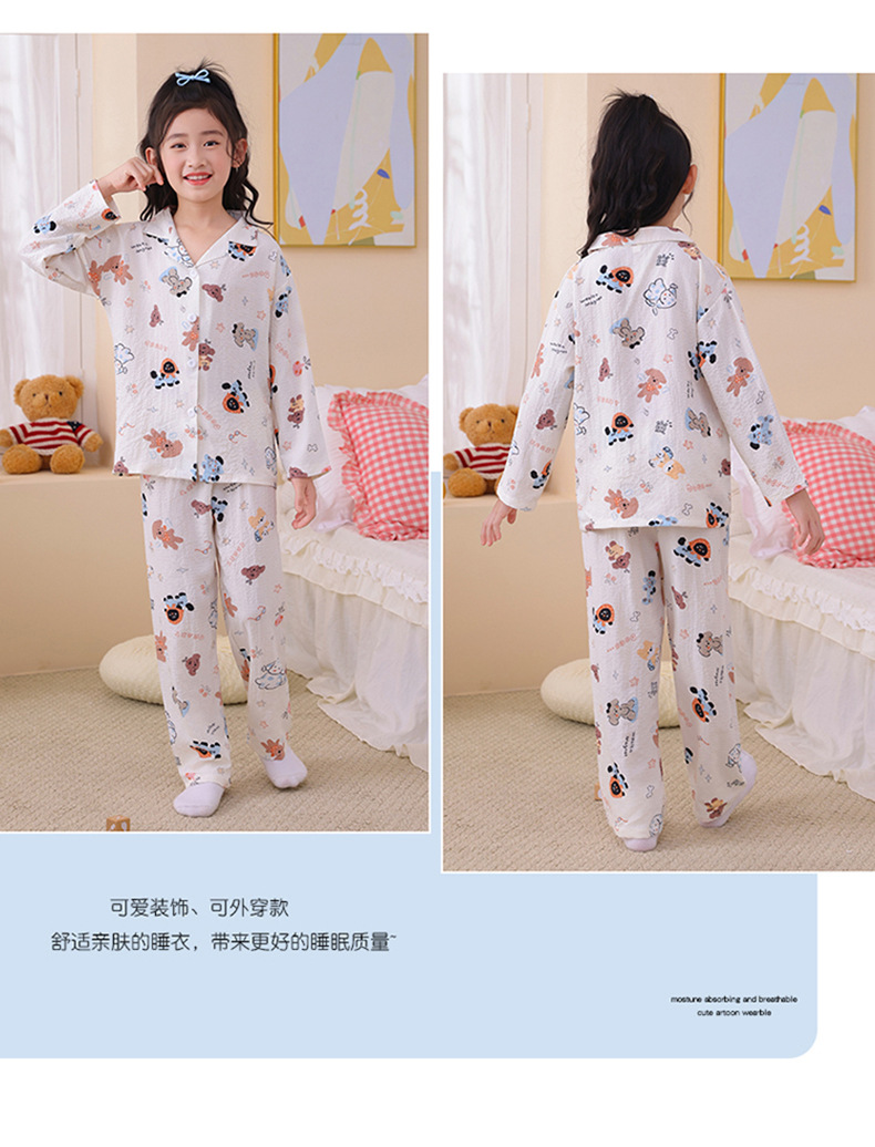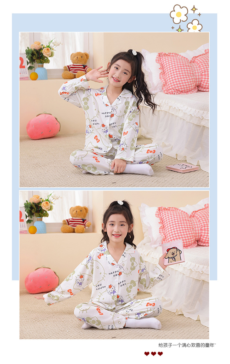 한국 스타일 봄과 여름 새로운 어린이 만화 귀여운 잠옷 봄과 가을 버블 코튼 긴팔 소녀 홈웨어 세트