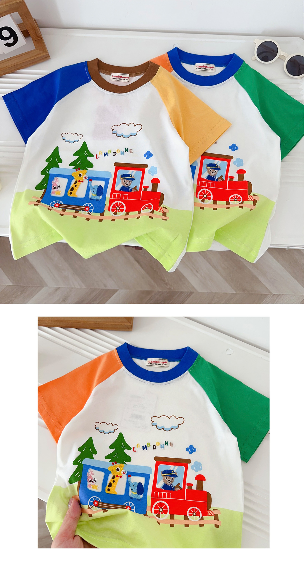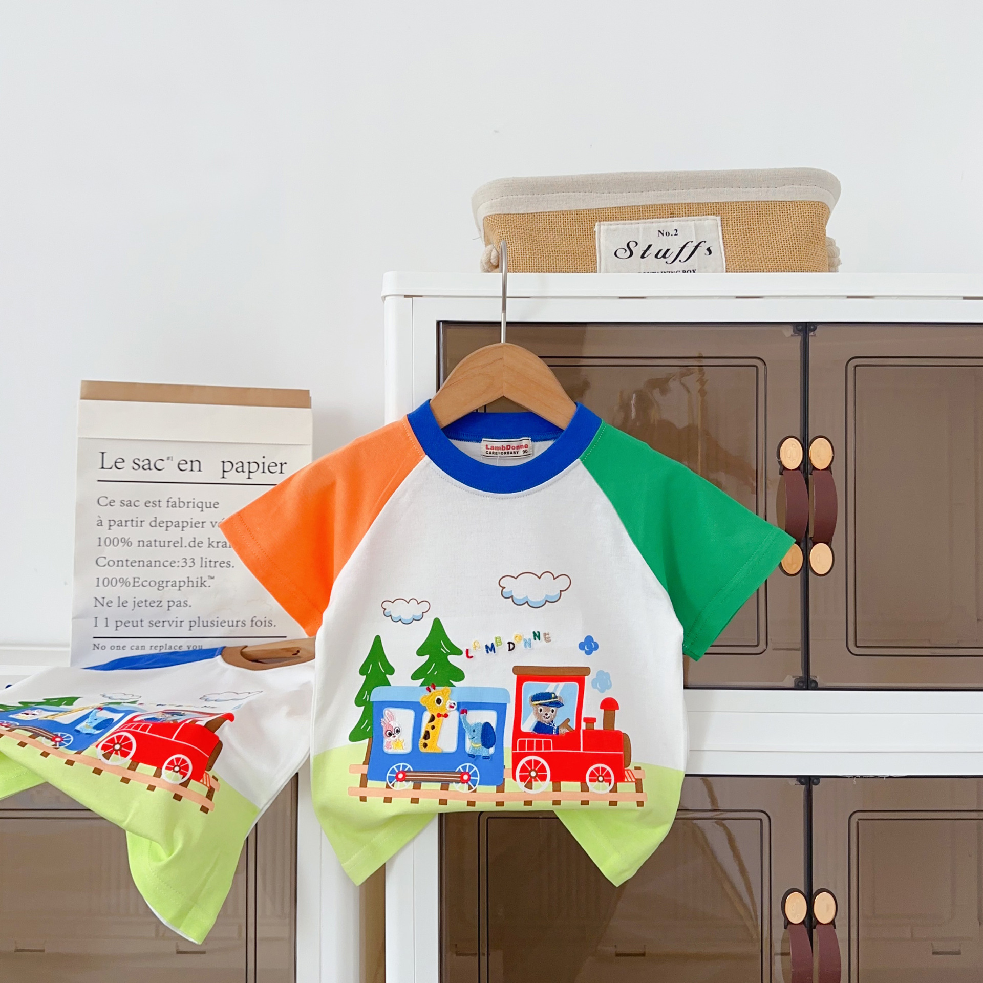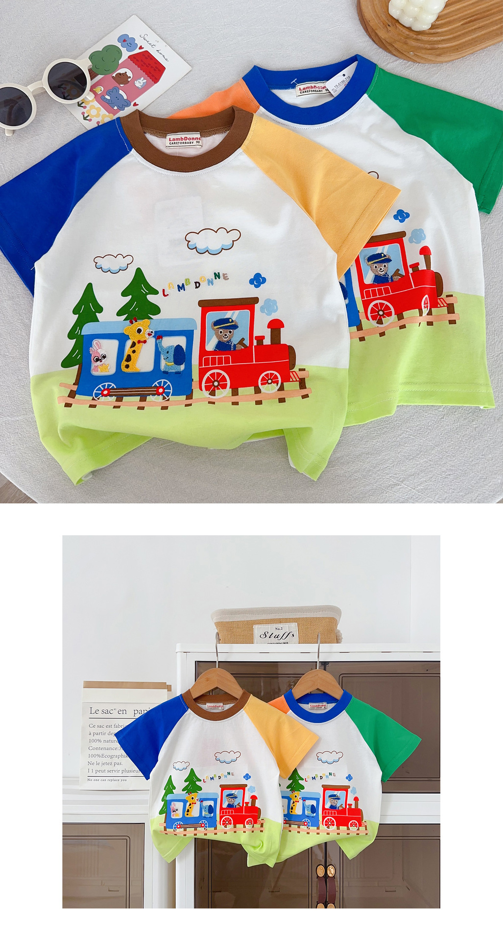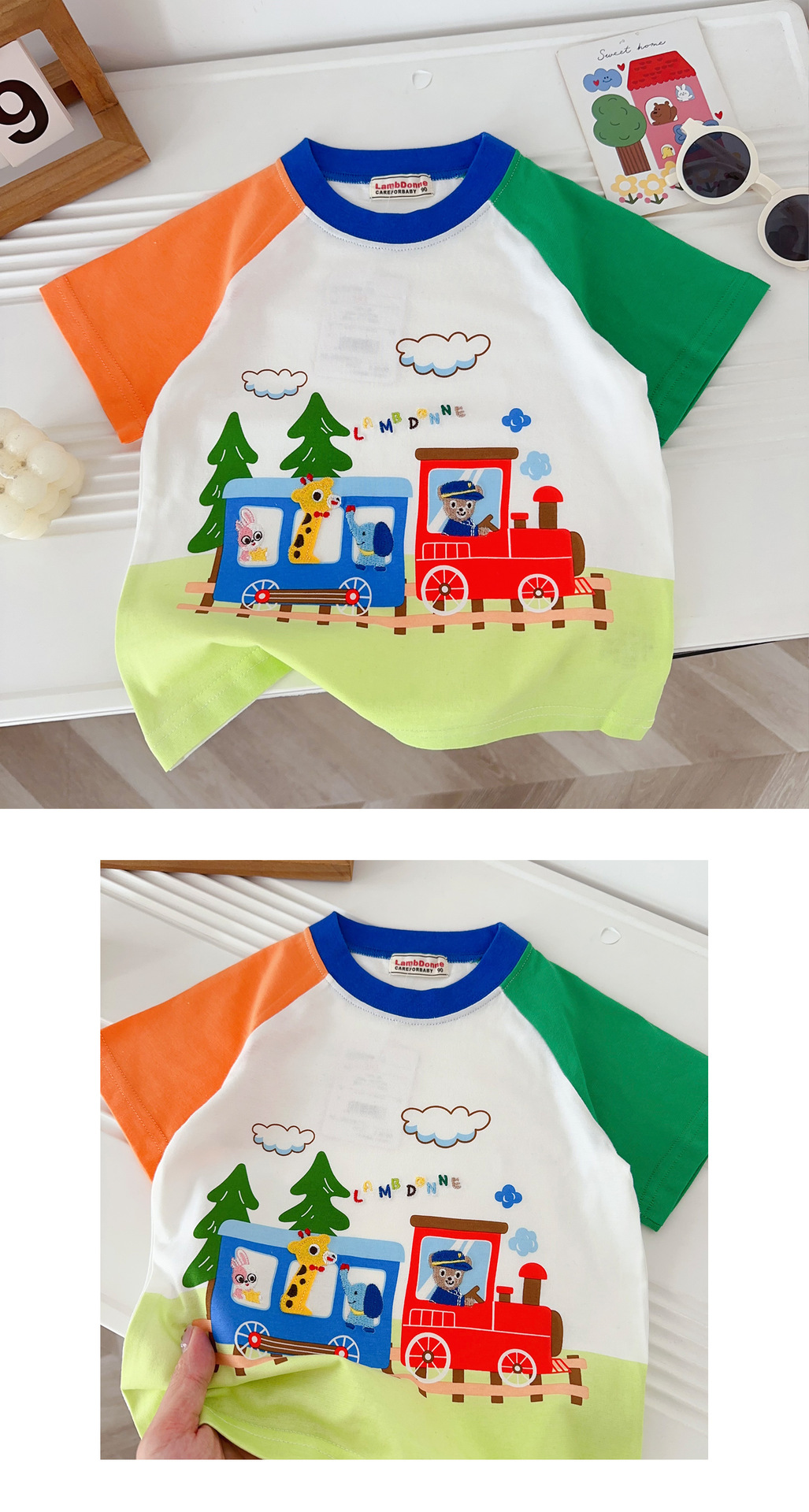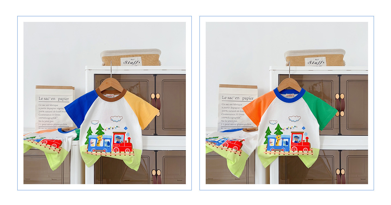 • 1604 열차 만화 반팔 주황색과 녹색 소매