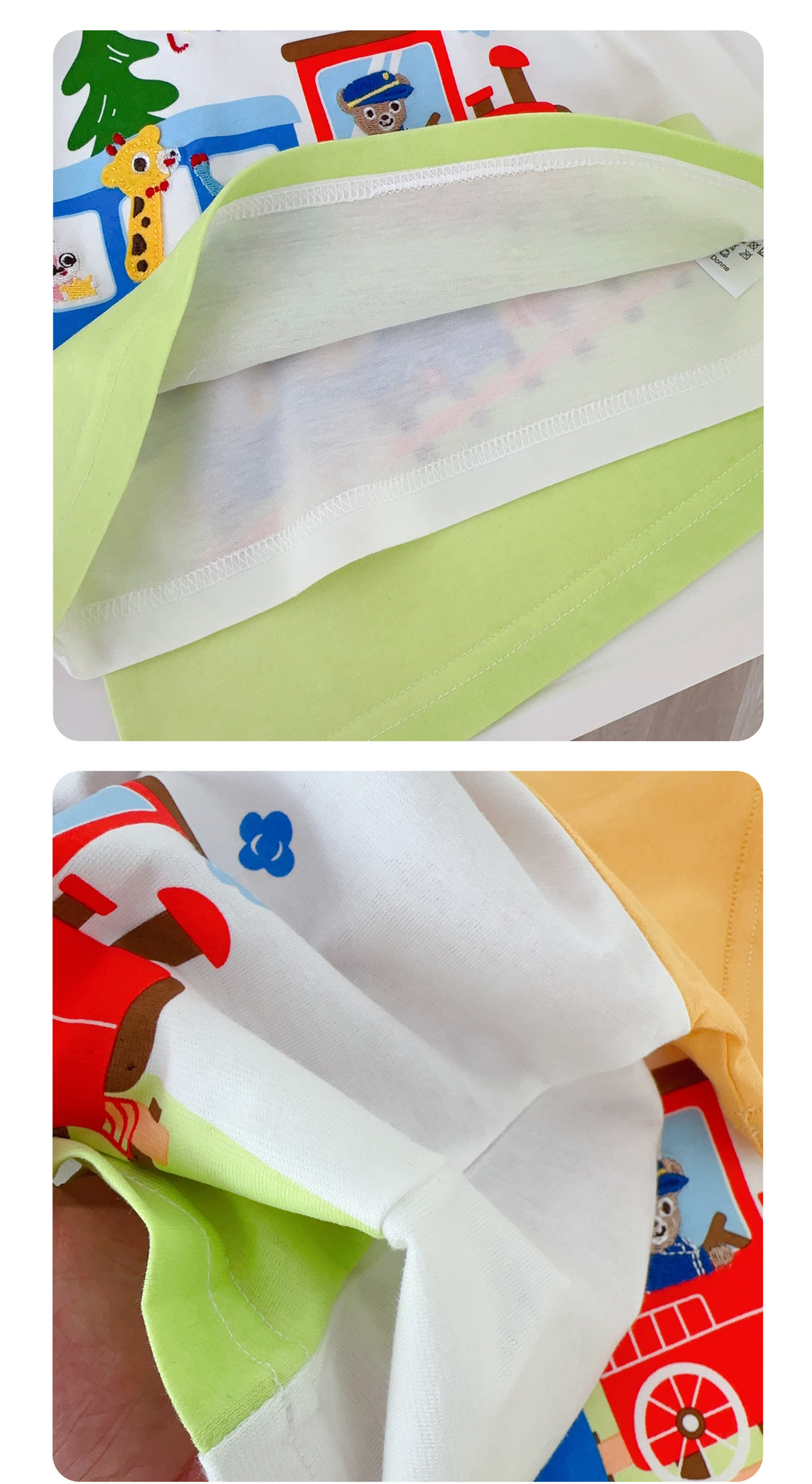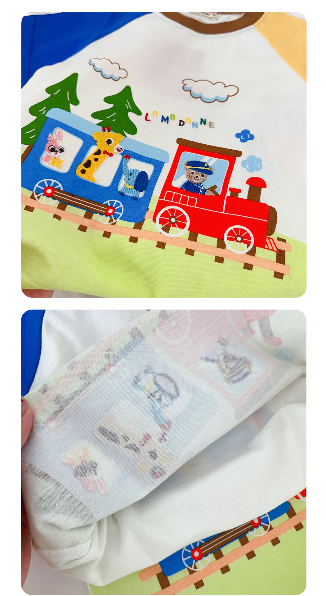• 1604 열차 만화 반팔 파란색과 노란색 소매