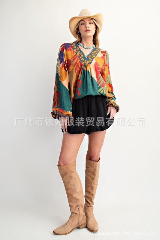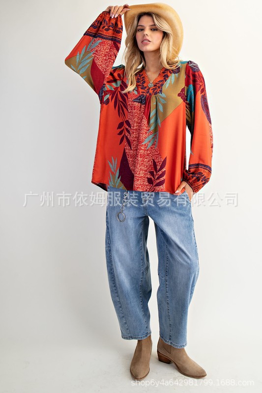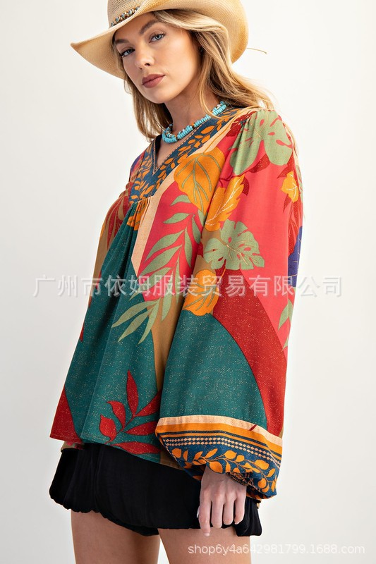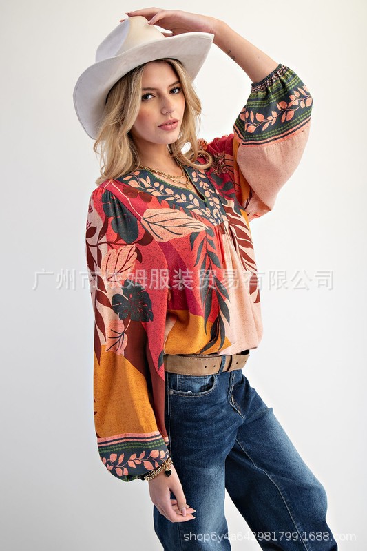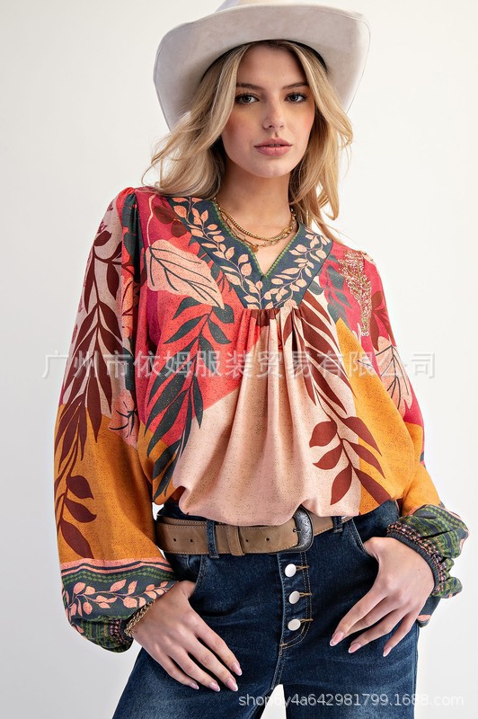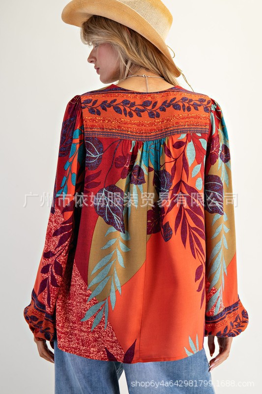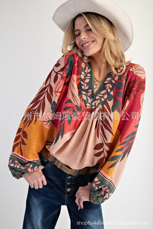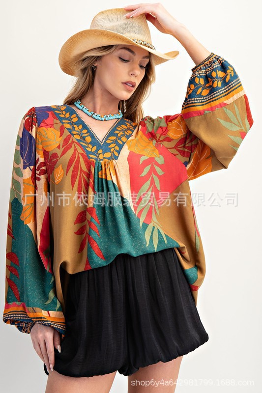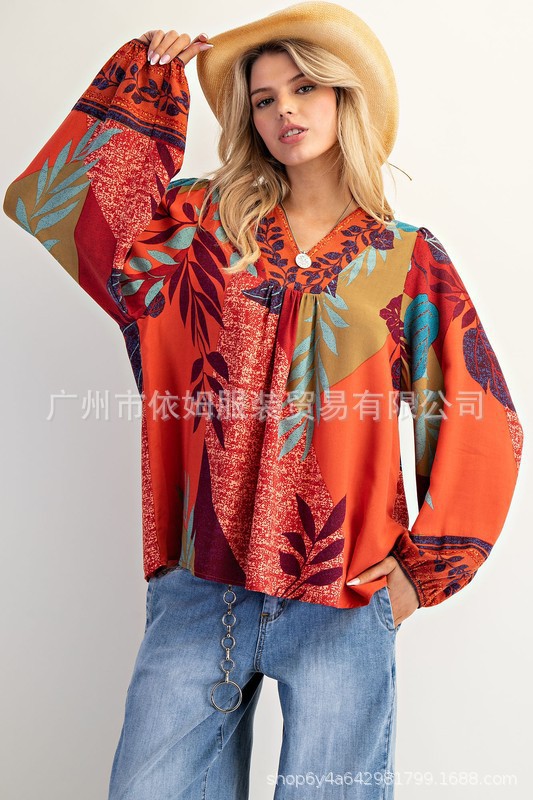 Amazon 25 가을 신작 크로스보더 유럽 및 미국 의류 프린트 여성용 V 넥 긴팔 셔츠 루즈 풀오버 탑