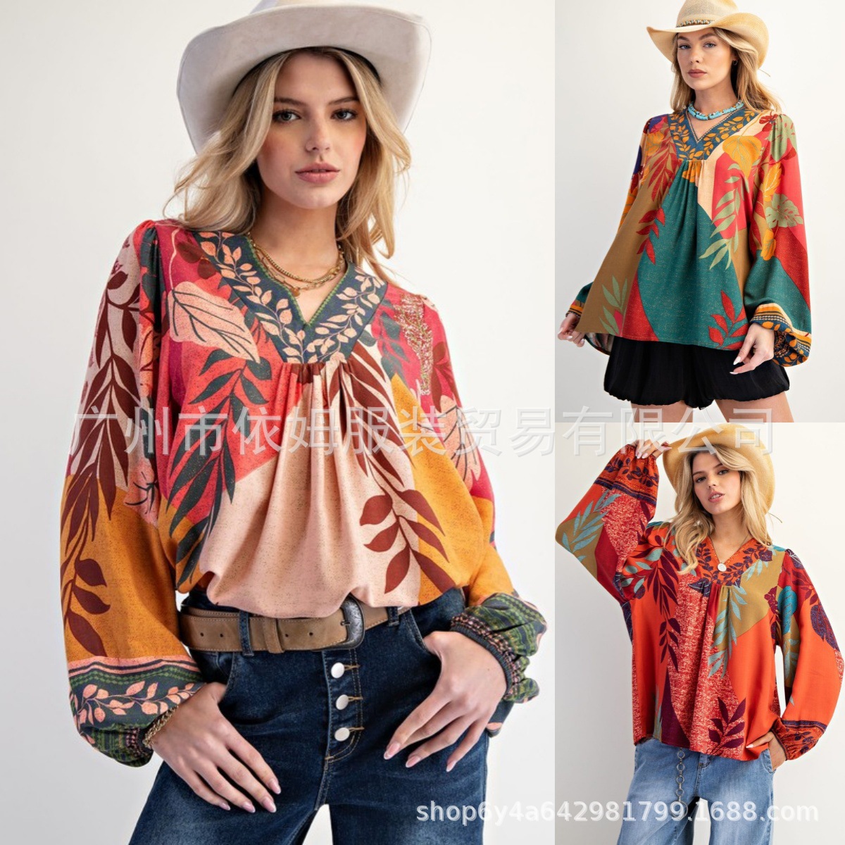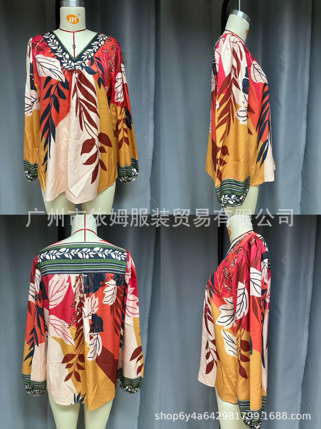 Amazon 25 가을 신작 크로스보더 유럽 및 미국 의류 프린트 여성용 V 넥 긴팔 셔츠 루즈 풀오버 탑스토어 가기