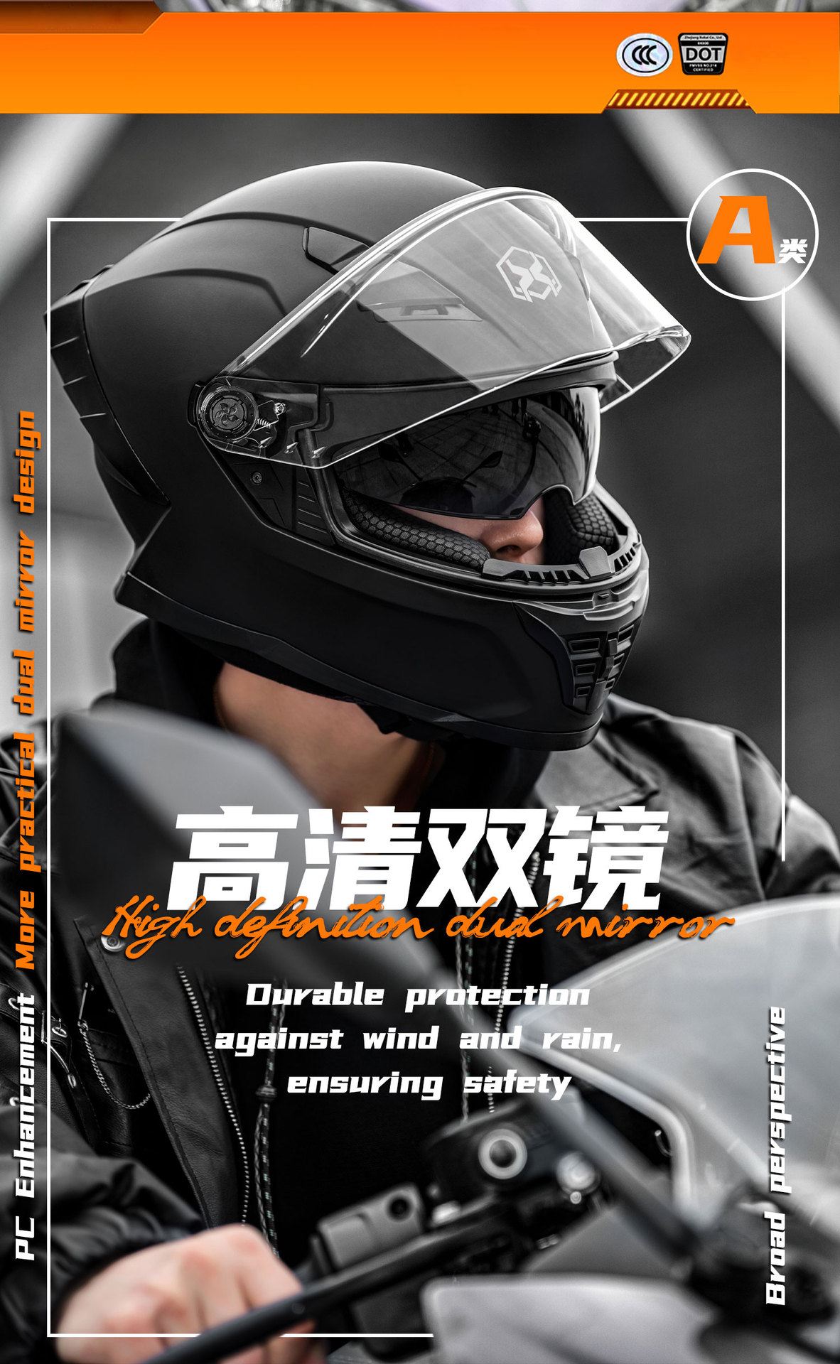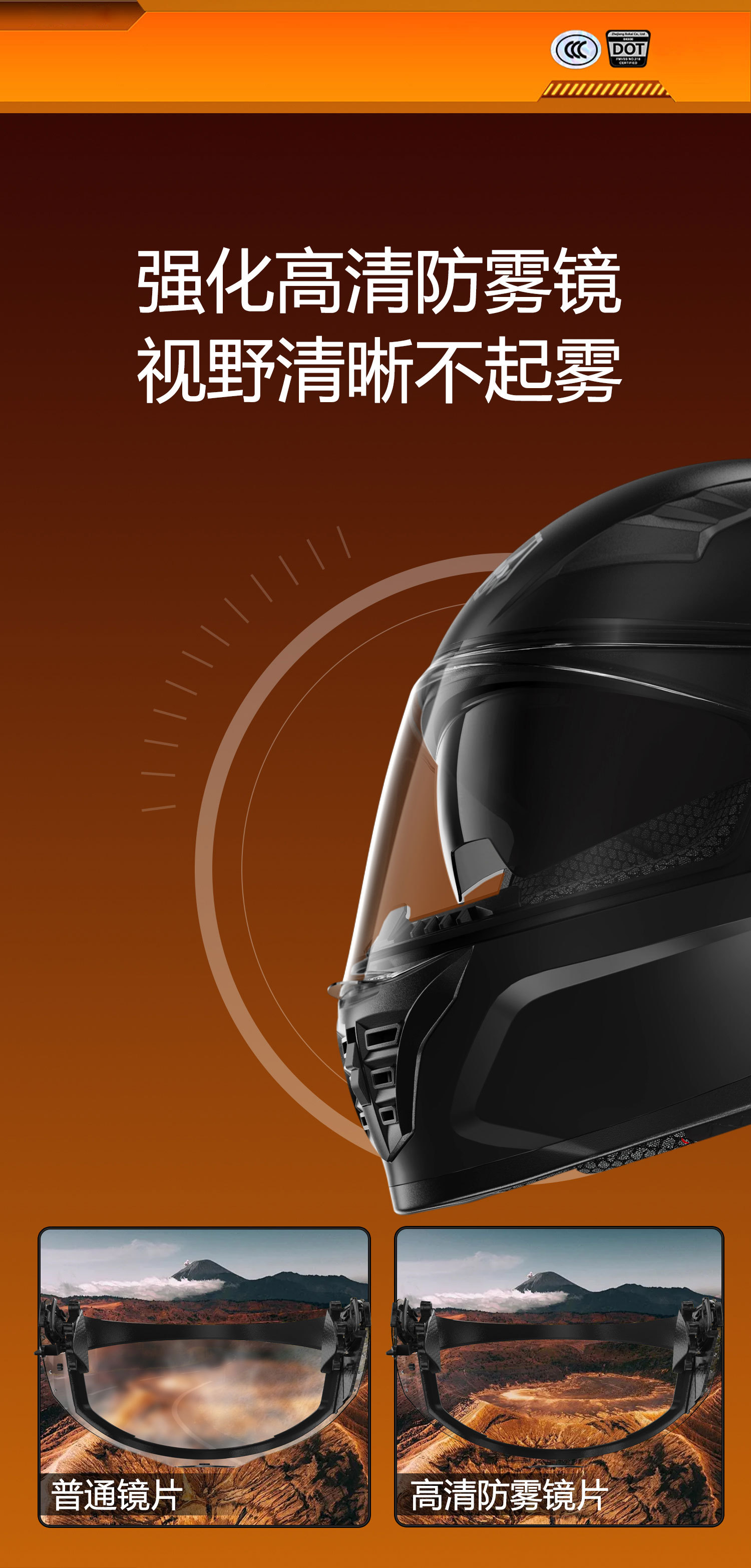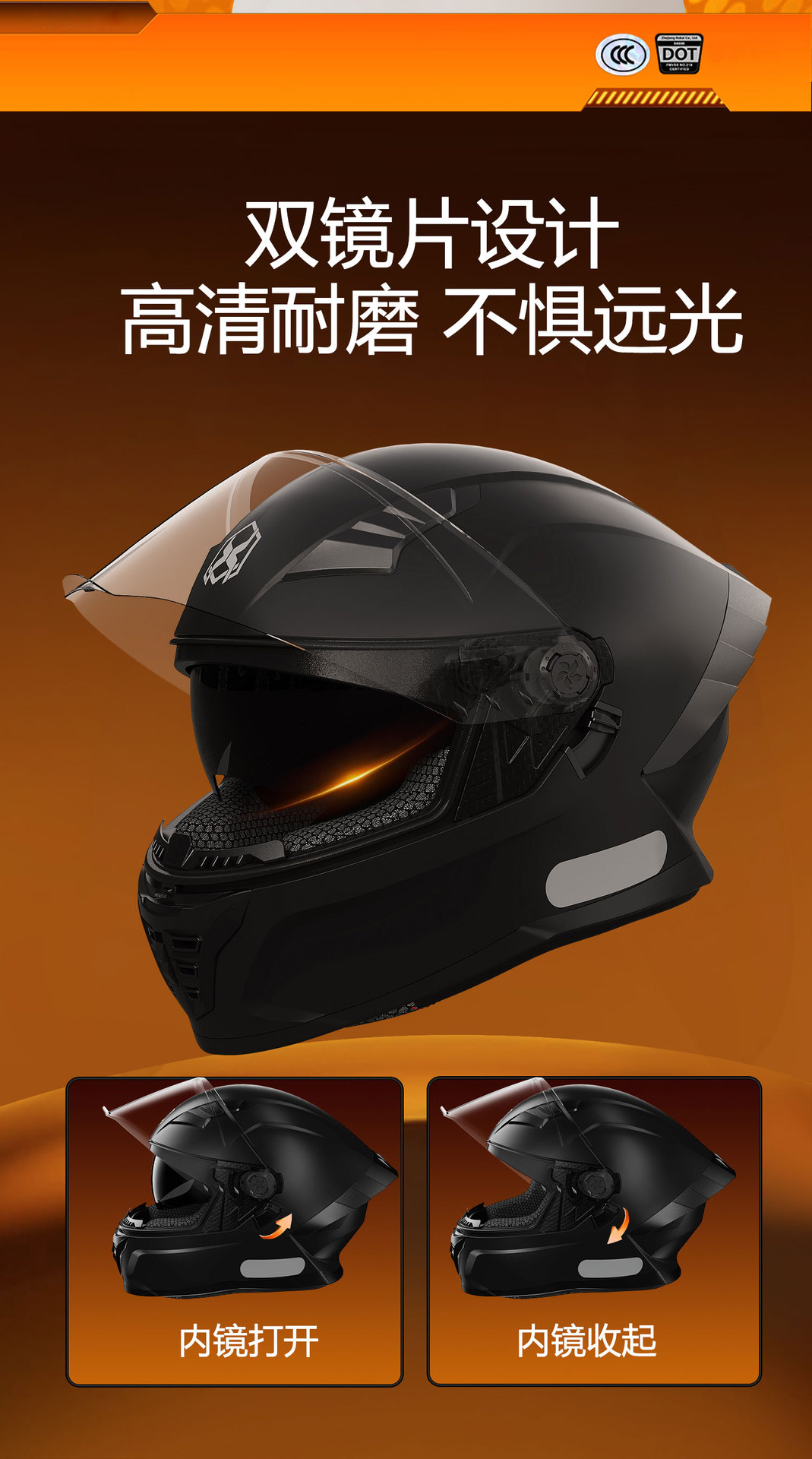 3.镜片:PC双镜片,外镜透明,内镜防晒。