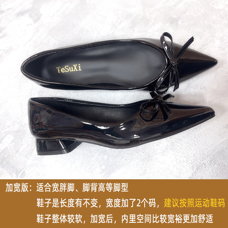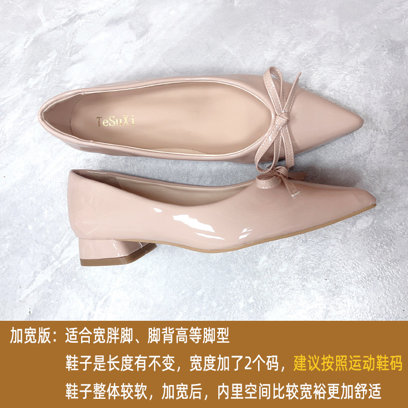 발이 두꺼워지고 넓어지는 플러스 사이즈 여성화, 발이 넓어지는 41~43 두꺼운 굽, 뾰족한 앞코 리본 싱글 슈즈, 통근 여성화, 크로스보더
