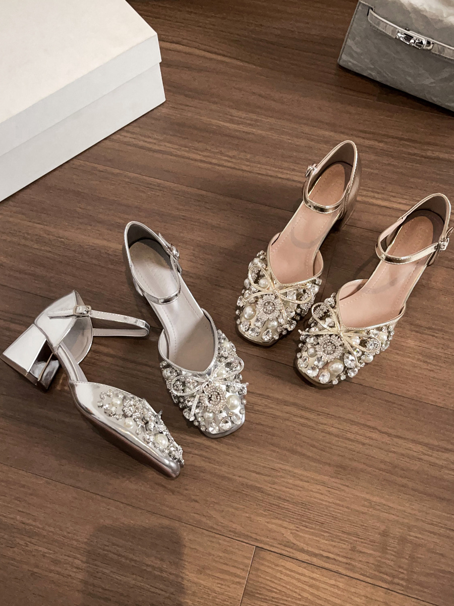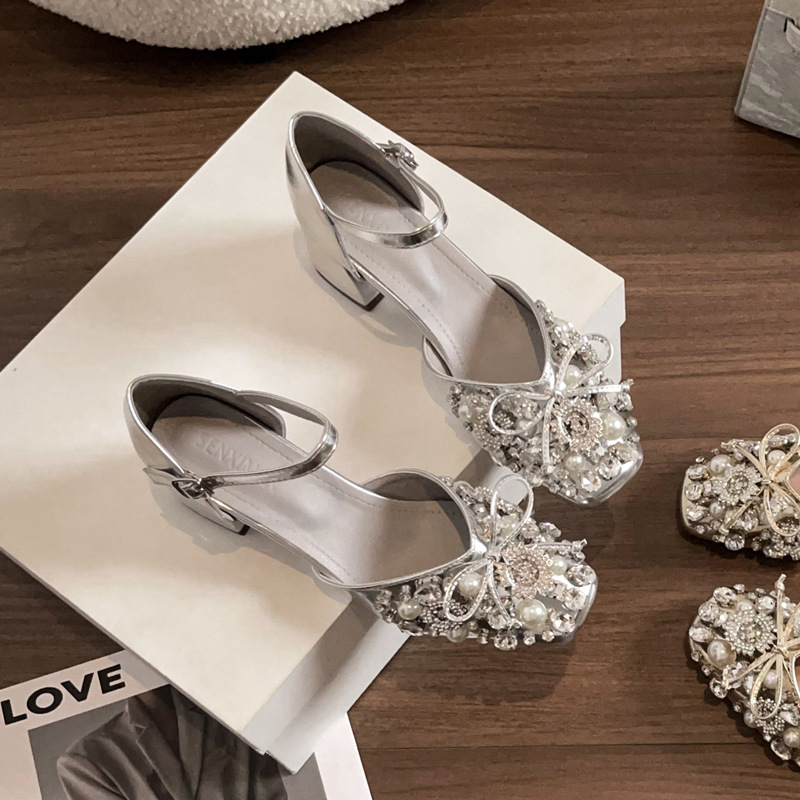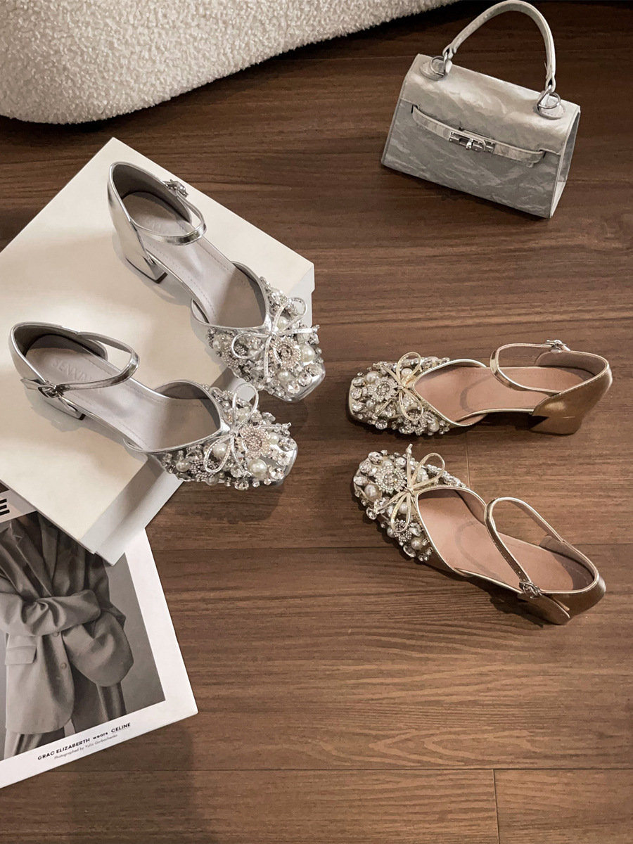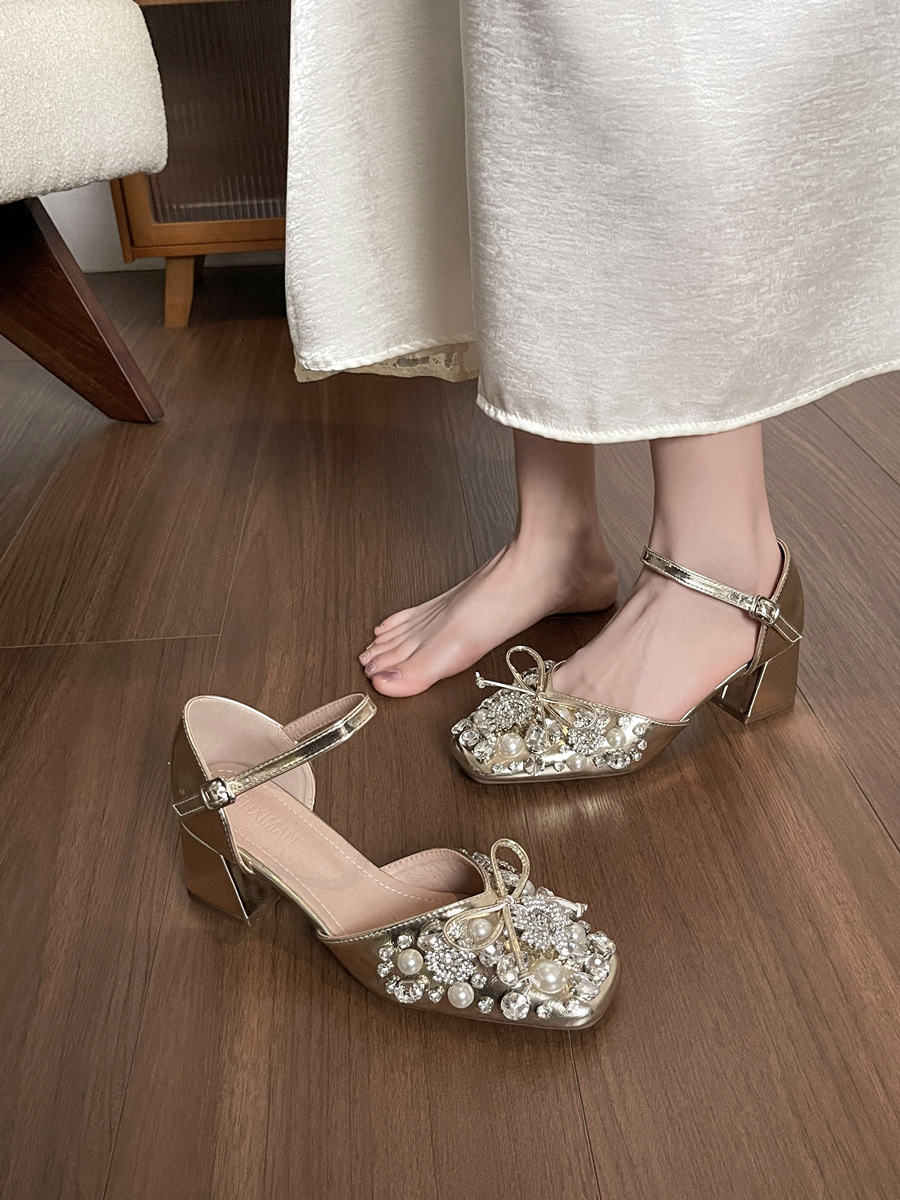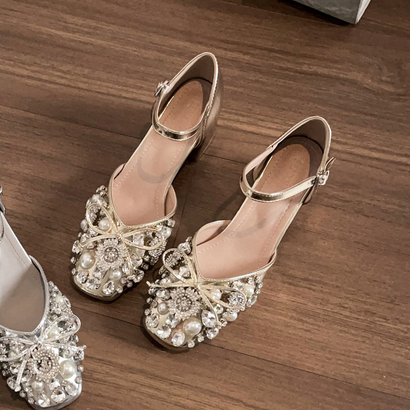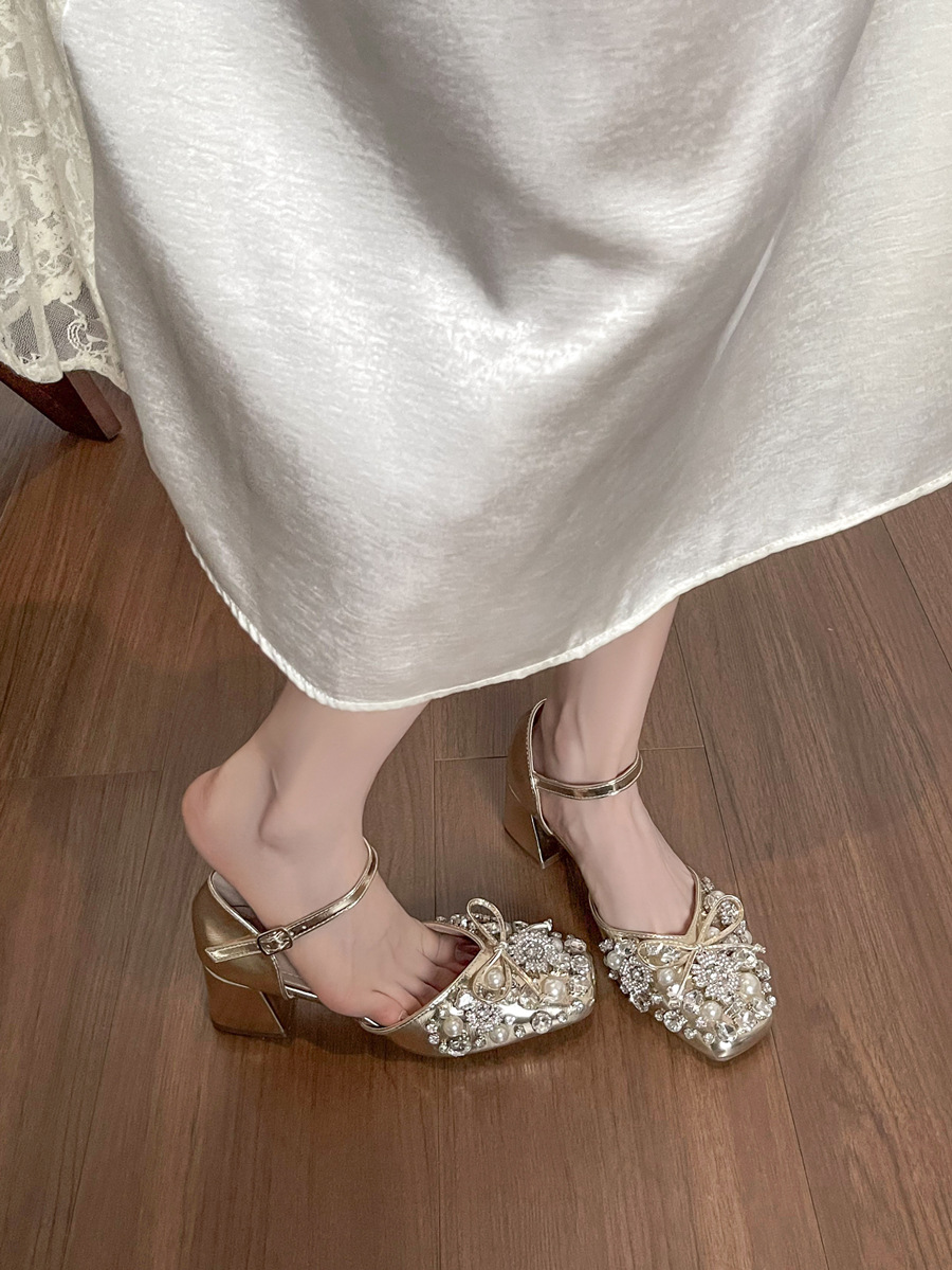 스커트와 버클이 달린 요정 스타일 중공 라인스톤 슈즈, 여성용 여름 두꺼운 굽 라인스톤 진주 하이힐스토어 가기