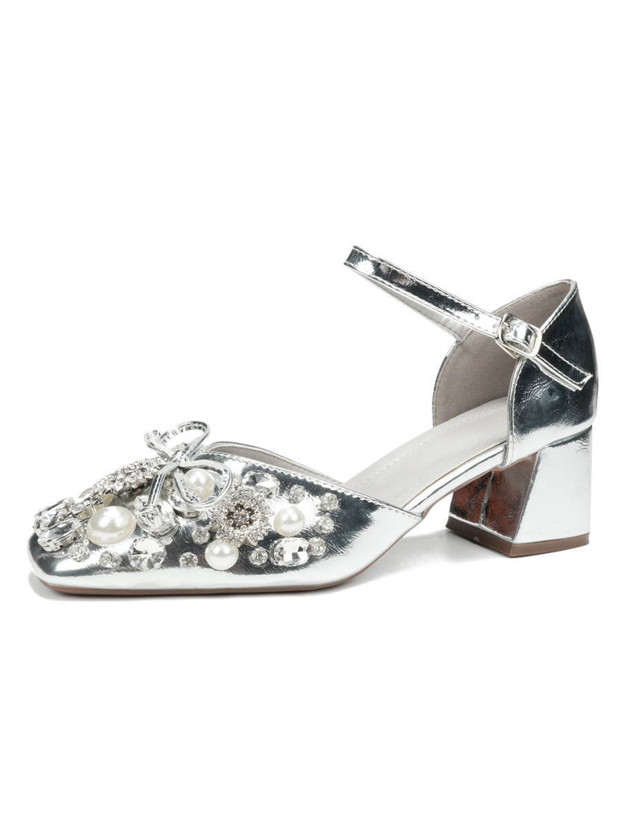 스커트와 버클이 달린 요정 스타일 중공 라인스톤 슈즈, 여성용 여름 두꺼운 굽 라인스톤 진주 하이힐